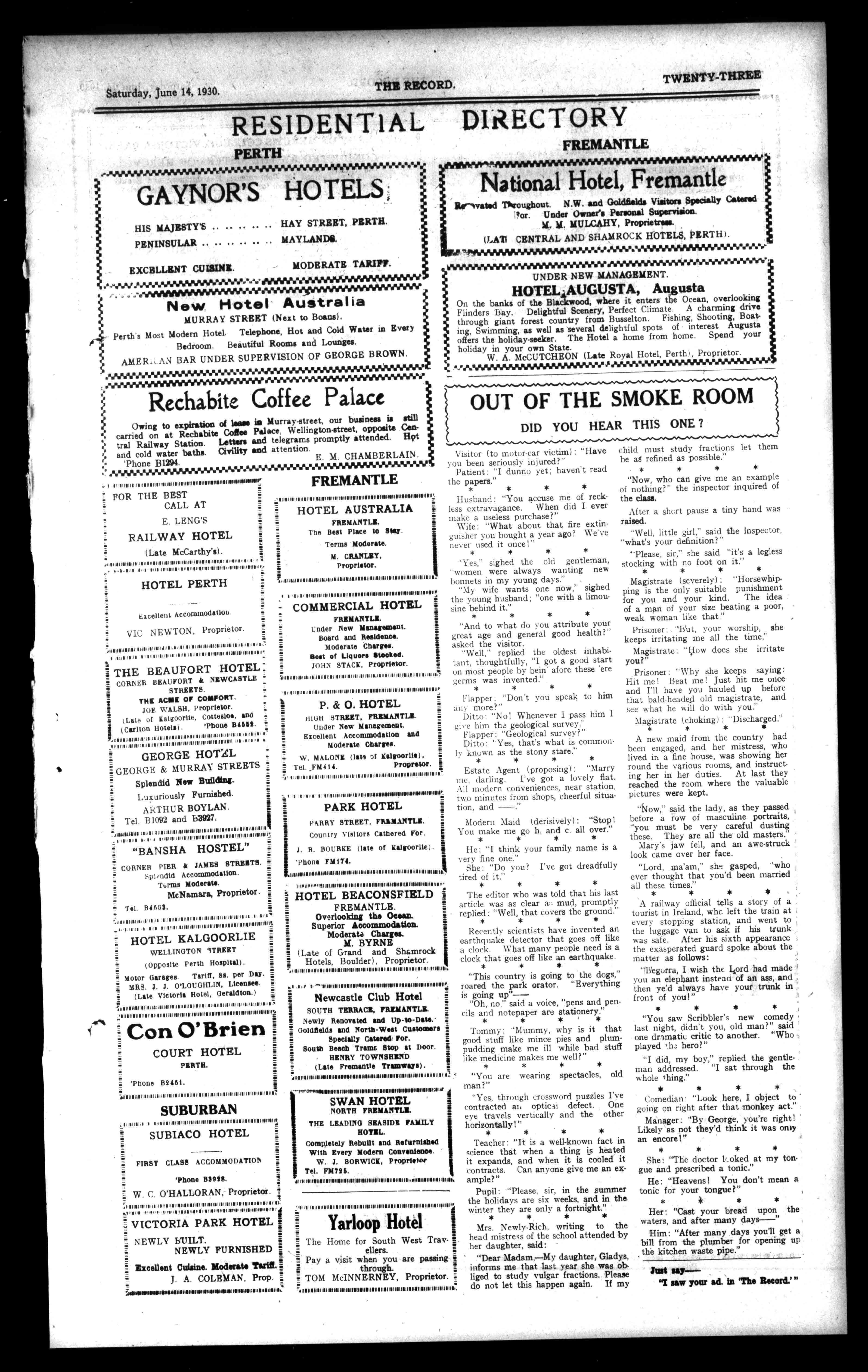 aFIRSTCLASSACCOMMODATION 'Phone511915. a W.C.O'HALLORAN,Proprietor. .44111141,11,4,44,16.41141111114111.14.114H21111111114,1,41, 4". 44,4.1i111P444.11,1114..14,11414.4.4-14 VICTORIAPARKHOTEL NEWLYh'UILT. NEWLYFURNISHED ExcellentCuisine.ModerateTariff.: J.A.COLEMAN,Prop.t fmaisusamsssiasssIssossisssissss,,ssess.susssussci' FREMANTLE OUVIWOWIHSWOMMOIMIHOINOWIlfillifUlHOHONIMIII; = T HOTELAUSTRALIA i-. FREMANTLE. TheBestPlacetoStay. N. CFLAN Proprietor. TermsModerate. ILIHSViii1.1140011111310111114111111111111111141131111111111111111,16 ,,,Ainlu.111101HIIIIHOH1111111111.1H2Olni.408119.1.! COMMERCIALHOTEL FREMANTLE. UnderNewManagement. BoardandResidence. ModerateCharges. 2 BeatofLiquorsCooked. JOHNSTACK,Proprietor. ihumeseueesusounieletesueniesmuleelemaepolvidoeuf!. 11,1111111,1801i411111111.1.111111111111111111,1111411,111011111111H, P.&0.HOTEL muttSTREET,FREMANTLE. UnderNewManagement. ExcellentAccommodationand g ModerateCharges. W.MALONE(latiofKalgoorlie), = Tel..FM41I. Propretor.5 7a-i 4iliii ill111111141111111,4111111,1114111111111111111111111111411e. I iiiiiifilllimin9.1P111108,1141111111111111911141,141.111L PARKHOTEL PARRYSTREET,FREMANTLE. CountryvisitorsCatheredFor, J.R.BOURKE(lateofKalgoorlie) 'PhoneFM174. alusesususesessmionsimeilsesusofesususesueutesull HOTELBEACONSFIELDI FREMANTLE. 6: OverlookingtheOcean. a SuperiorAccommodation. ii ModeratoCharges. I M.BYRNE (LateofGrandandShamrock 3 Hotels,Boulder),Proprietor. :,,s,issIsssmississossissmisssiisistssisilnii,s,srinsiat,