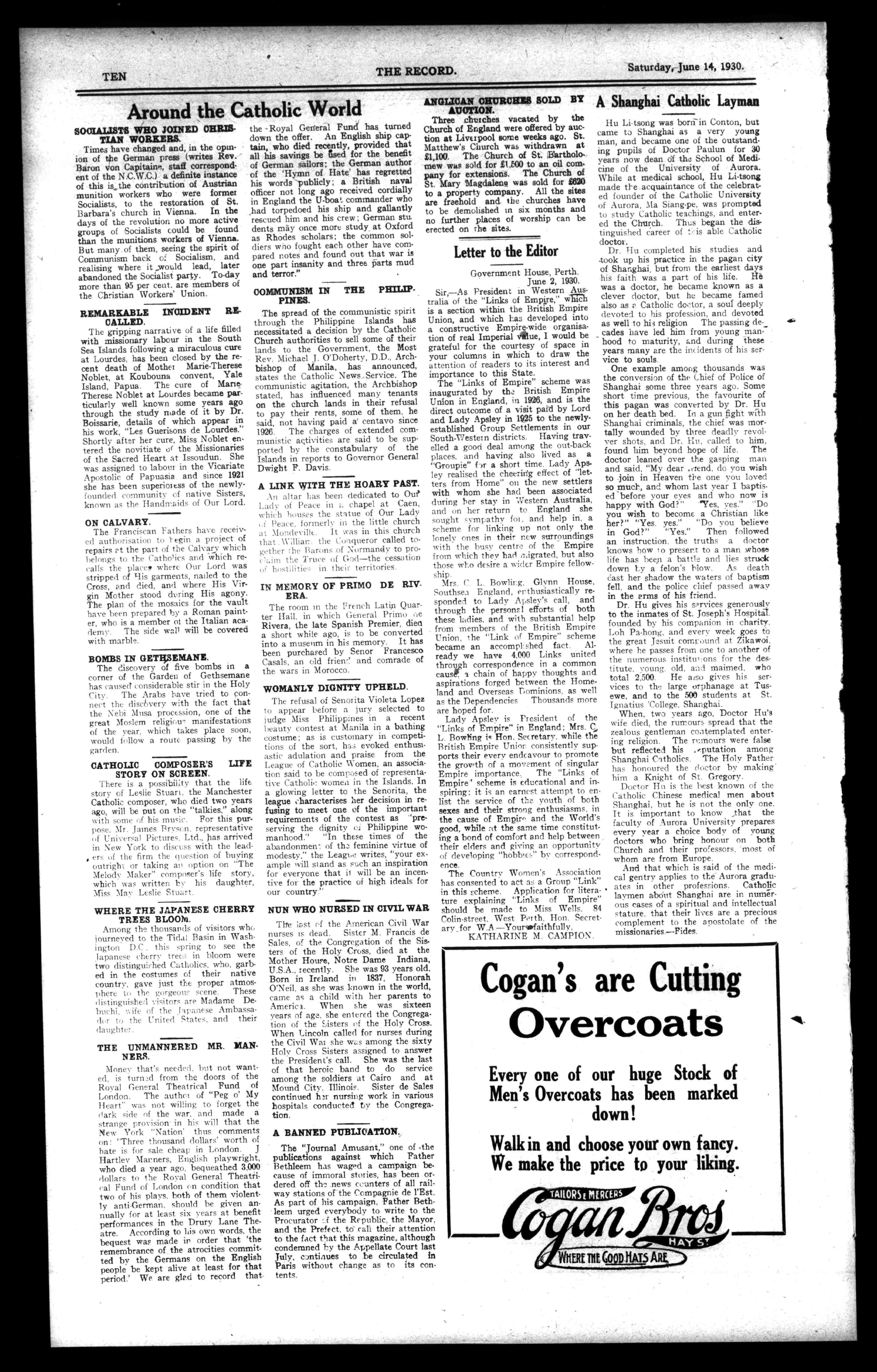 Dacca(Bengal,India).-Warmly welcomedbycivilauthorities,twoCatholicMedicalMissionariesfromWashington,D.C.,SisterM.Laetetiaand SisterHelen,openedamaternitycentreinthecityofDacca,Bengal,India, onMarch15.Thenewenterpriseis undertheauspicesoftheDaccaMaternityandChildWelfarework,and besidesactualmaternitycases,will supervisetheregistrationandtraining ofmid-wives.OfficialsofMymensingh, acity75milesnorthofDacca,have madeproposalsanddesirableland offersforasimilarestablishment.The presentbirth-rateforDaccaisapproximately4,000vperyear.TheSocietyofCatholicMedicalMissionaries wasfoundedundertheapprovalofHis GraceArchbishopCurley,ofBaltimore,in1925 Besidesthecentrein Dacca,thesocietyhasalsoahospital inRawalpindi,India.. OuterWorldBrevities. Suifu(Szechwan,China).-Atragic panic,resultinginthedeathof53 people,occurredduringthefreedistributionofricetothepoorbythe ChamberofCommerceofTsepliu-tsing, Szechwan,China.Thefewpolicetryingtokeeporderinthecrowdof 20,000firedshotsintheairtocalm afewdisorderlypeasants.Atonce thepanicensued.Fifty-three,mostlywomenandchildren,weretrampled todeath,andhundredswounded.One victimwasaCatholicgirlof13. Cawaci(FijiIslands,Oceania).-A formerleperhasenteredtheCatholic TrainingSchoolforCatechistsatCawaci,FijiIslands,Oceania.Sentto theLeperAsylumontheislandof Makogaiseventeenyearsago,hewas