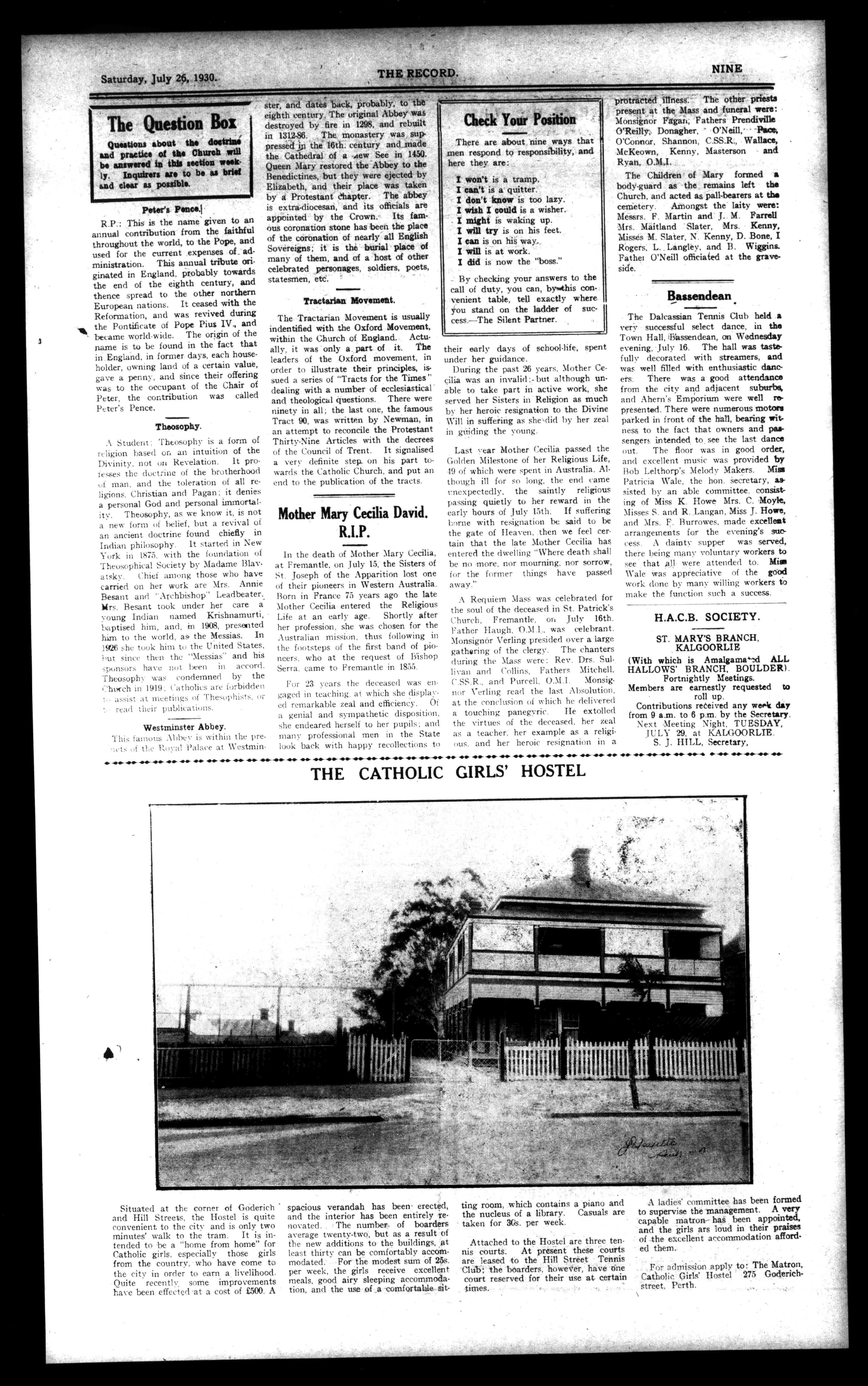 BYTHEMARISTBROTHERS. FORTERMSANDFULLPARTICULARS,APPLYTO THEBROTHERPRINCIPAL. BREWEDUNDERSPECIALCONDITIONS. E.DPALE ALE ASKFORGOLDLABEL. BREWEDANDBOTTLEDBYTHEEMUBREWERYLTD.,PERTH BOWRA O'DEA,Asdertakers GENERALFUNERALFURNISHERS. MOTORVEHICLES. FUNERALSCONDUCTEDINANYPARTOFTHESTATE. NotetheAddress:195PIERSTREET,PERTH. 'Phone,114308;Private'Phones:B2938andB3376. OURLADYOFMERCY'SCOLLEGE,VICTORIAPARK. CONDUCTEDBYTHESISTERSOFMERCY. LocationUnsurpassedforConvenience,Healthfulness,andBeauty. BoardingandDaySchoolfoeYoungLadiesandLittleGirls. ForParticularsApplytotheMotherSuperior. THECOLONIALMUTUALFIREINSURANCE COMPANYLIMITED. FIRE,MARINE,ACCIDENT,WORKERS'COMPENSATION EMPLOYERS'LIABILITY. HAYSTACKS,GROWINGCROPS,ANDLIVESTOCK ASPECIALTY. W.L.CARTER,Manager. BARRACKSTREET,PERTH. AppositionsInvitedforAgenciesinDistrictsWhereNotAlready Represented. IFYOUCAN'TGET SwanBitter Whereyougo GowhereyouCANgetit! AskforSWANBITTER onDraught KellyandRodoreda LateofJohnDynon'&CO. OffINA,GLASSANDPLATE)WARSIMPOZ121111. OTLEYPLACE,OFFMURRAYSTREET(RearofSavoyHotel). Convents,Colleges,Institutions,andSchoolsSpeciallyCateredfor. PRICELISTSANDCATALOGUEONAPPLICATION.'PhoneB5651 J.HealyTailorand-'Phone:B3861. -Men'sFurnisher 32PIERSTREET - - PERTH (TwoDoorsFromHay-street). PrintedandPublishedfortheRomanCatholicArchbishopofPerth,byTHOMASSLATTERY,450Hay-street, 1-girth.