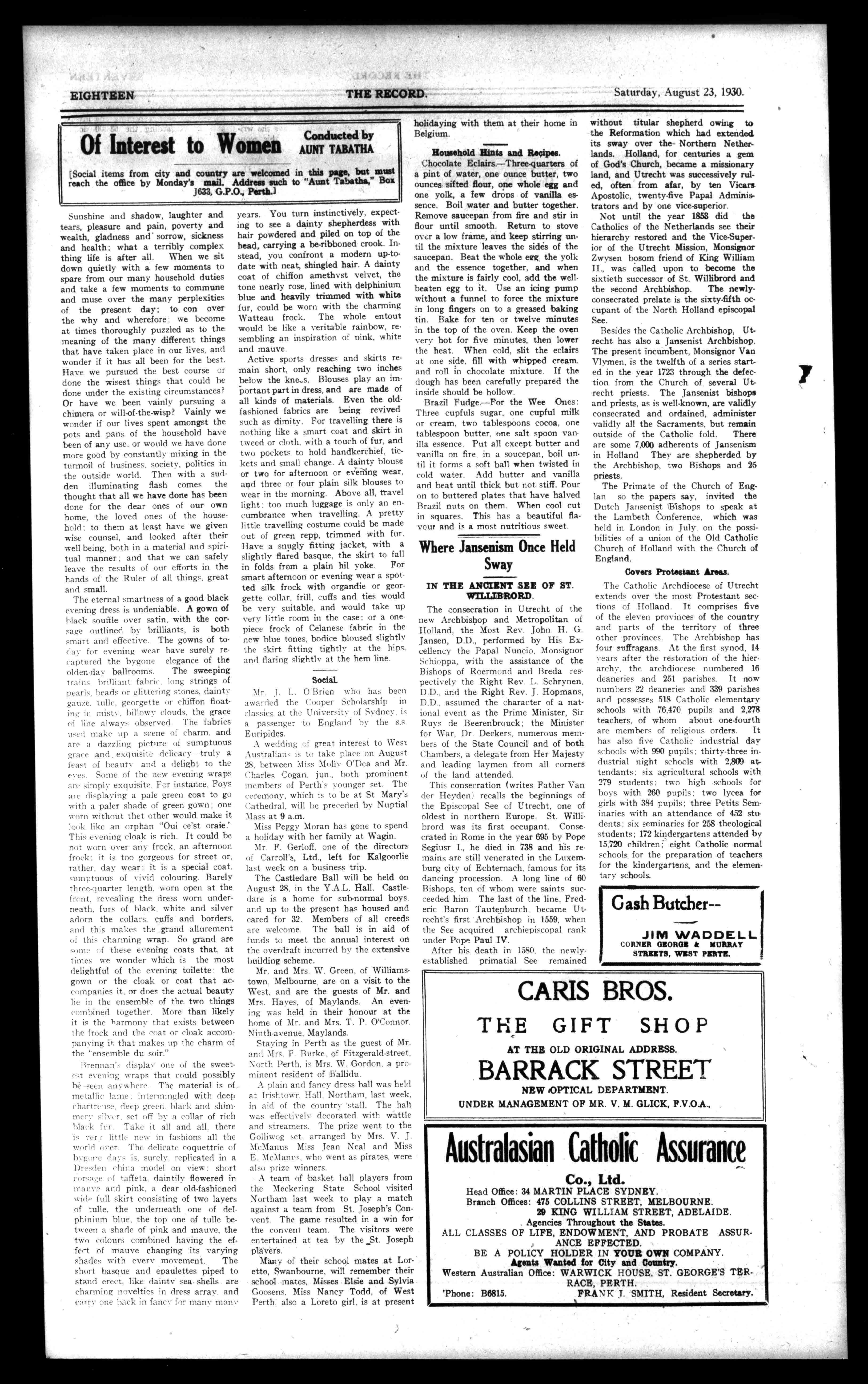 (OppositeTownHall). .111210111.4.011.11111110MOIMUNS4.1.1eMONMEM. M.J.Spruhan 111,11ILYSCITGIMUL (NearBennett-street'. 583HAYSTREETEAST. CornedBeefandSausagesaSPrial0 PeatIllesWailedonforOrders. Telephone.B4770. I 1 1 Anirenn=mon.-.. MINesue. uemmasuismanamseasssonneemmawrw S.BEECROFT BUTCHER. titROI:EBYROAD,SUBIA40. OnlyPrimeFreshKilledMeatgold 'Phone81341. .11111 mnm. 'Phones:B5151,5152,6151. BRYANSLIMITED Printers&Bookbinders 183MURRAYSTREET,PERTH. PrintingatReasonableRatesand PromptDespatch. "SHAMROCK" TEAAlenGRILL1800118. WELLINGTONSTREET,PUTS. J.SHERIDAN,Proprietress' AMMISO.M4 morausts.. HIBERNIANSOCIETY TheOnlyCatholicBenefitSocietyintheState JOINNOW particularsastoBranchSecretaries'Addresses,RatesetOestelbetice,etc,ism J.EDWARDS,Gereeralleerelary, No.11(FirstFloor),WarwickHouseSt.George'sTerrace,Perth.