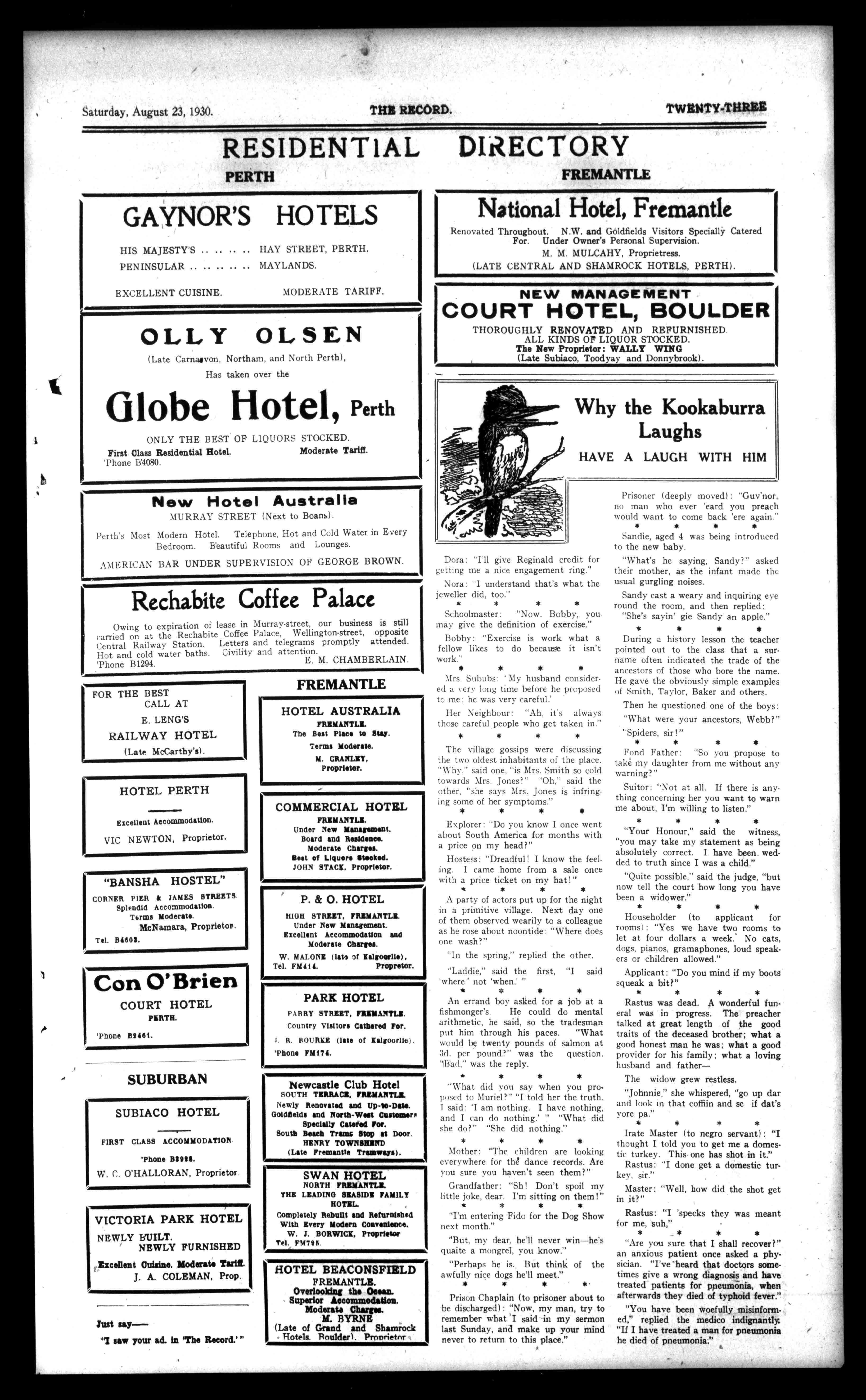 SHEEHAN PRIMEBUTBUTCHIR. HANNAN-STREET,KALOOORLIB. SANTANA-STMT. Tel.498. "%NID.WaffillIMONNI.. BRYANT&WATERS to90STIRLINGSTREET,PERTH. WOODACOALMERCHANTS. OrdersPromptlyAttendedto. 'PhoneB999S. /11.M.1111.1110111111,441111MMN..... FREDFLYNN.CLOTHIERand OUTFITTER 106BARRACKSTREET, (SNIGG'S)ORNIR) PERIN Established30years. FREDSPECIALISESINSURVEYORSOUTFITSSHEARERS')UTFITS,DROVT:RSOUTFITSANDTIWERYTHINGINMENSWEAR. CountryOrdersPromptDispatch. PersonalSupervision FREDFLYNN,PERTH. IROSESStandards,Bush, andClimbers WEHAVETHEFINESTCOLLECTIONOBTAINABLE. FRUITTREESandVINES THEBESTVARIETIES. IllustratedCataloguePostFree. Wilson&JohnsLtd.1 70BARRACKSTREET,PERTH.