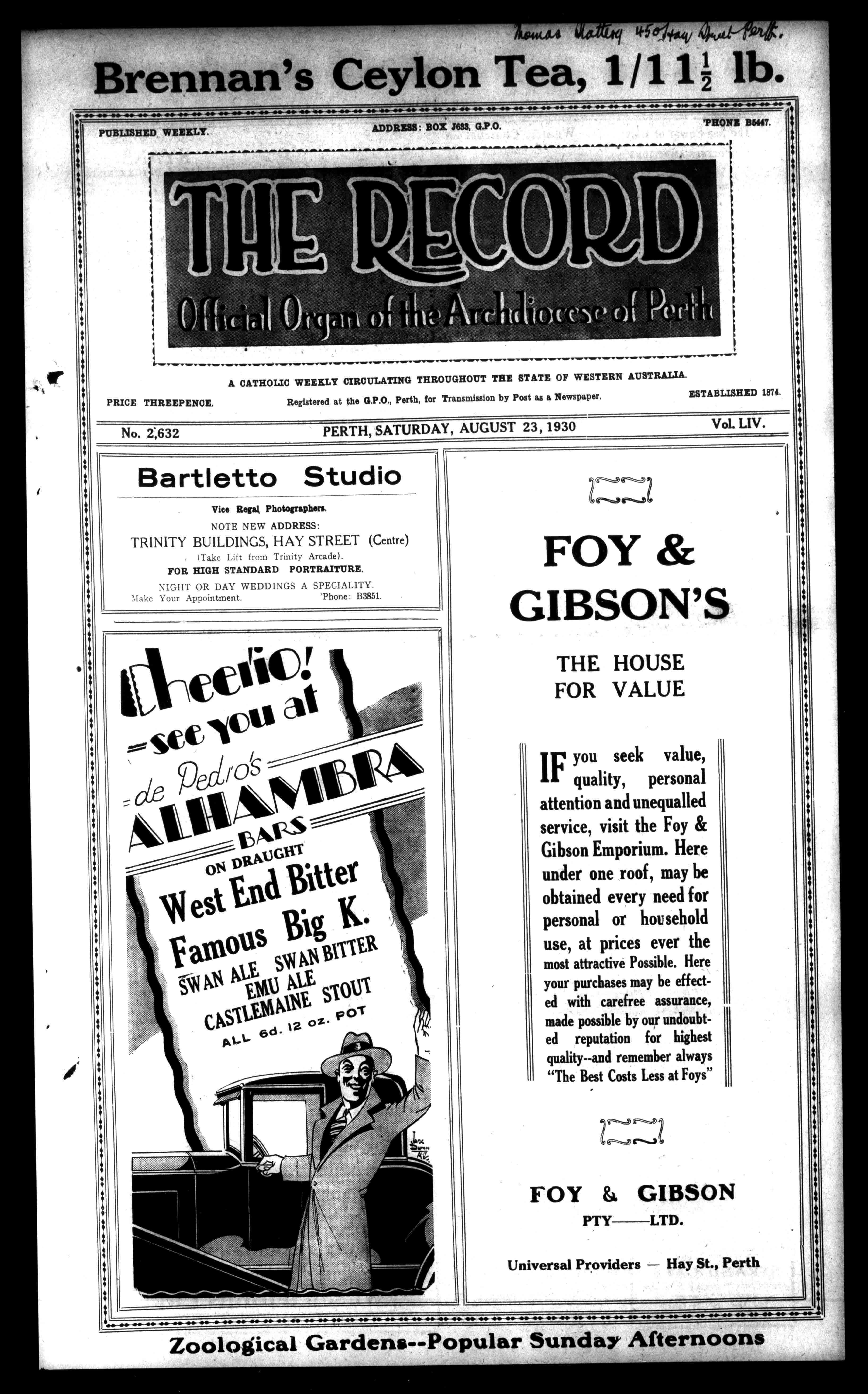 Brennan'sCeylonTea,1/11;lb. NNMNN 'PHONEB5447. PUBLISHEDWEEKLY. ADDRESS:BOXJ693,G.P.O. .1=../L An./1,AM..AIMI../".AM,...IMMLALAM. ANL. \ an. AO\A.IIAAIWA. /1"1111.A. AllIka...... PRICETHREEPENCE, w-gmr1r,marv,.,mr,=r1...w.v.r.m1vvowIrW.Imr,,m,V.mr....WIrvortr,nErw.M.Imia.,Iv.M.,,mrlr.MrImmir.,.=,,mr.-.,mrmr.mrwm,.Nr,ACATHOLICWEEKLYCIRCULATINGTHROUGHOUTTHESTATEOFWESTERNAUSTRALIA. RegisteredattheG.P.O.,Perth,forTransmissionbyPostasaNewspaper. ESTABLISHED1874. No.2,632 PERTH,SATURDAY,AUGUST23,1930 Vol.LIV. BartlettoStudio ViceRegalPhotographers. NOTENEWADDRESS: TRINITYBUILDINGS,HAYSTREET(Centre) (TakeLiftfromTrinityArcade). FORHIGHSTANDARDPORTRAITURE. NIGHTORDAYWEDDINGSASPECIALITY. MakeYourAppointment. 'Phone:B3851.