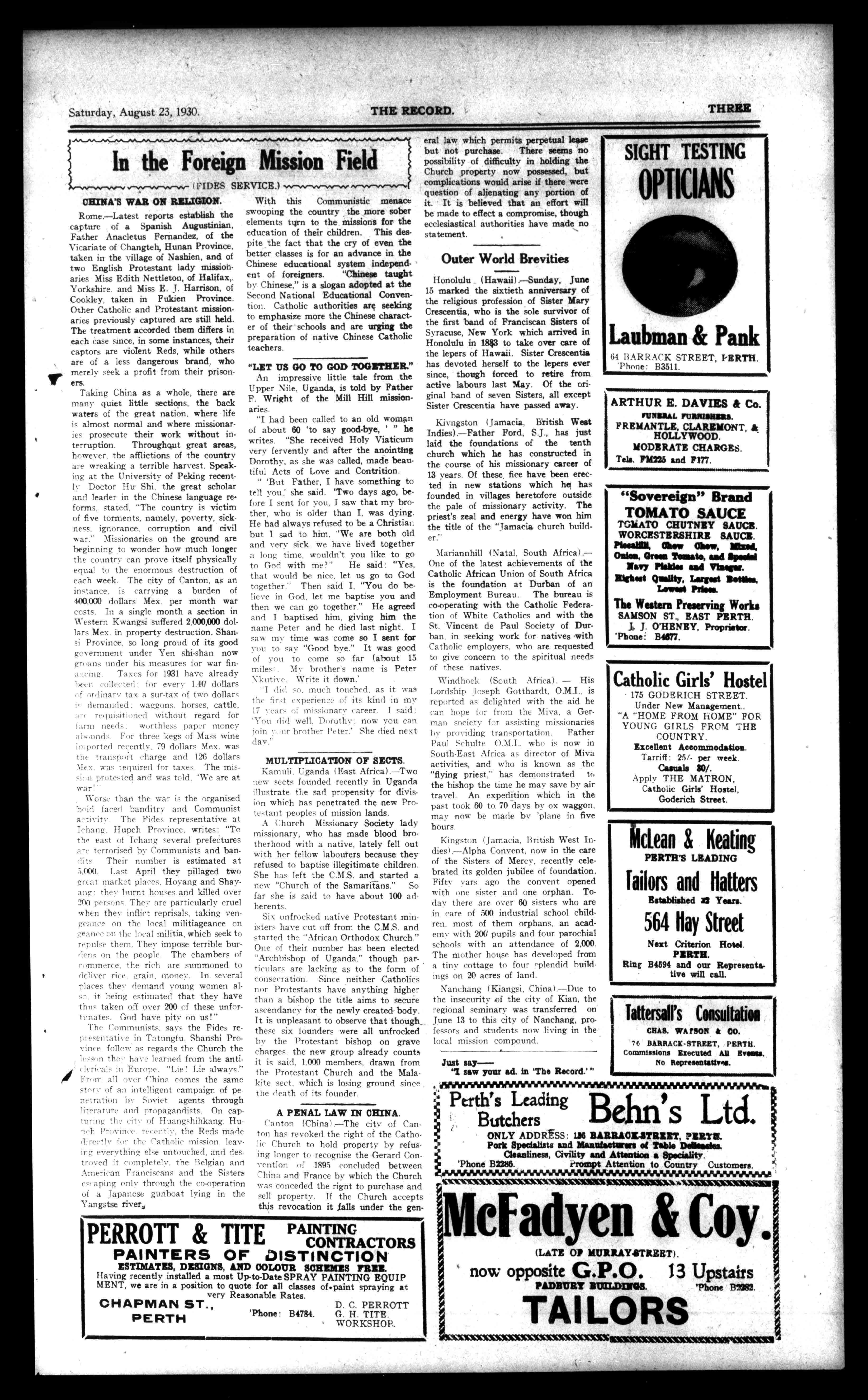 Rome.-Latestreportsestablishthe captureofaSpanishAugustinian, FatherAnacletusFernandez,ofthe VicariateofChangteh,HunanProvince, takeninthevillageofNashien,andof twoEnglishProtestantladymissionariesMissEdithNettleton,ofHalifax,. Yorkshire.andMissE.J.Harrison,of Coakley,takeninFukienProvince. OtherCatholicandProtestantmissionariespreviouslycapturedarestillheld. Thetreatmentaccordedthemdiffersin eacheasesince,insomeinstances,their captorsareViolentReds,whileothers areofalessdangerousbrand,who merelyseekaprofitfromtheirprisoners.