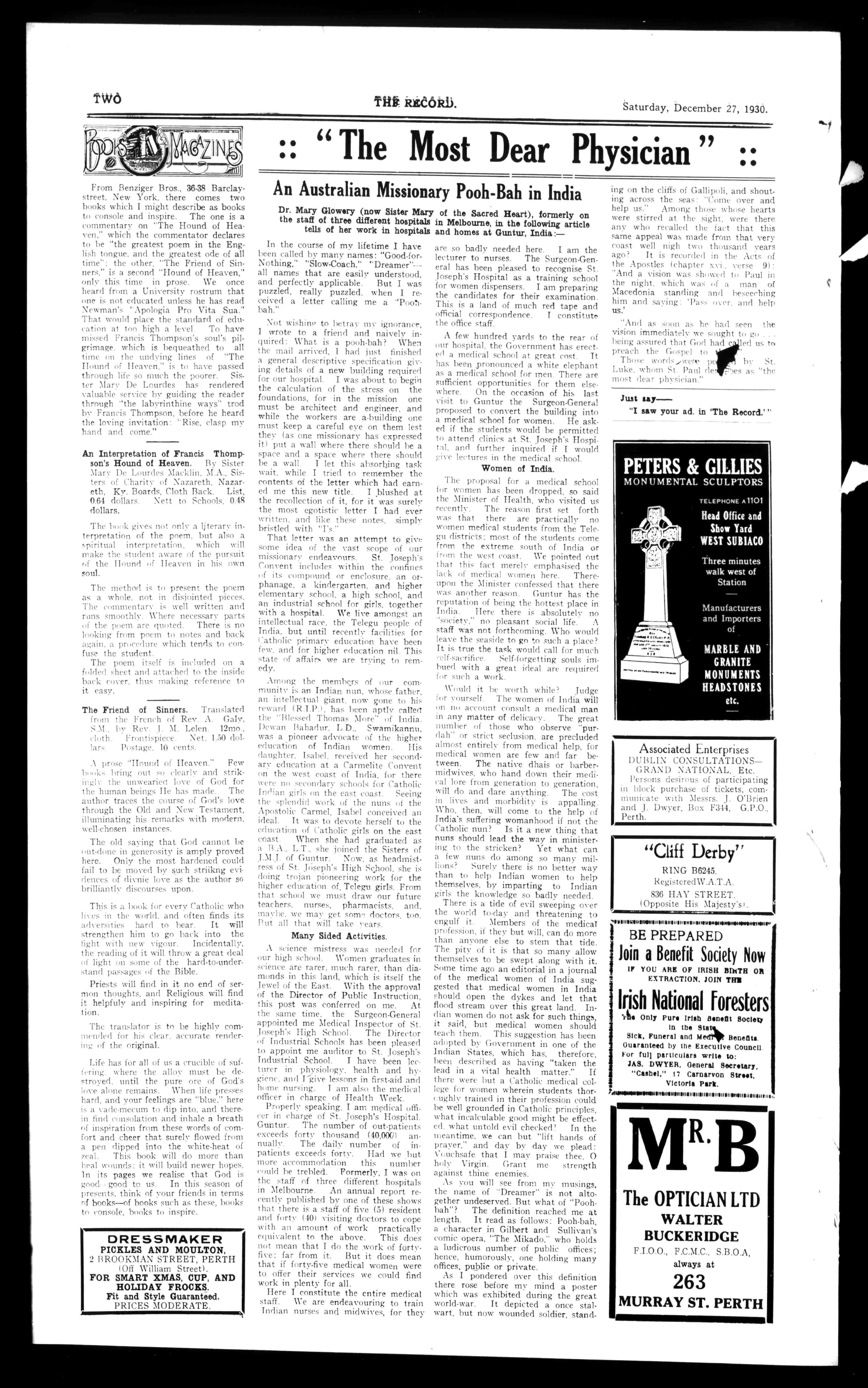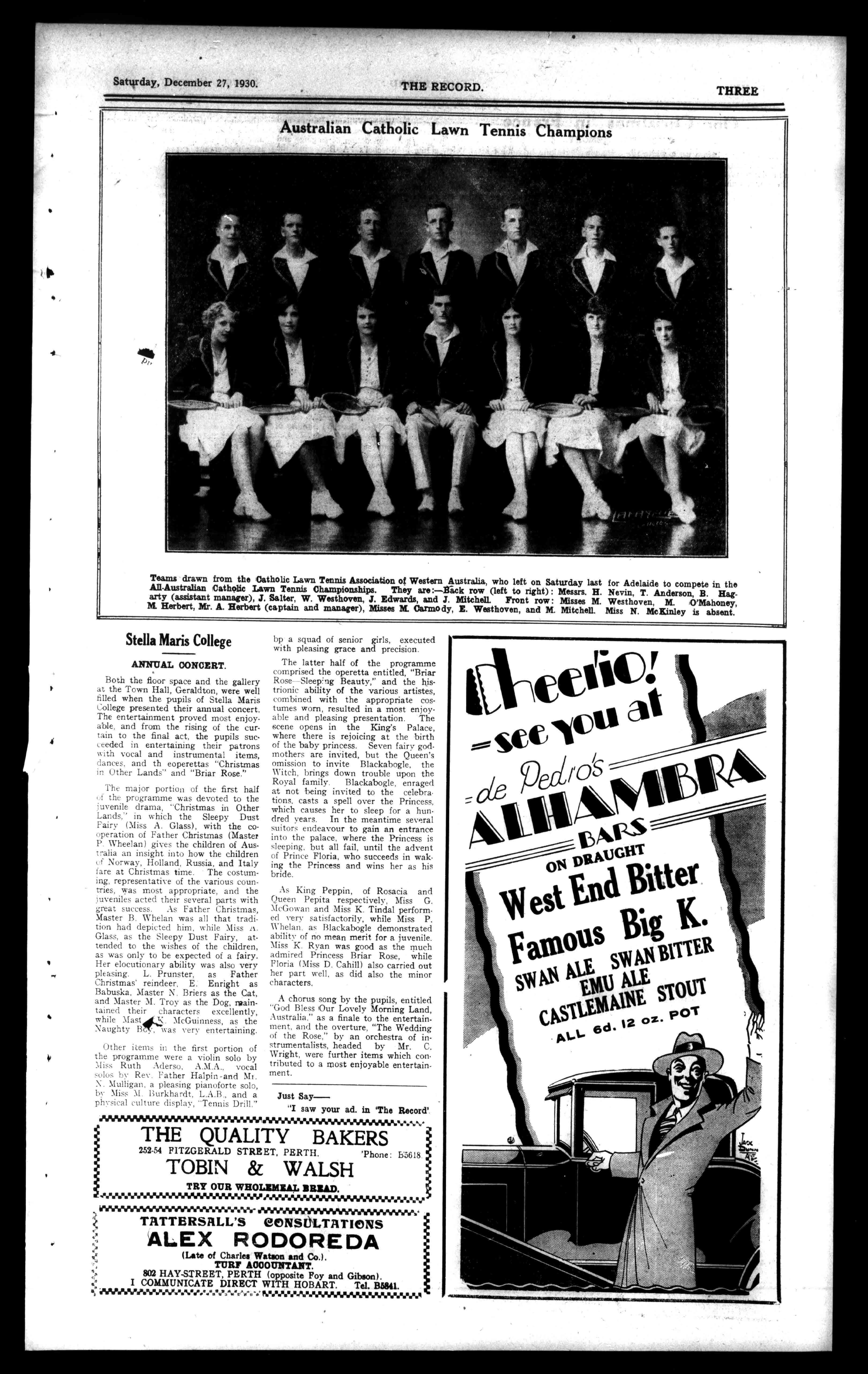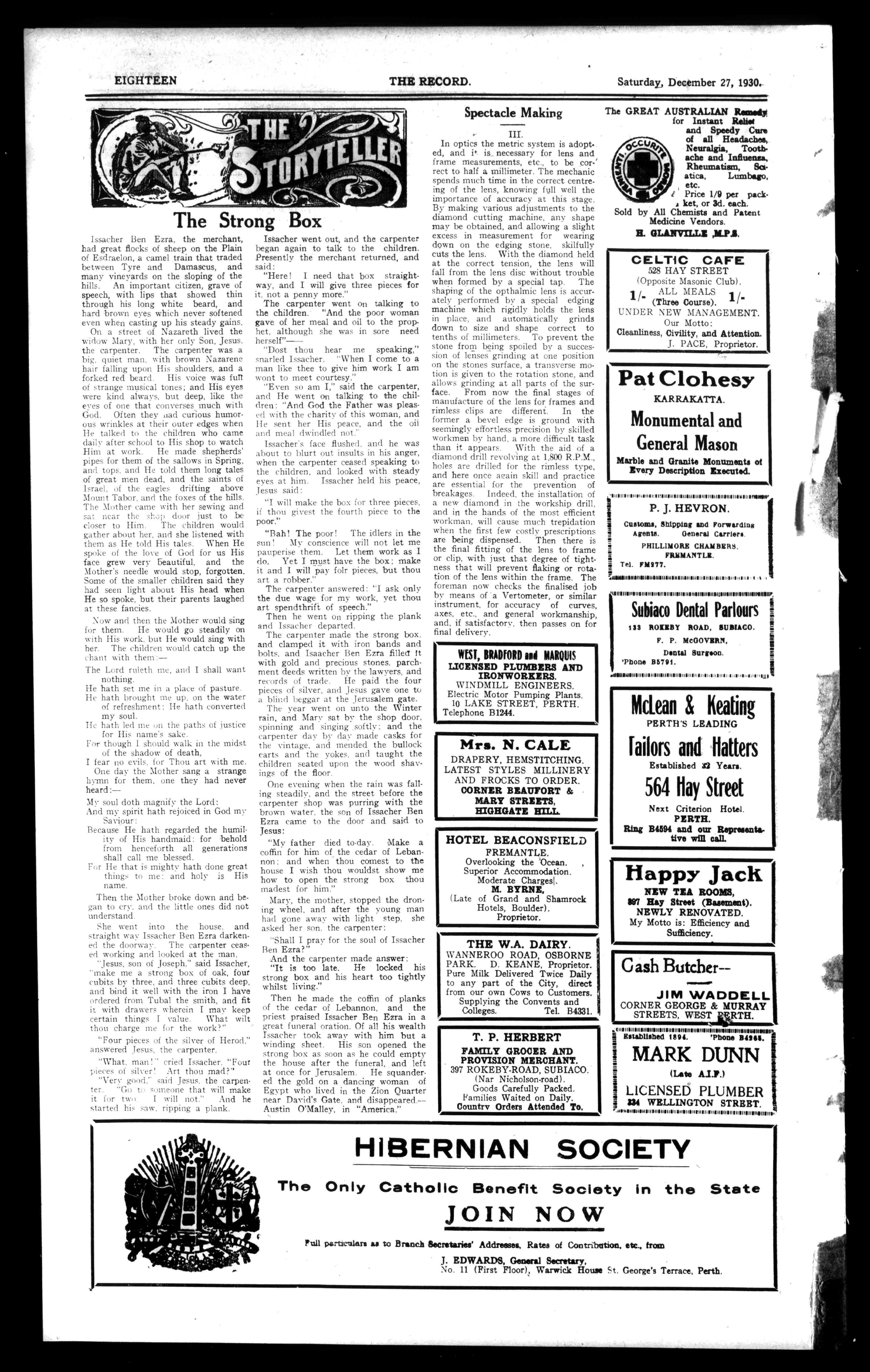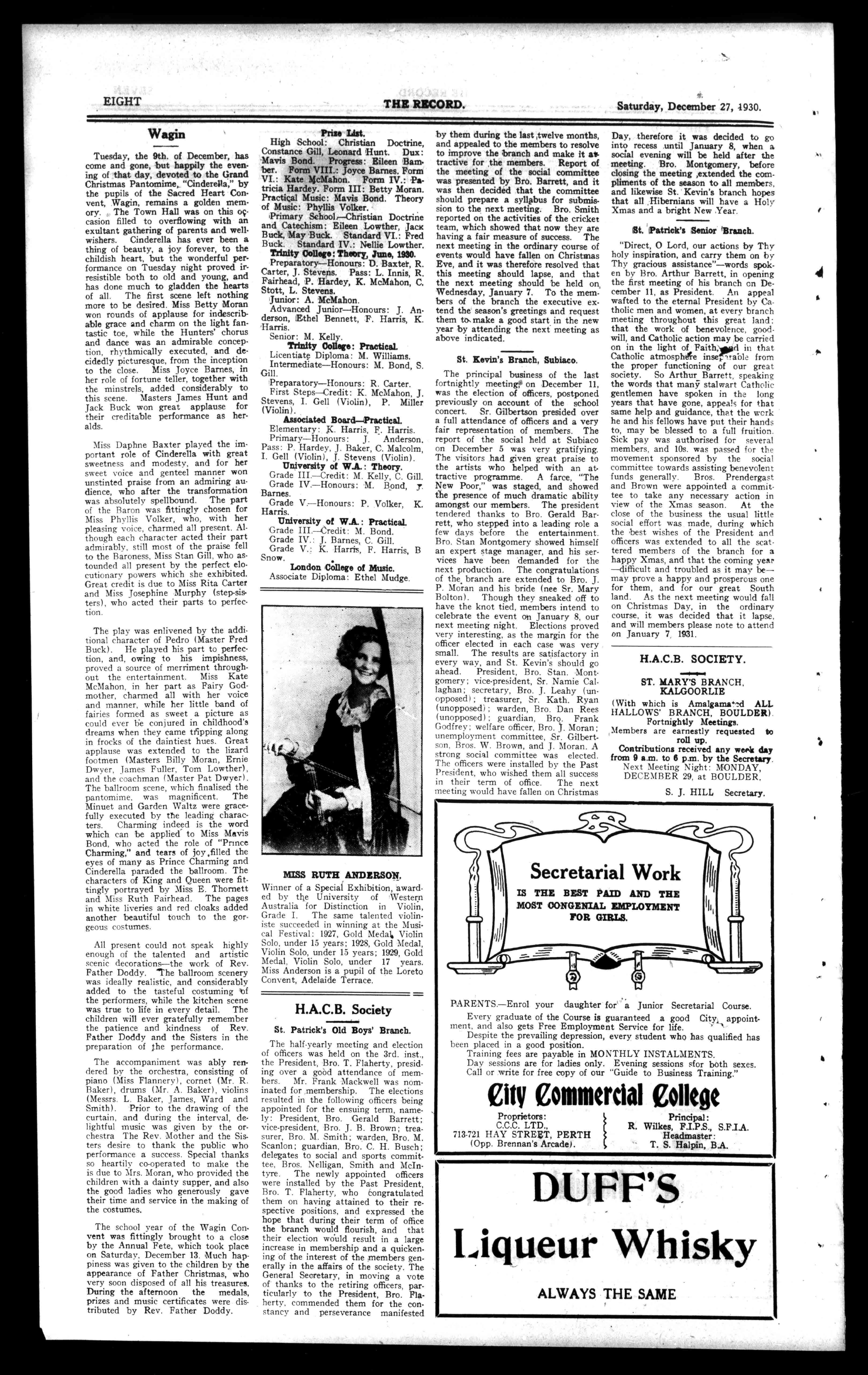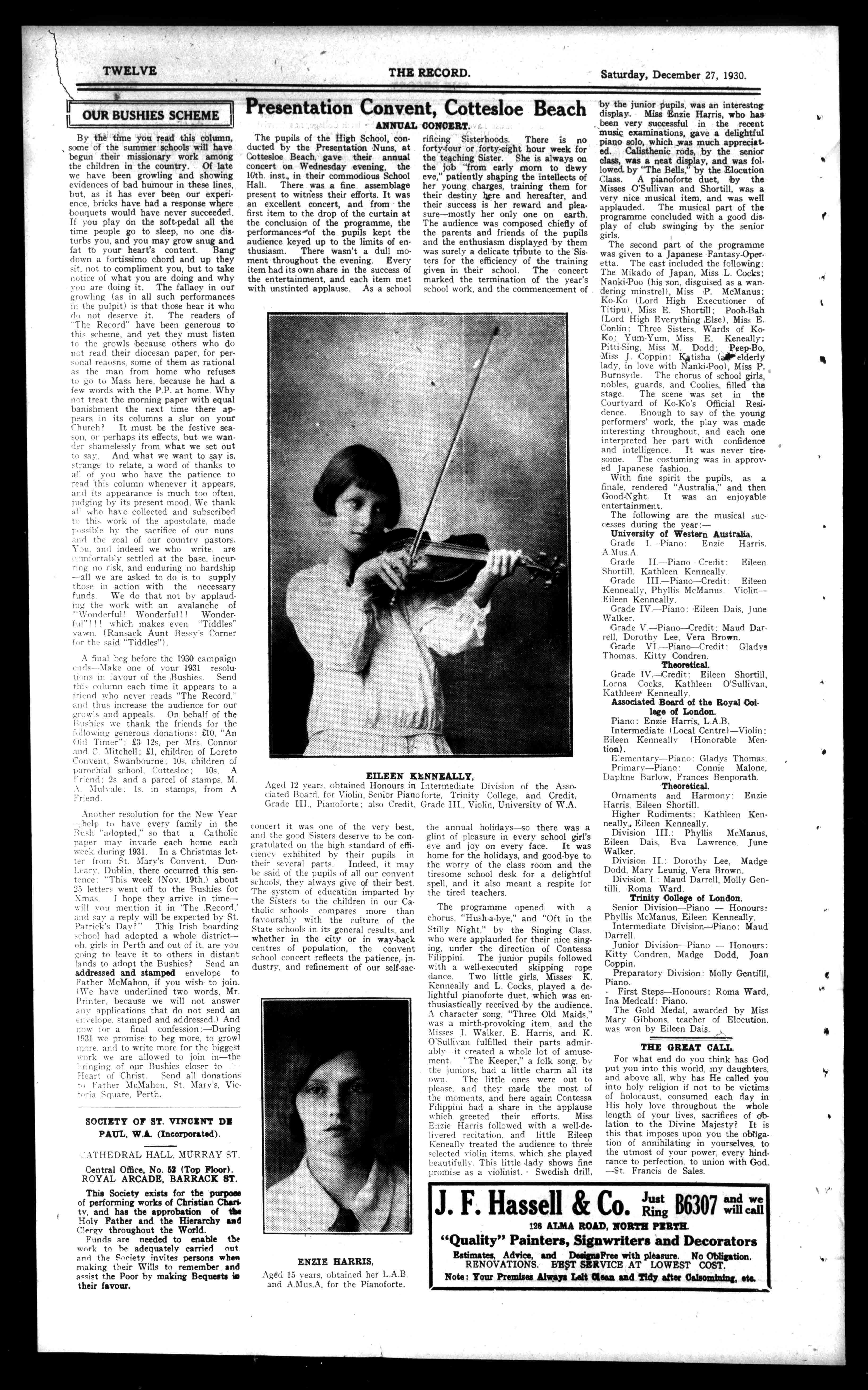 SOMEOFTHESUCCESSFULCANDIDATESATTHERECENTUNIVERSITYMUSICEXAMINATIONS, MISSSHEILADWYER,WHOHASBEENELECTEDQUEENOFST.MARY'S,LEEDERVILLE,BYHER SCHOOLCOMPANIONS-THECHILDREN'SSTALL-LEDBYMRS.P.DALY,WITH57,600VOTES,BEAT- INGSIXOTHERSTALLS,INTHERECENTLEEDERVILLECARNIVAL. PERROTT&TITEPAINTING CONTRACTORS PAINTERSOFalSTINCTION ESTIMATES,DESIGNS,ANDCOLOURSCHEMESFREE. HavingrecentlyinstalledamostUp-to-DateSPRAYPAINTINGEQUIP MENT,weareinapositiontoquoteforallclassesofpaintsprayingat veryReasonableRates CHAPMANST., D.C.PERROTT PERTH 'Phone:B4734.G.H.TITE. WORKSHOP. FootComfortGuaranteed BOOTSANDSHOESINHALFSIZES. IPNECESSARYWEMAKETOORDER. GEORGENELSON HAY-STREET,PERTH. HELPYOURSELFANDTHESTATETOPROSPERITYBY USINGLOCALPRODUCTS. AMONGTHEBESTARE "SovereignBrand"Pickles,Sauces&Vinegar THEPICKOFTHEPICKLES, THEPICKOFTHEPICKLES. FirstPrizeforPickles,RoyalShow,1930. FirstPrizeforTomatoSauce,RoyalShow,1930. TheWesternPreservingWorks - Perth 'Phone:B4677. J.J.O'HENEY,Proprietor. G.E.DINES PIANO&ORGANTUNER. 16DUNCANSTREET, VICTORIAPARK. TelB1474. C.V.CHAPMAN CONTRACTINGPAINTER, HOUSERENOVATOR. 102VICTORIAAVENUE, NORTHFREMANTLE. W.A.TrusteeBuildings, UMSt.George',Terrace (Opp.FoyandGibson's),PERTN. Branch°nice-CornerAdelaideandQueenStreets, FREMANTLE AsNecessarytothoseof LimitedMeansasto* theWealthy Thesizeofyourestatehasno bearingontheimportantquestion ofmakingawill.Remember,only bymakingawillcanyousafeguardthefutureofyourfamily; onlybyawillcanyouinsurethe desireddistributionofyourestate; butthewillshouldbecorrectly drawnupandacompetentExecutorandTrusteeappointed. TheWestAustralianTrustee ExecutorandAgencyCompanyis adequatelyequippedtoservein thesecapacities.Couldyoudo betterthannominateitinyour will? Callorwriteforfreecopyofinterestingandinstructivebooklet, "WillsandWisdom." THEWESTAUSTRALIANTRUSTEE EXECUTORANDAGENCYCOMPANYLIMITED EDMUNDS.BARKER,Manager. 4
