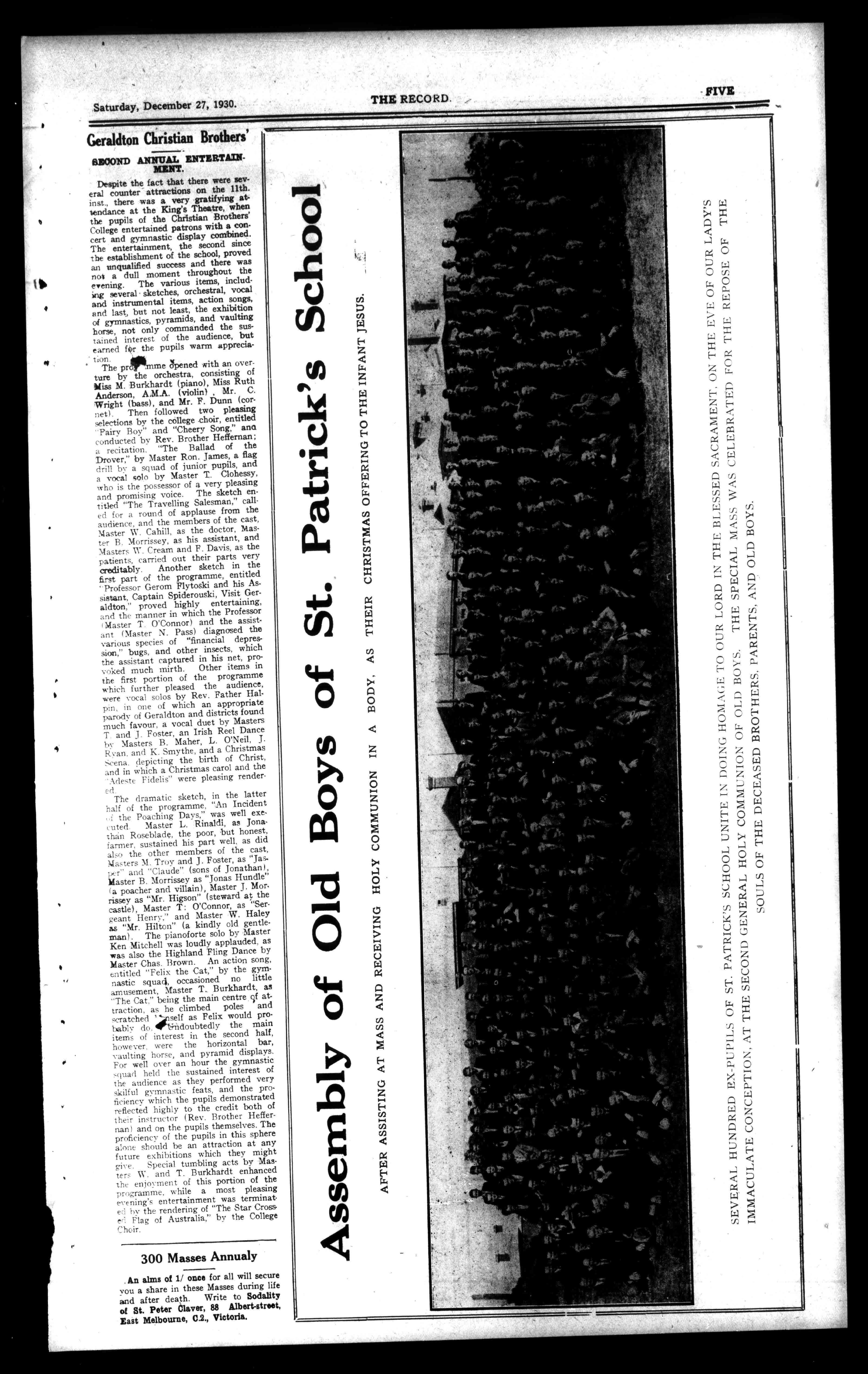 Theprlmmeripenedwithanoverturebytheorchestra,consistingof MissM.Burkhardt(piano),MissRuth Anderson,AMA.(violin)Mr.C. Wright(bass),andMr.F.Dunn(cornet).Thenfollowedtwopleasing selectionsbythecollegechoir,entitled "FairyBoy"and"CheerySong,"and conductedbyRev.BrotherHeffernan; arecitation."TheBalladofthe Drover,"byMasterRon.James,aflag drillbyasquadofjuniorpupils,and avocalsolobyMasterT.Clohessy, whoisthepossessorofaverypleasing andpromisingvoice.Thesketchentitled"TheTravellingSalesman,"calledforaroundofapplausefromthe audience,andthemembersofthecast, MasterW.Cahill,asthedoctor,MasterB.Morrissey,ashisassistant,and MastersW.CreamandF.Davis,asthe patients,carriedouttheirpartsvery creditably.Anothersketchinthe firstpartoftheprogramme,entitled ProfessorGeromFlytoskiandhisAssistant,CaptainSpiderouski,VisitGeraldton,"provedhighlyentertaining, andthemannerinwhichtheProfessor 1MasterT.O'Connor)andtheassistant(MasterN.Pass)diagnosedthe variousspeciesof"financialdepression,"bugs,andotherinsects,which theassistantcapturedinhisnet,provokedmuchmirth.Otheritemsin thefirstportionoftheprogramme whichfurtherpleasedtheaudience, werevocalsolosbyRev.FatherHalpin,inoneofwhichanappropriate parodyofGeraldtonanddistrictsfound muchfavour,avocalduetbyMasters TandJ.Foster,anIrishReelDance byMastersB.Maher,L.O'Neil,J. Ryan.andK.Smythe,andaChristmas Scena.depictingthebirthofChrist, andinwhichaChristmascarolandthe AdesteFidelis"werepleasingrendered Thedramaticsketch,inthelatter halfoftheprogramme,"AnIncident .,fthePoachingDays,"waswellexc. uted.MasterL.Rinaldi,asJonathanRoseblade,thepoor,buthonest, farmer,sustainedhispartwell,asdid alsotheothermembersofthecast, MastersM.TroyandJ.Foster,as"Jas. 1,er-and"Claude"(sonsofJonathan), MasterB.Morrisseyas"JonasHundle" (apoacherandvillain),MasterJ.Morrisseyas"Mr.Higson"(stewardatthe castle),MasterT:O'Connor,as"SergeantHenry,"andMasterW.Haley as"Mr.Hilton"(akindlyoldgentleman).ThepianofortesolobyMaster KenMitchellwasloudlyapplauded,as wasalsotheHighlandFlingDanceby MasterChas.Brown.Anactionsong, entitled"FelixtheCat,"bythegymnasticsquacl,occasionednolittle amusement,MasterT.Burkhardt,as "TheCat,"beingthemaincentresfattraction,asheclimbedpolesand scratched'''41selfasFelixwouldprobablydo.titidoubtedlythemain itemsofinterestinthesecondhalf, however,werethehorizontalbar, vaultinghorse,andpyramiddisplays, Forwelloveranhourthegymnastic squadheldthesustainedinterestof theaudienceastheyperformedvery skilfulgymnasticfeats,andtheproficiencywhichthepupilsdemonstrated reflectedhighlytothecreditbothof theirinstructor(Rev.BrotherHeffernan)andonthepupilsthemselves.The proficiencyofthepupilsinthissphere aloneshouldbeanattractionatany futureexhibitionswhichtheymight give.SpecialtumblingactsbyMastersW.andT.Burkhardtenhanced theenjoymentofthisportionofthe programme,whileamostpleasing evening'sentertainmentwasterminatedbytherenderingof"TheStarCrossFlagofAustralia,"bytheCollege Choir.