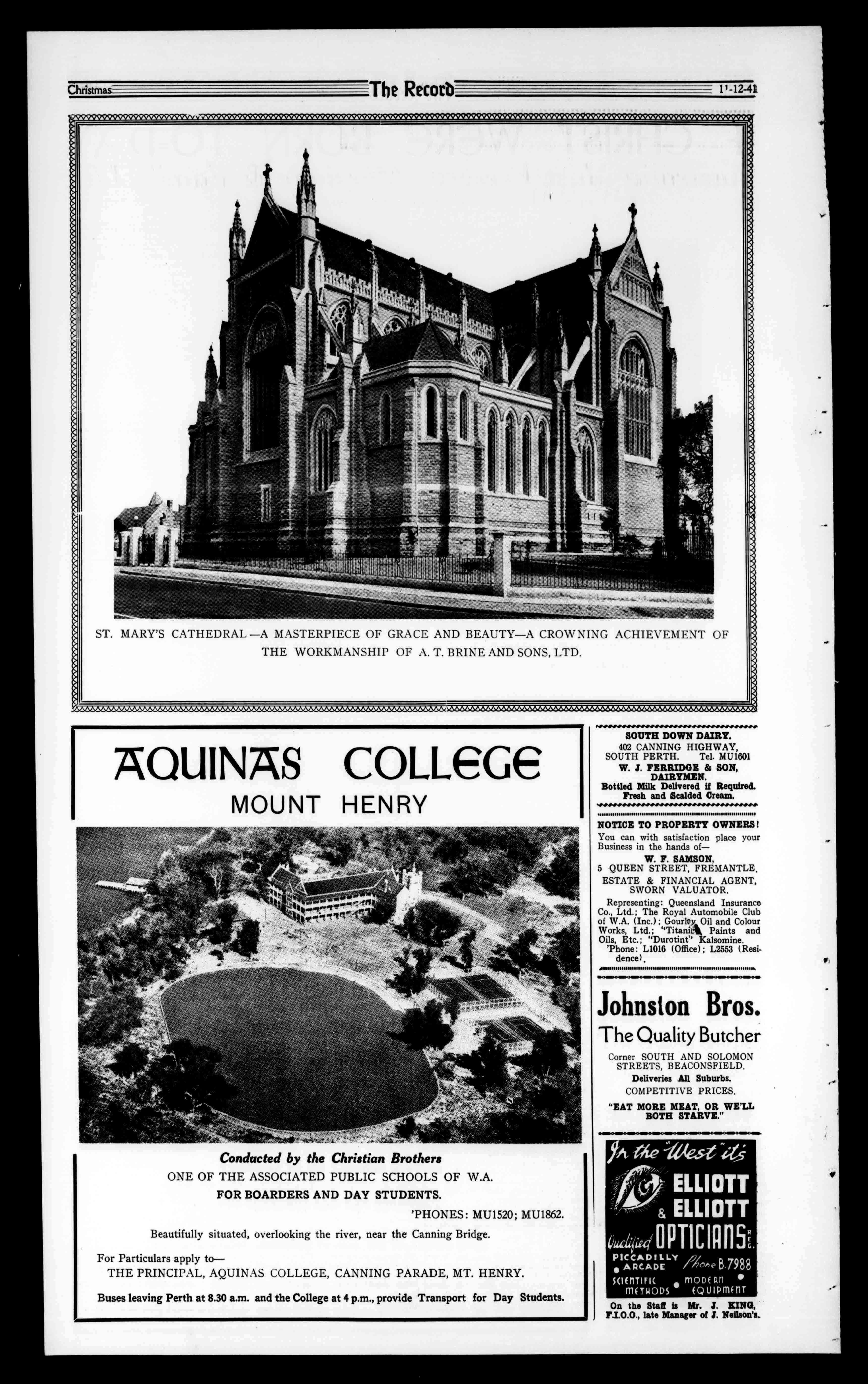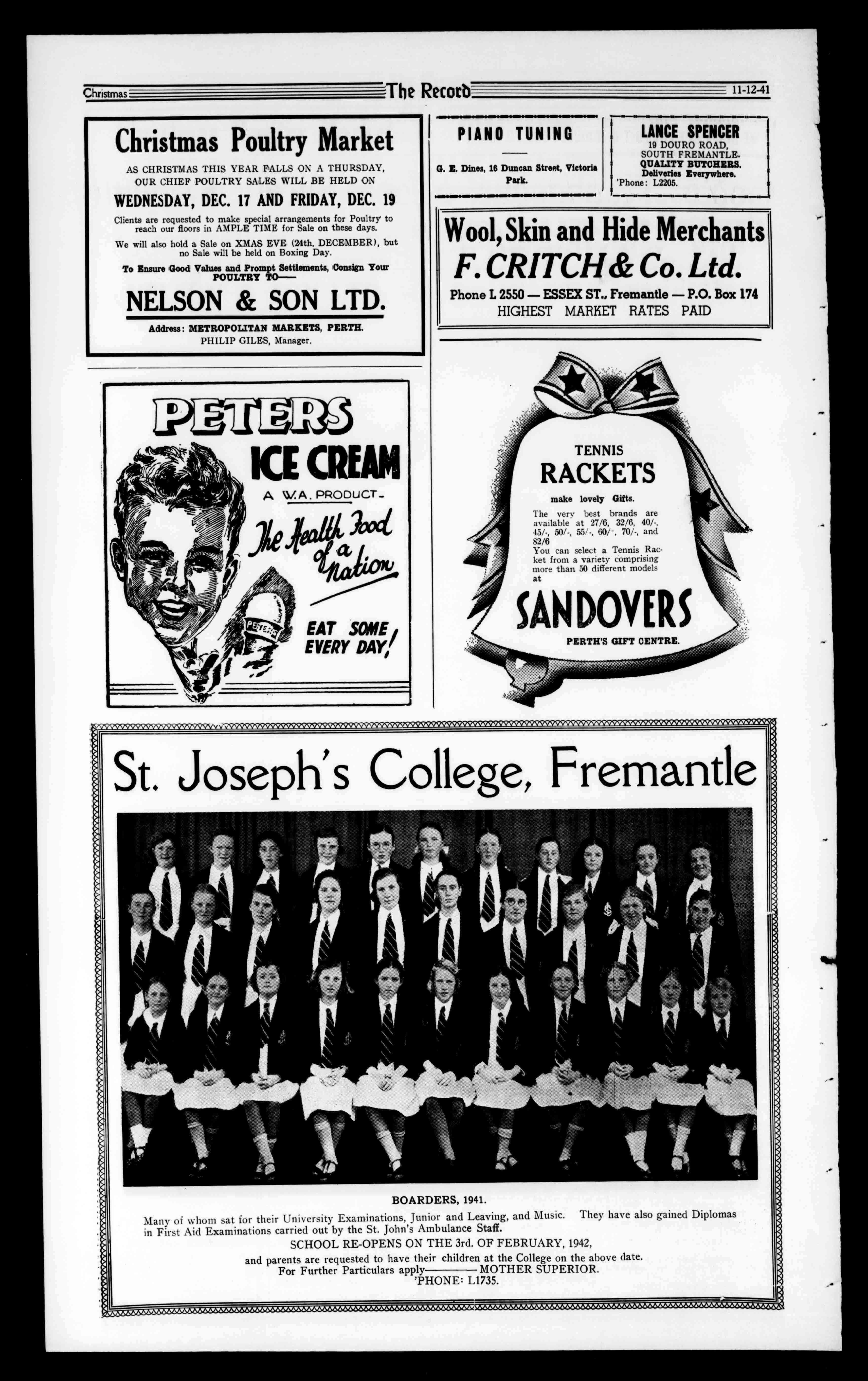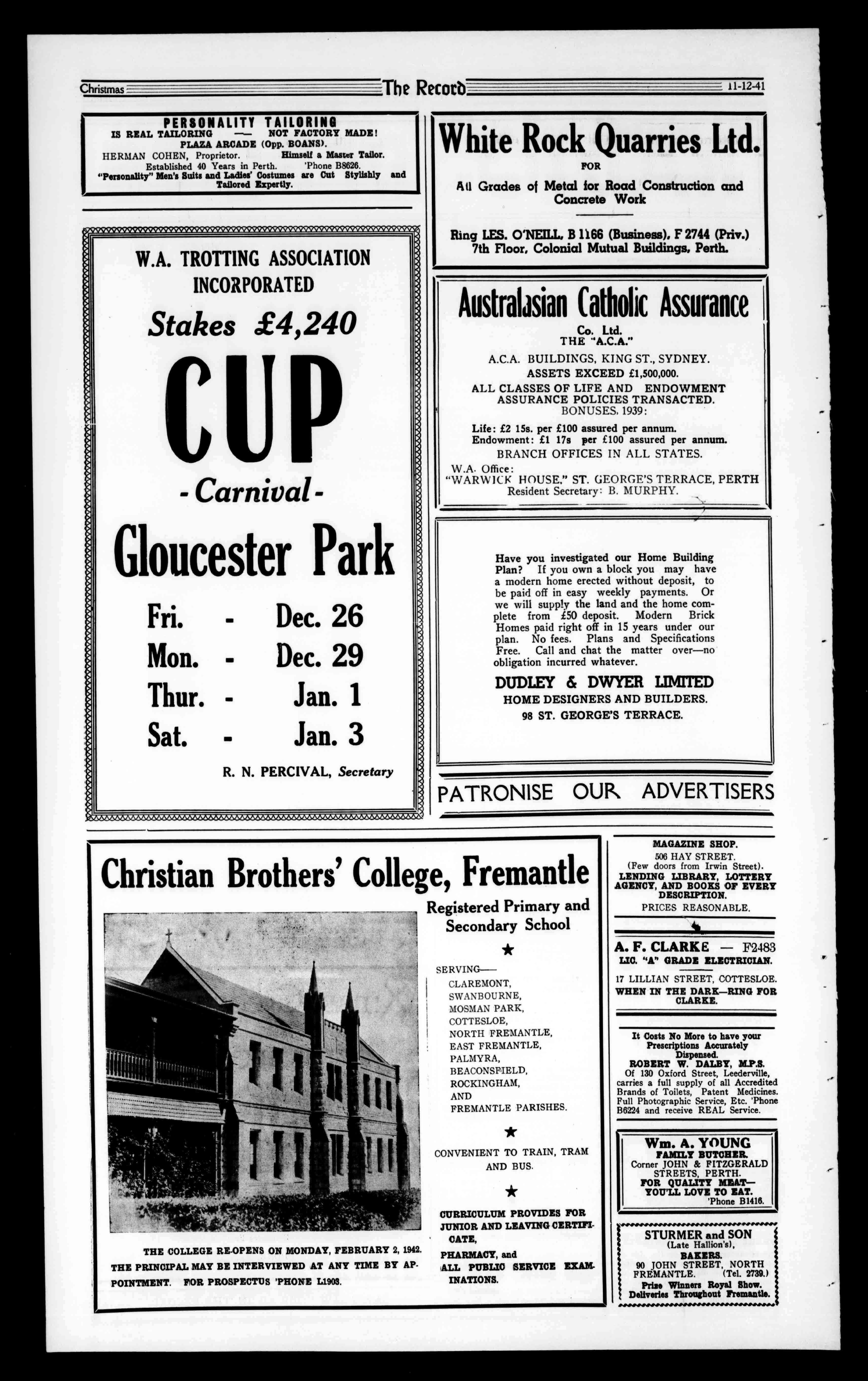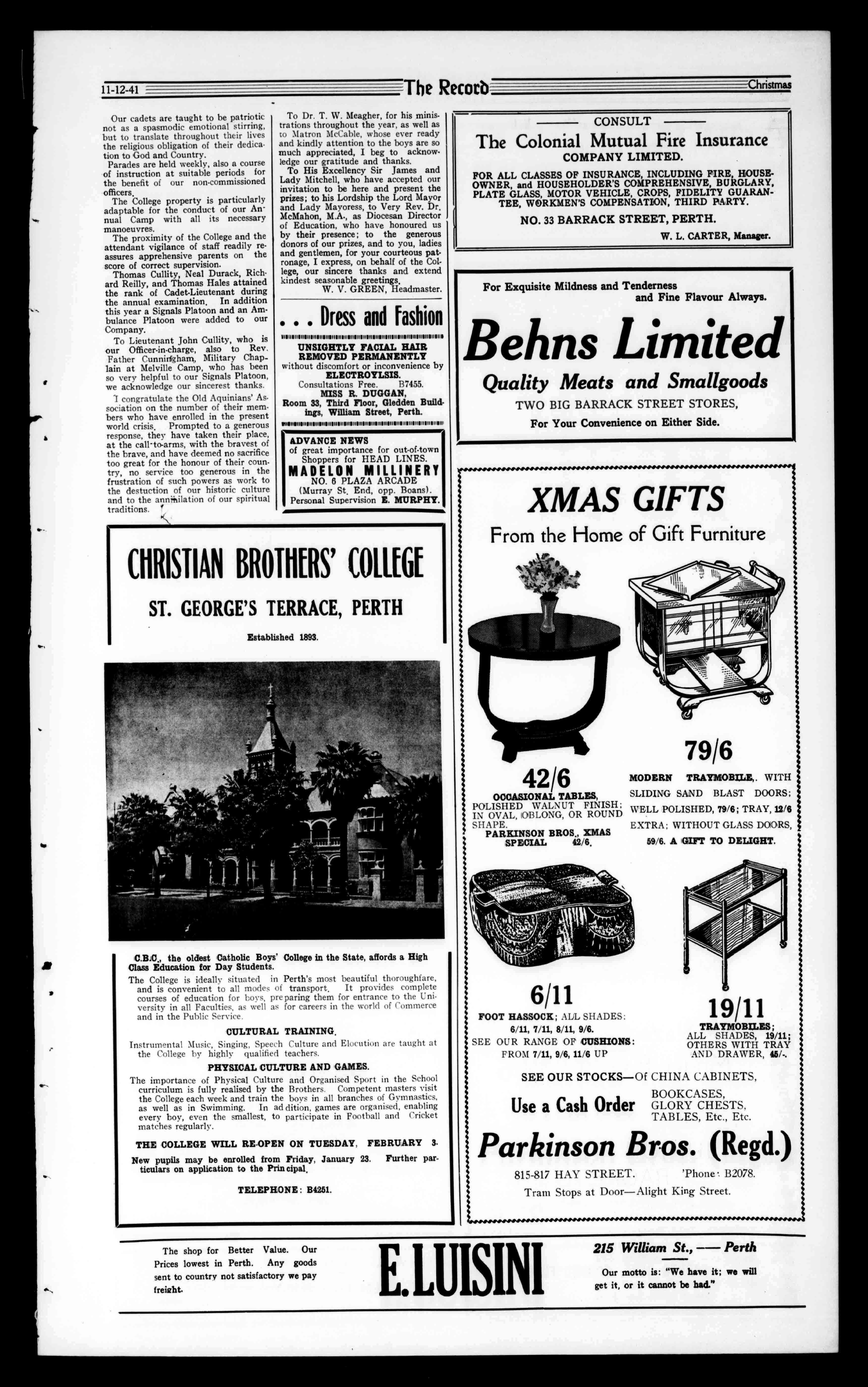UseaCashOrder CONSULT TheColonialMutualFireInsurance COMPANYLIMITED. FORALLCLASSESOFINSURANCE,INCLUDINGFIRE,HOUSEOWNER,andHOUSEHOLDER'SCOMPREHENSIVE,BURGLARY, PLATEGLASS,MOTORVEHICLE,CROPS,FIDELITYGUARANTEE,WORKMEN'SCOMPENSATION,THIRDPARTY. NO.33BARRACKSTREET,PERTH. W.L.CARTER,Manager. ForExquisiteMildnessandTenderness andFineFlavourAlways. BehnsLimited QualityMeatsandSmallgoods TWOBIGBARRACKSTREETSTORES, ForYourConvenienceonEitherSide. XMASGIFTS FromtheHomeofGiftFurniture