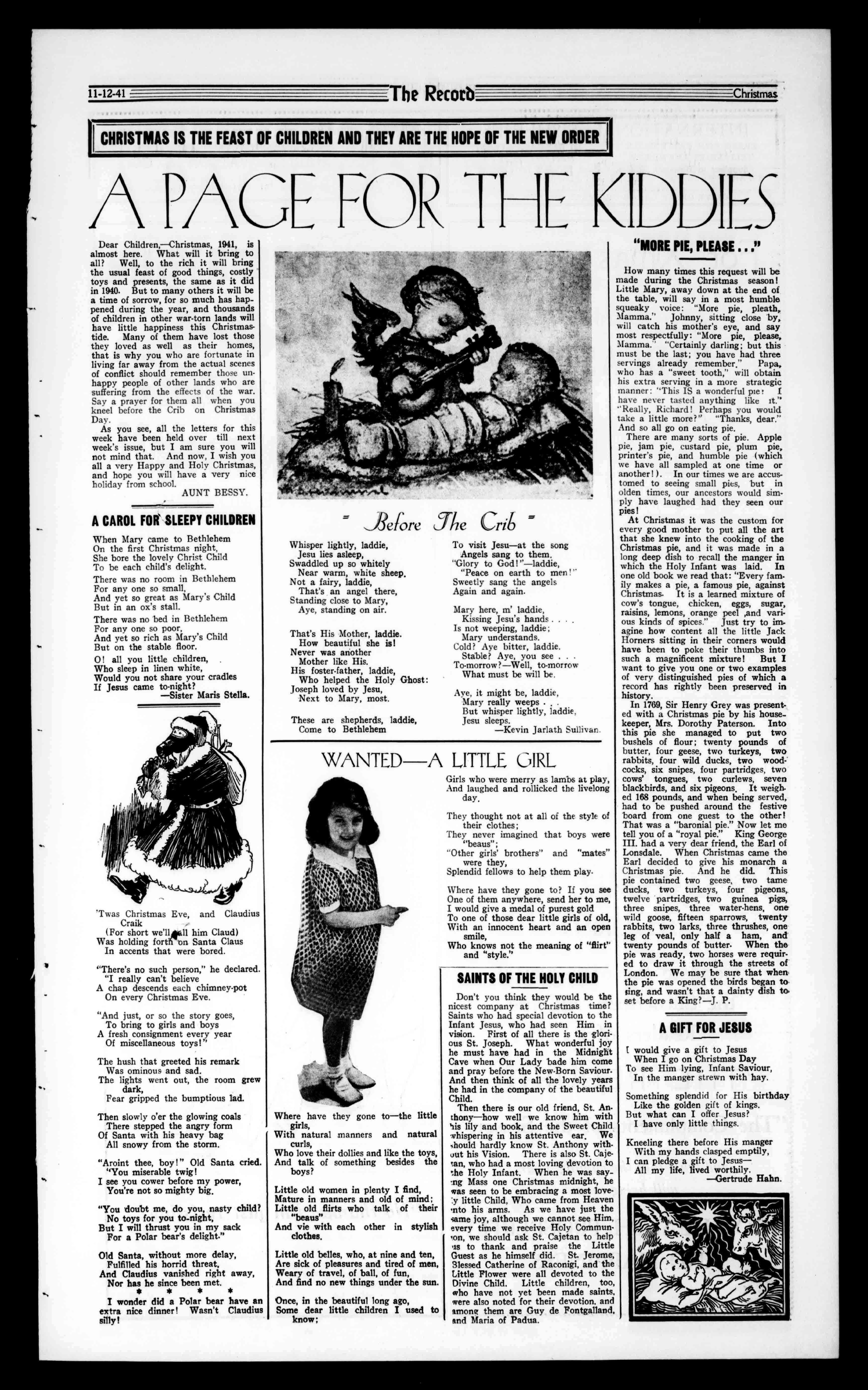 Ehavecometotheendofaseconddifficultyearof warandnowasweapproachtheChristmastide, welookforwardtothe.FeastofOurLord's Nativityastoahavenofpeaceandsecurityfrom thewar-rackedworld.Insuchcriticaltimes,when ourownnationaldestinyisobscure,theFeastof Christmasshouldservetoawakenaquickenedsense oftherealityofourChristianfaithandofresolveto renewinourownlivestheChristianwayoflife. ForOurLord,byHiscomingtoBethlehemin ourflesh,beganthatrenewalofmankindwhich wouldbeconsummatedontheCrossandwould beperpetuatedthroughtheMassandtheSacramentstothe endoftime.ThemannerofHisBirthandindeedofHiswholelife wasachallengeandacontradiction.notonlytothepaganworldofHis time,buttothespiritofworldlinessinallages.Andhenceitbehoves allChristians,asfaithfulfollowersoftheDivineChild,toshowforth intheirlivesthesame.uncompromisingchallengeoftheChristianlife againstthespiritofgreedandlustandcrueltywhichunhappilyyet markshumansociety.