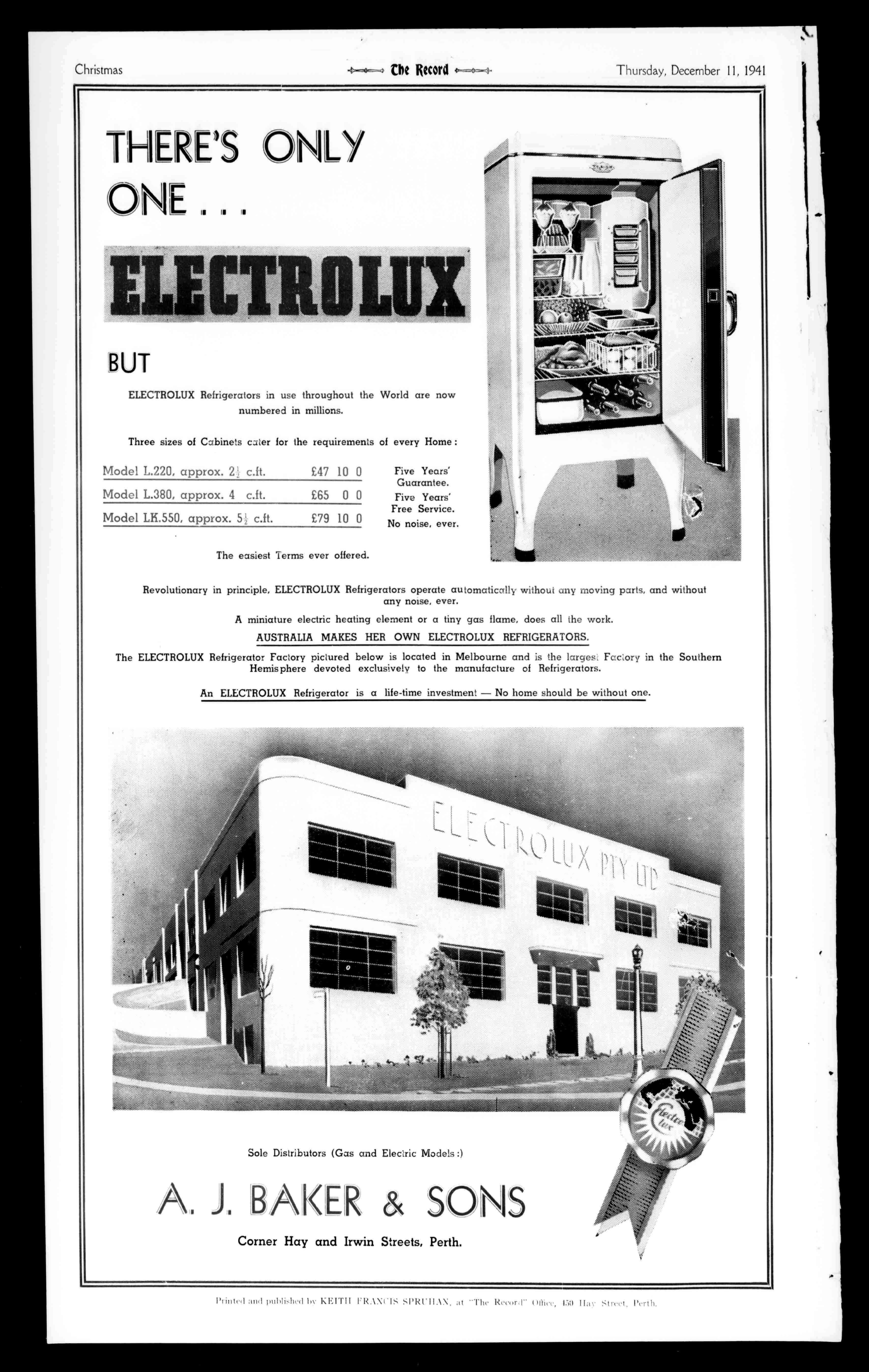 AnELECTROLUXRefrigeratorisalife-timeinvestment-Nohomeshouldbewithoutone. A.J. SoleDistributors(GasandElectricModels:) BA ,4;;igiii..iiito0h.wa.mgffrffffrtER&SONS CornerHayandIrwinStreets,Perth. Printedandpublished1wKEITHFRANCISSPRUHAN,at"TheRecord"()trice,451)HayStreet,Perth.