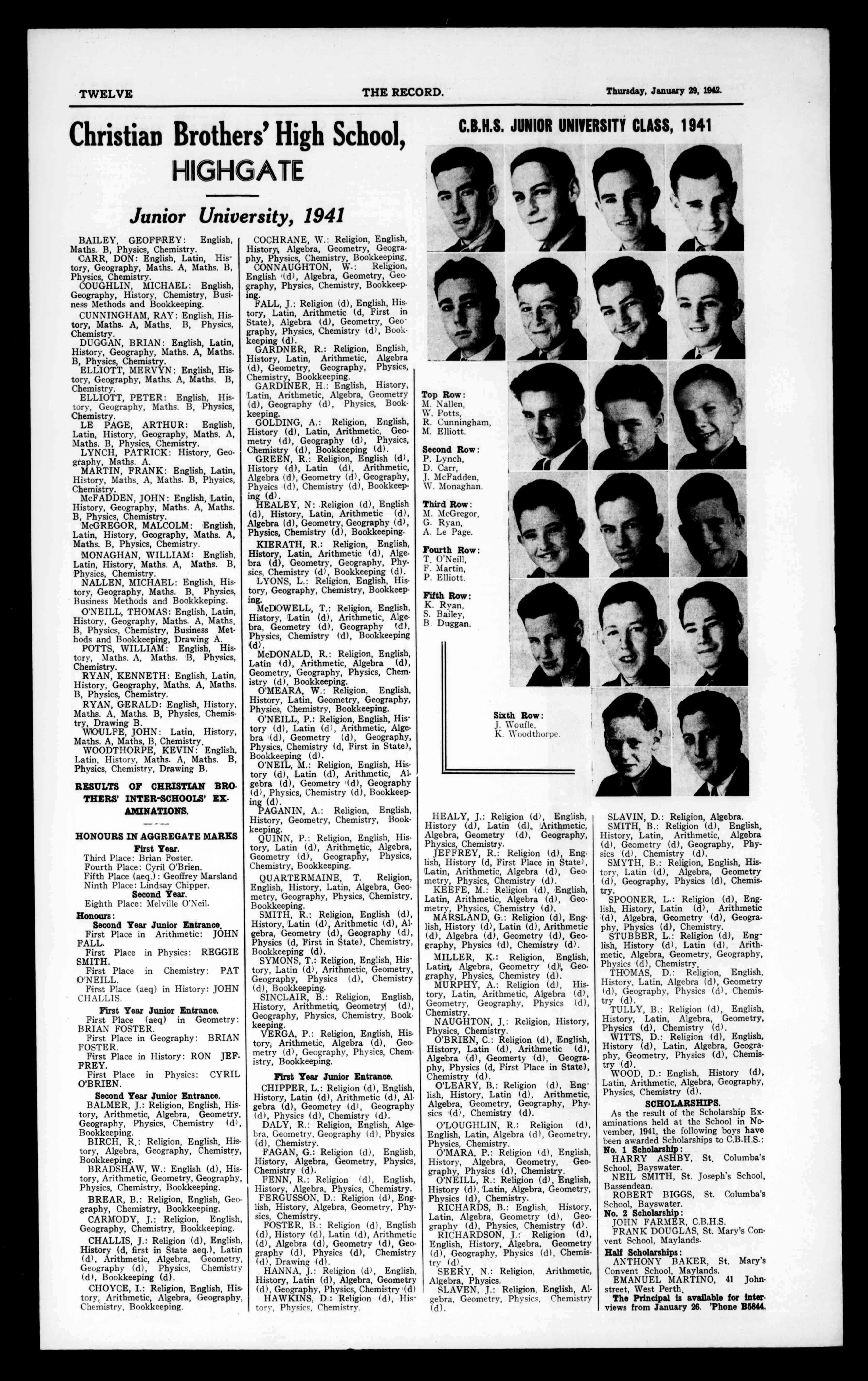 JuniorDivision-Honours:P.French (100marks),B.Teahan(100),M.Sheehan(95),P.Colling(92).Merit:F. Cruickshank;M.Davey(95).