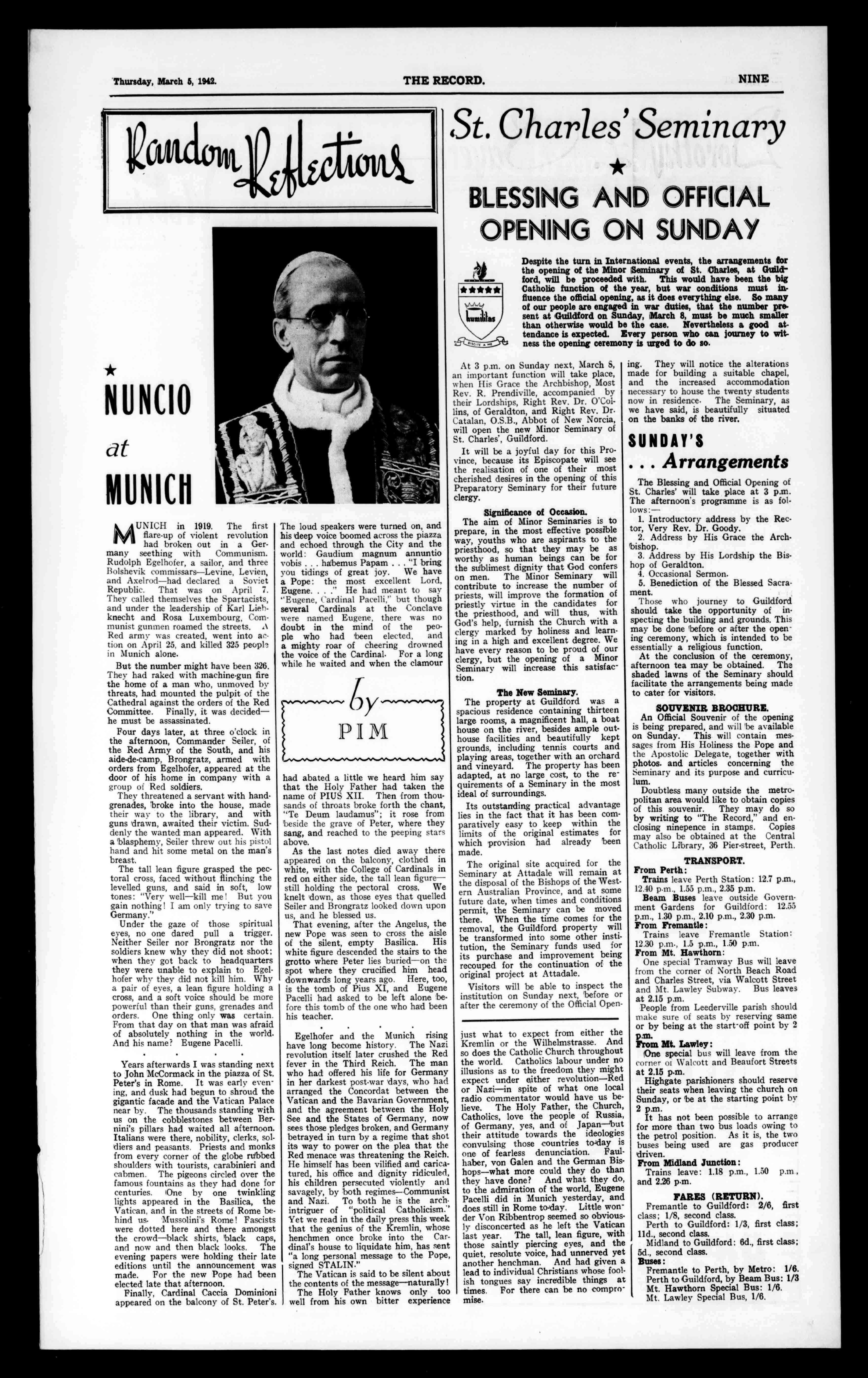 Consideringthesevererestrictionoftransport,therewasalargeand representativegatheringatGuildfordonSundaylast,towitnesstheblessingandofficialopeningofSt.Charles'Seminary.ThisceremonywasperformedbyHisGracetheArchbishop.AmongthosepresentweretheLord AbbotofNewNorcia,MostRev.Dr.A.Catalan,O.S.B.VeryRev.Father B.Gallagher,VicarCapitularoftheGeraldtonDiocese(representingthe BishopofGeraldton);Rt.Rev.MonsignorFagan,V.G.,RI.;Rt.Rev.MonsignorMoloney,R.I.,V.F.,andallthepriestsofthemetropolitanarea,and representativesofthereligiousOrders.