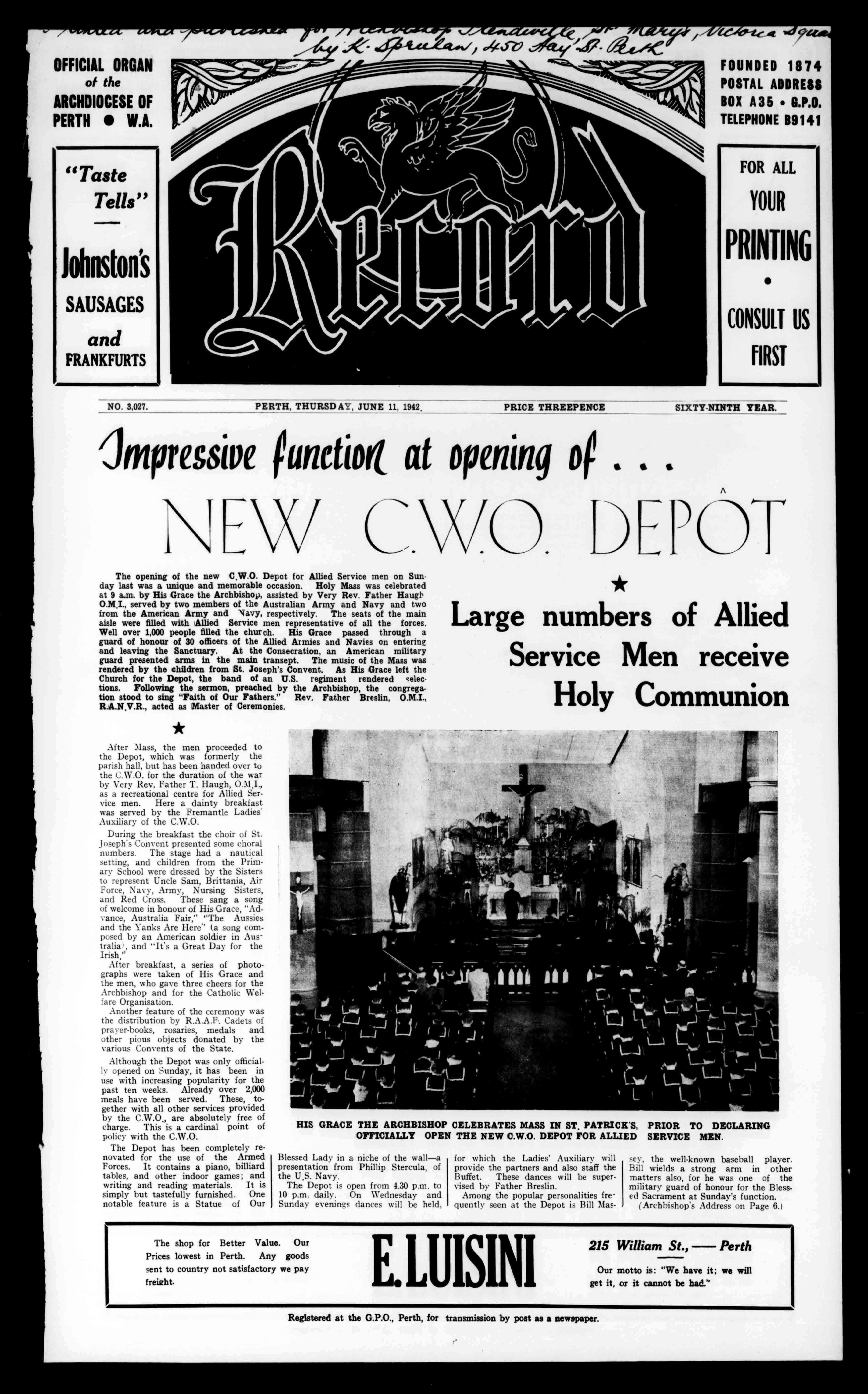 LargenumbersofAllied ServiceMenreceive HolyCommunion HISGRACETHEARCHBISHOPCELEBRATESMASSINST.PATRICK'S,PRIORTODECLARING OFFICIALLYOPENTHENEWC.W.O.DEPOTFORALLIEDSERVICEMEN. BlessedLadyinanicheofthewall-a presentationfromPhillipStercula,of theU.S.Navy. TheDepotisopenfrom1.30p.m.to 10p.m.daily.OnWednesdayand Sundayeveningsdanceswillbeheld, forwhichtheLadies'Auxiliarywill providethepartnersandalsostaffthe Buffet.ThesedanceswillbesupervisedbyFatherBreslin. AmongthepopularpersonalitiesfrequentlyseenattheDepotisBillMaesey,thewell-knownbaseballplayer. Billwieldsastrongarminother mattersalso,forhewasoneofthe militaryguardofhonourfortheBlessedSacramentatSunday'sfunction. (Archbishop'sAddressonPage6.1 TheshopforBetterValue.Our PriceslowestinPerth.Anygoods enttocountrynotsatisfactorywepay freight. E.LUISINI 215WilliamSt., Perth Ourmottois:"Wehaveit;wewill getit,oritcannotbehad." RegisteredattheG.P.O.,Perth,fortransmissionbypostasanewspaper.