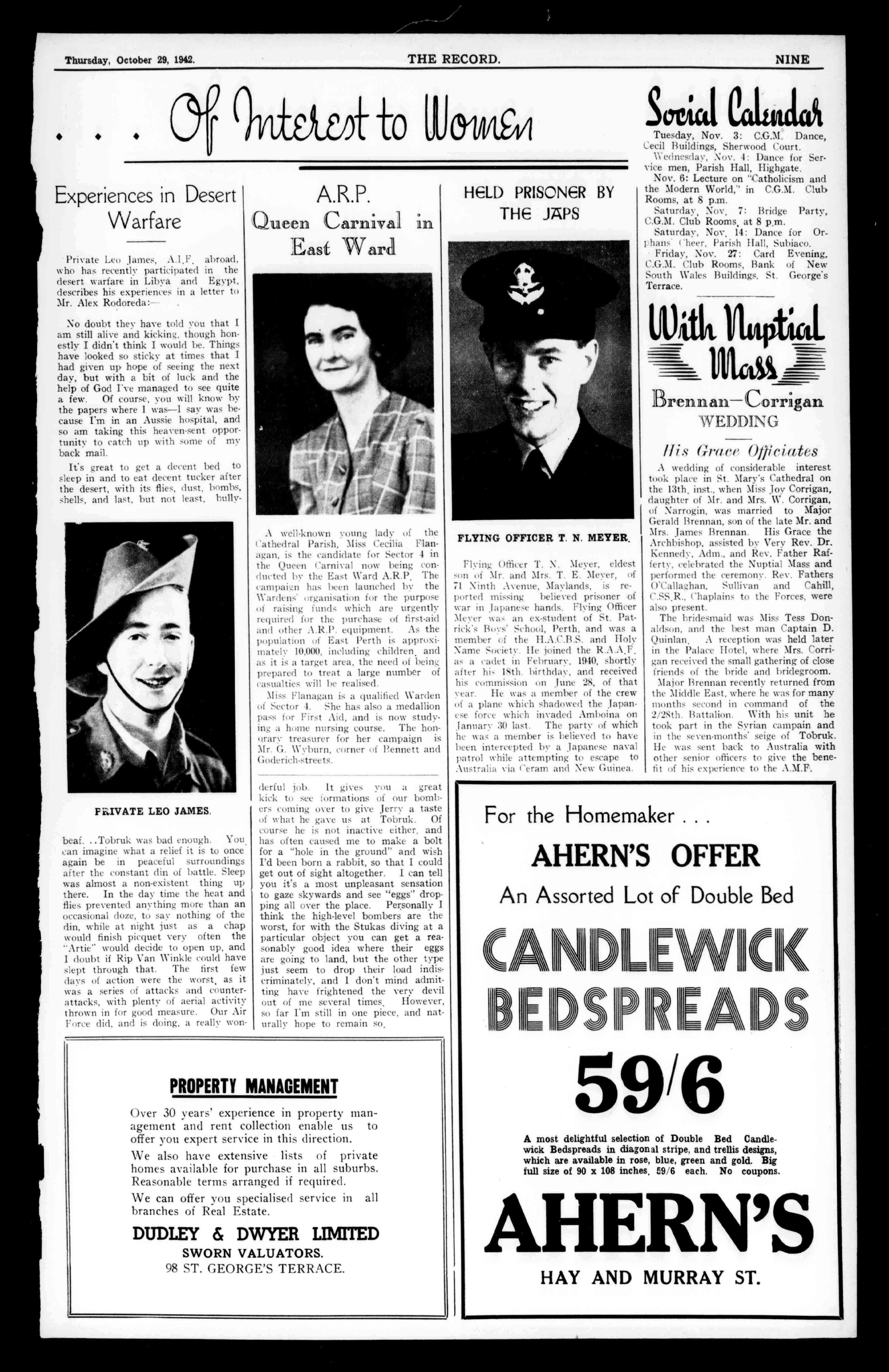 Under10:F.Ryan. Under9:L.Bates. GoldfieldsSection YOUCANDOALLYOURSHOPPINGAT the GOLDFIELDS'5 LEADING EMPORIUM whereyoualwaysget THEBESTOFSERVICE RUSSELL'SKalgoorlie THESHOPFORMEN'SWEAR FORTHEBESTMEATatREASONABLEPRICES,DealfromJas.GrayandCoLtd. WHOLESALEANDRETAILBUTCHERS. UBURTST.,BOULDER,IRDAGHAVENUE,&HANNANIT., KALGOORLIE. Telephones:3168;K675. Telephones:MU;KM. RequiescatopinPace W.STROTHER FUNERALDIRECTOR. 18HANNANST.,KALGOORLIE;COOLGARDIE; MENZIES. AtYourCommandatanytime,DayandNight.Telephone:K327. D.HILL WHOLESALEANDRETAILBUTCHER. NEWCASTLEROAD,MIDLANDJUNCTION. Tel.118Midland. TRUSSEDPOULTRY. PrintedandPublishedbyKeithFrancisSpruhan.at"TheRecord"Office,450HayStreet,Perth.