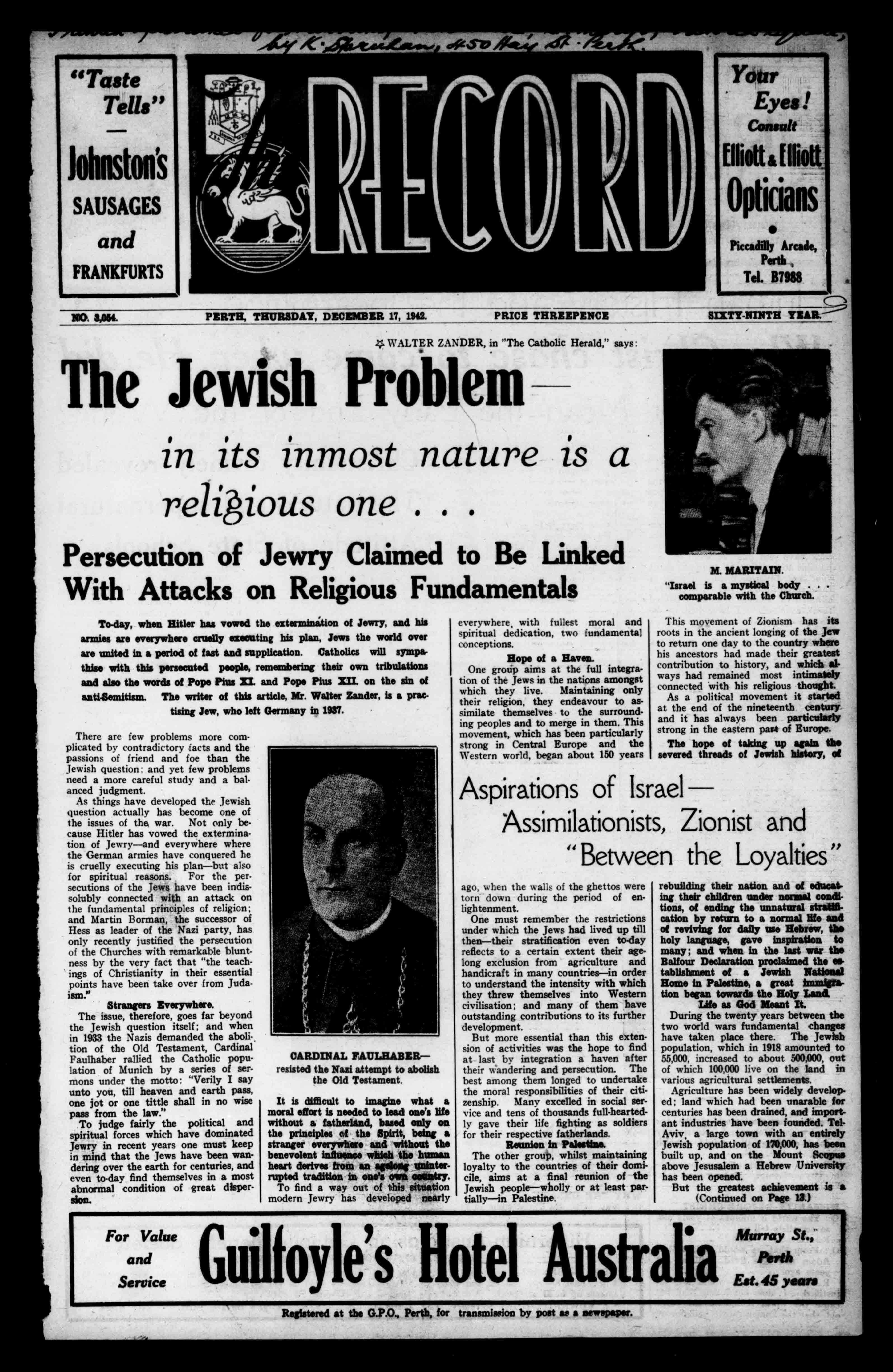 AsthingshavedevelopedtheJewish questionactuallyhasbecomeoneof theissuesofthewar.NotonlybecauseHitlerhasvowedtheexterminationofJewry-andeverywherewhere theGermanarmieshaveconqueredhe iscruellyexecutinghisplan-butalso forspiritualreasons.ForthepersecutionsoftheJewshavebeenindissolublyconnectedwithanattackon thefundamentalprinciplesofreligion; andMartinBorman,thesuccessorof HessasleaderoftheNaziparty,has onlyrecentlyjustifiedthepersecution oftheChurcheswithremarkablebluntnessbytheveryfactthat"theteachingsofChristianityintheiressential pointshavebeentakeoverfromJudaism."