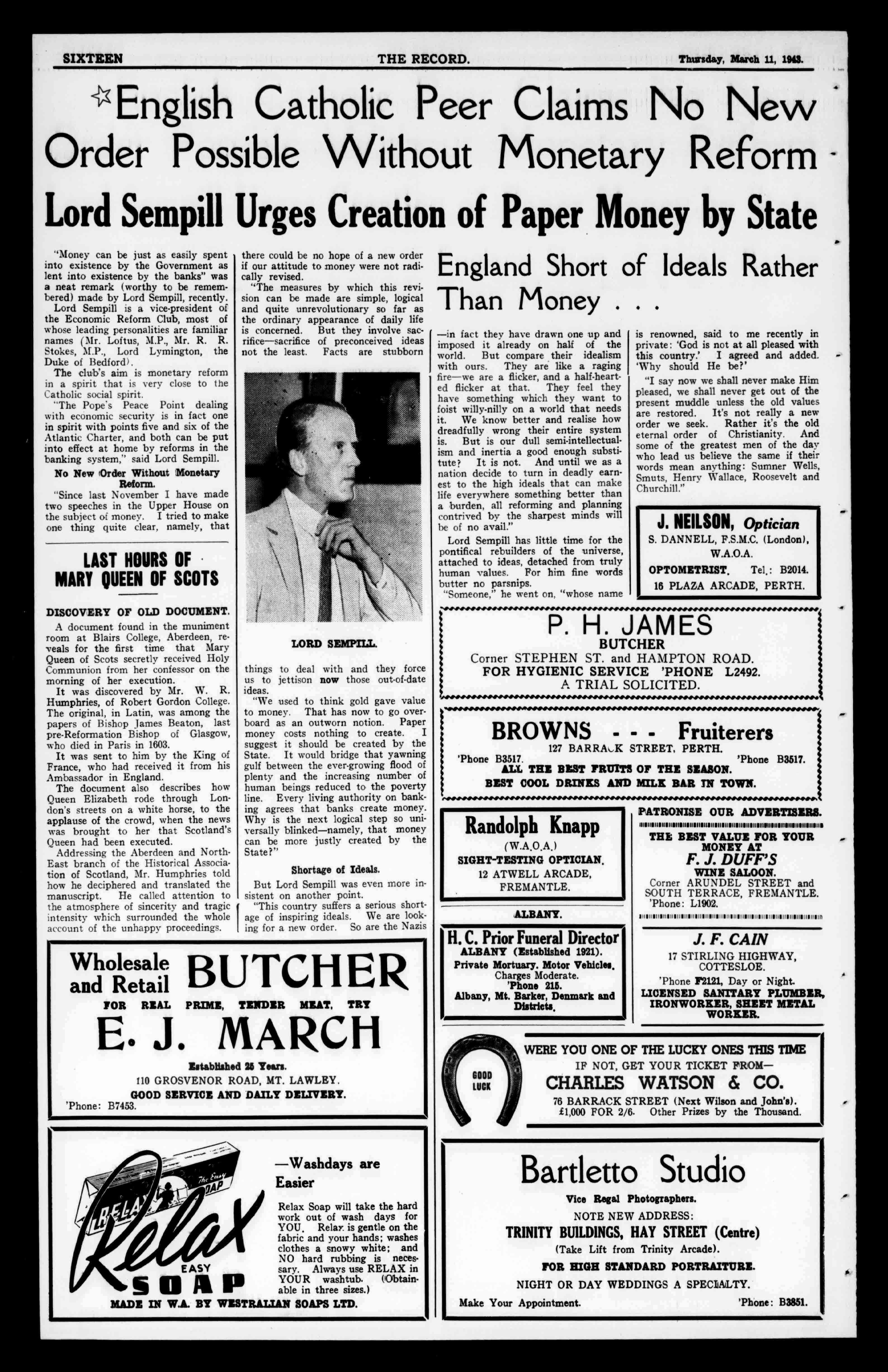 PERTHFISHERIES 489WELLINGTONST..PERTH. FISHANDPOULTRYSUPPLIED. WholesaleandRetail. Phone:B5992. CityDeliveries. CountryOrdersCateredFar. NP.4.11.0.04.04`... -StateSawmillsSPECIALISEIN LOCALTIMBERS STATEPRESSEDBRICKS AND OtherBuilders'Requisites 306MURRAYST.,PERTH AlsoatCountryandMetropolitanYards. Doyouwishtohelpeducateapriest forworkinWesternAustralia?Make aregularannualcontributiontohelp anindigentstudent. SIGHTTESTING BYREGISTERED Opticians Laubman&Pank W.A.S.LIMITED. T.G.SMITH,WA.O.A.,B.A.S., ManagingDirector. 64BARRACKSTREET,PERTH. 'Phone:B3511. BUNBURY. LANDandESTATEAGENT G.H.TEEDE 'Phone31-Private267. SMITH'SBUILDINGS, WELLINGTONST.,BUNBURY. Businesses,Farms,Houses,Land ForSale. KALGOORLIE. J.W.SHEEHAN PrimeBeefButcher HANNANST..KALGOORLIE. MARITANASTREET. Tel.438 TeL438 B RENNANS OULDER LIMITED FORQUALITYDRAPERY, LADIES'ANDGENTS' CLOTHING, MANCHESTERAN.) FURNISHINGS.