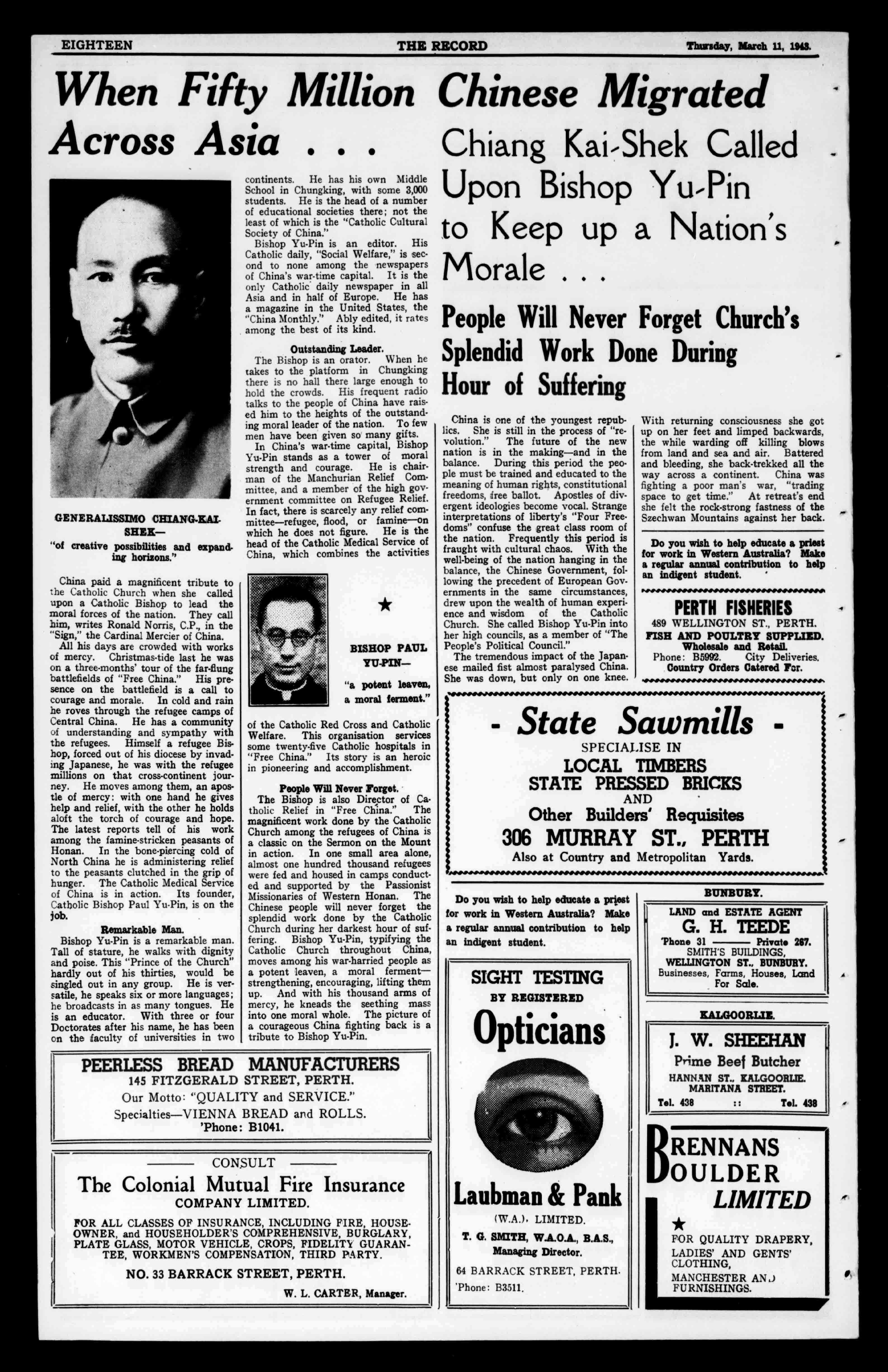 Chinaisoneoftheyoungestrepublics.Sheisstillintheprocessof"revolution."Thefutureofthenew nationisinthemaking-andinthe balance.Duringthisperiodthepeoplemustbetrainedandeducatedtothe meaningofhumanrights,constitutional freedoms,freeballot.Apostlesofdivergentideologiesbecomevocal.Strange interpretationsofliberty's"FourFreedoms"confusethegreatclassroomof thenation.Frequentlythisperiodis fraughtwithculturalchaos.Withthe well-beingofthenationhanginginthe balance,theChineseGovernment,followingtheprecedentofEuropeanGovernmentsinthesamecircumstances, drewuponthewealthofhumanexperienceandwisdomoftheCatholic Church.ShecalledBishopYu-Pininto herhighcouncils,asamemberof"The People'sPoliticalCouncil." ThetremendousimpactoftheJapanesemailedfistalmostparalysedChina. Shewasdown,butonlyononeknee.