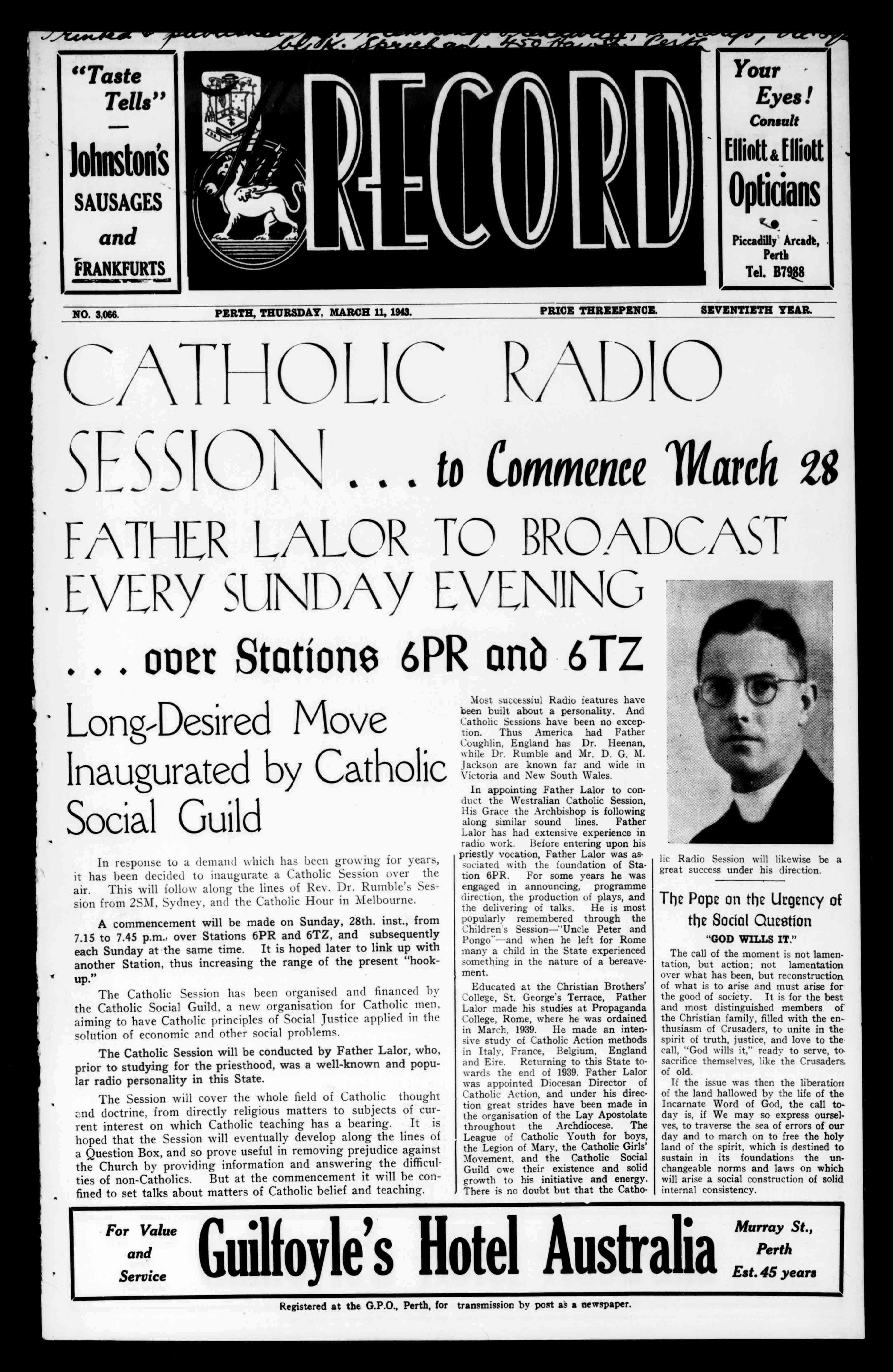 EducatedattheChristianBrothers' College,St.George'sTerrace,Father LalormadehisstudiesatPropaganda College,Rome,wherehewasordained inMarch,1939.HemadeanintensivestudyofCatholicActionmethods inItaly,France,Belgium,England andEire.ReturningtothisStatetowardstheendof1939.FatherLalor wasappointedDiocesanDirectorof CatholicAction,andunderhisdirectiongreatstrideshavebeenmadein theorganisationoftheLayApostolate throughouttheArchdiocese.The LeagueofCatholicYouthforboys, theLegionofMary,theCatholicGirls' Movement.andtheCatholicSocial Guildowetheirexistenceandsolid growthtohisinitiativeandenergy. ThereisnodoubtbutthattheCatho-