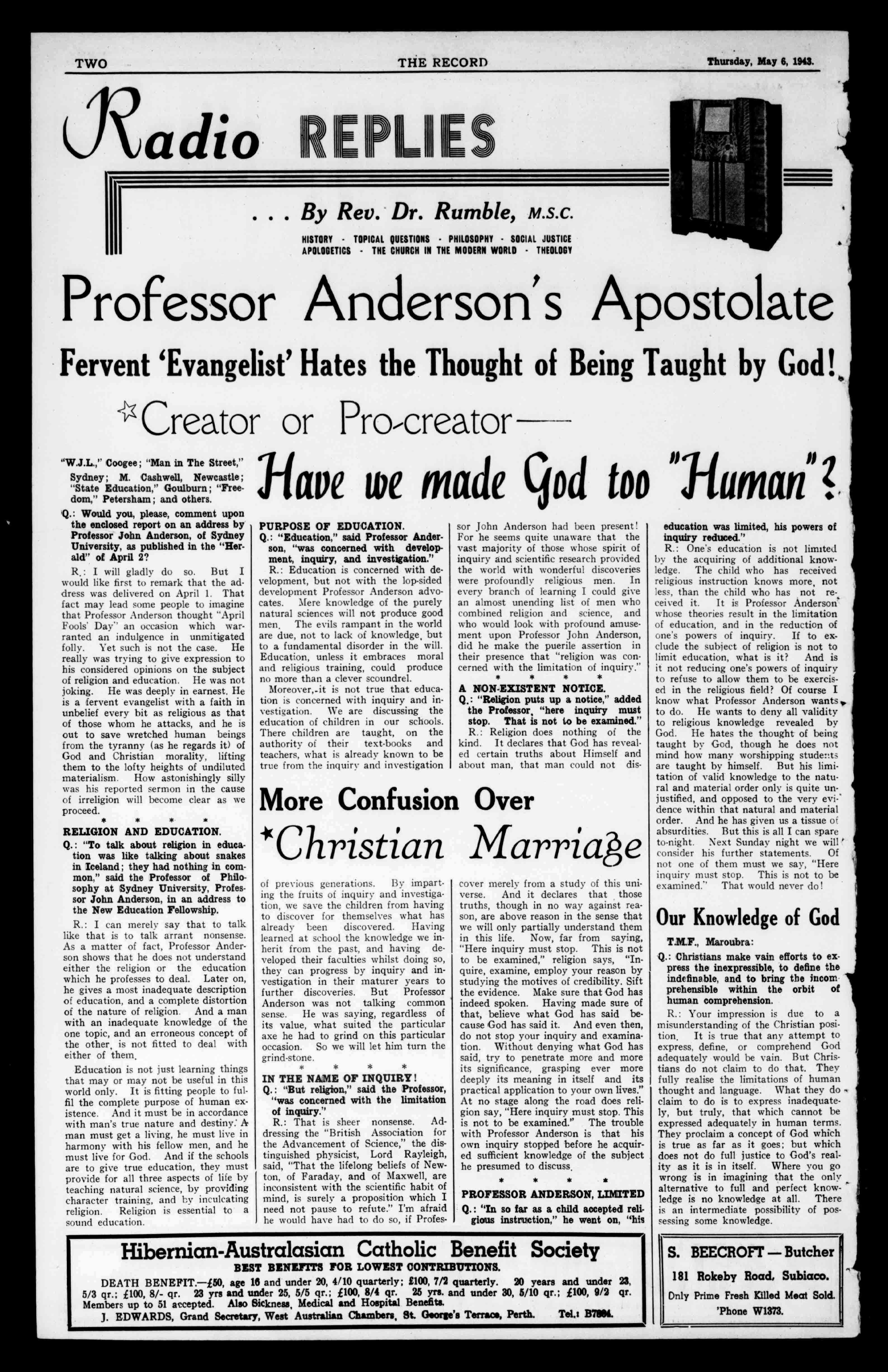 R.:One'seducationisnotlimited bytheacquiringofadditionalknowledge.Thechildwhohasreceived religiousinstructionknowsmore,not less,thanthechildwhohasnotreceivedit.ItisProfessorAnderson whosetheoriesresultinthelimitation ofeducation,andinthereductionof one'spowersofinquiry.Iftoexcludethesubjectofreligionisnotto limiteducation,whatisit?Andis itnotreducingone'spowersofinquiry torefusetoallowthemtobeexercisedinthereligiousfield?OfcourseI knowwhatProfessorAndersonwants,. todo.Hewantstodenyallvalidity toreligiousknowledgerevealedby God.Hehatesthethoughtofbeing taughtbyGod,thoughhedoesnot mindhowmanyworshippingstudents aretaughtbyhimself.Buthislimitationofvalidknowledgetothenaturalandmaterialorderonlyisquiteunjustified,andopposedtotheveryevi-. dencewithinthatnaturalandmaterial order.Andhehasgivenusatissueof absurdities.ButthisisallIcanspare to-night.NextSundaynightwewill' considerhisfurtherstatements.Of notoneofthemmustwesay,"Here inquirymuststop.Thisisnottobe examined."Thatwouldneverdo