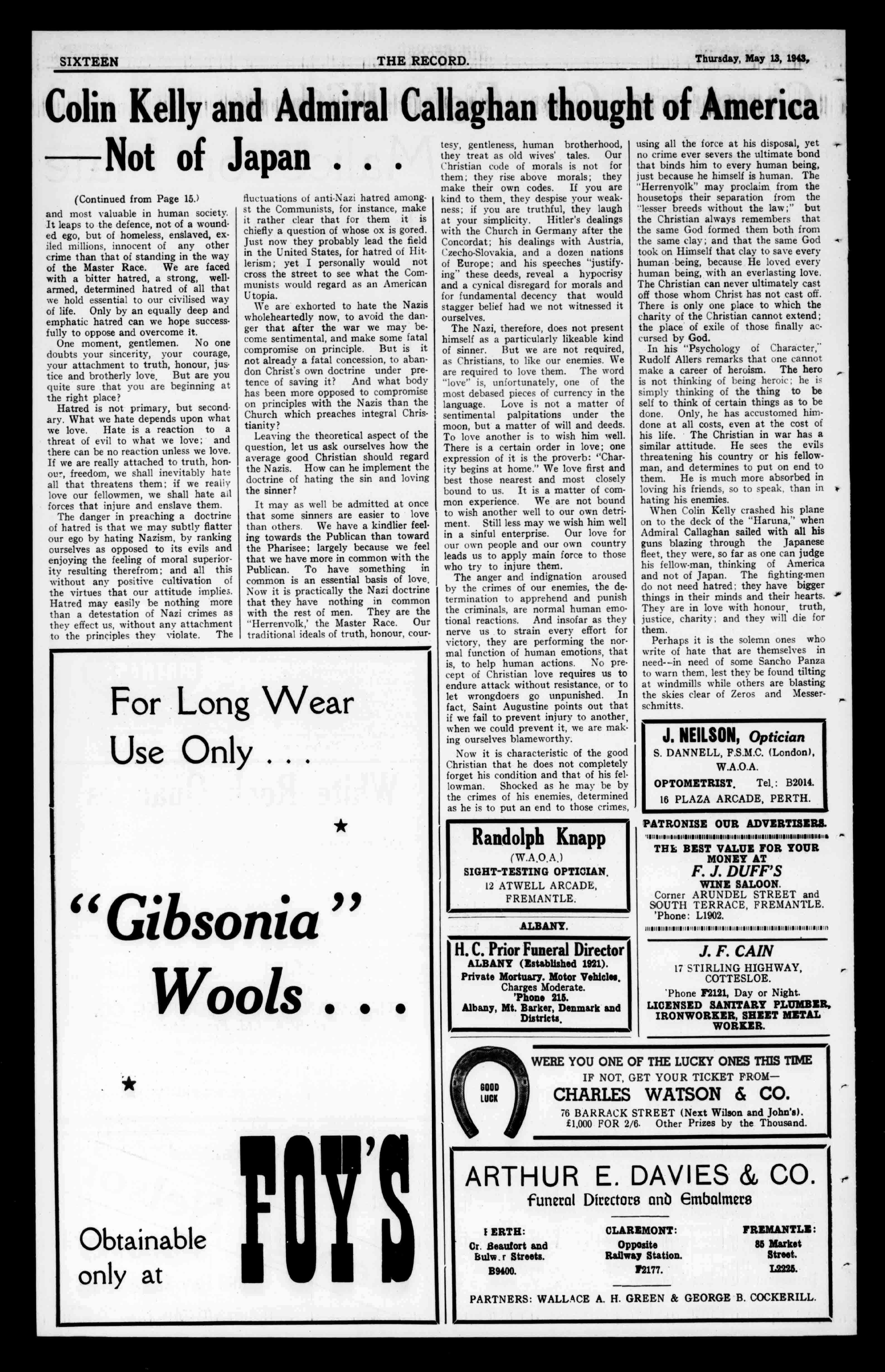 Make aregularannualcontributiontohelp anindigentstudent. LGHTTESTING BYREGISTERED Opticians Laubman&Pak (W.A.).LIMITED. T.G.SMITH,W.110A., ManagingDirector. 64BARRACKSTREET,PERTH. Phone:B3511. BUNBURY. LANDandESTATEAGENT G.H.'IUDE 'Phone31 Private267. SMITHSBUILDINGS, WELLINGTONST..BUNBURY. Businesses,Farms,Houses,Land ForSale. KALGOORLIE. J.W.SHEEHAN PrimeBeefButcher HANNANST.,KALGOORLIE. MARITANASTREET. Tel.438 Tel.438 B RENNANS OULDER LIMITED FORQUALITYDRAPERY, LADIES'ANDGENTS' CLOTHING, MANCHESTERAN5 FURNISHINGS.