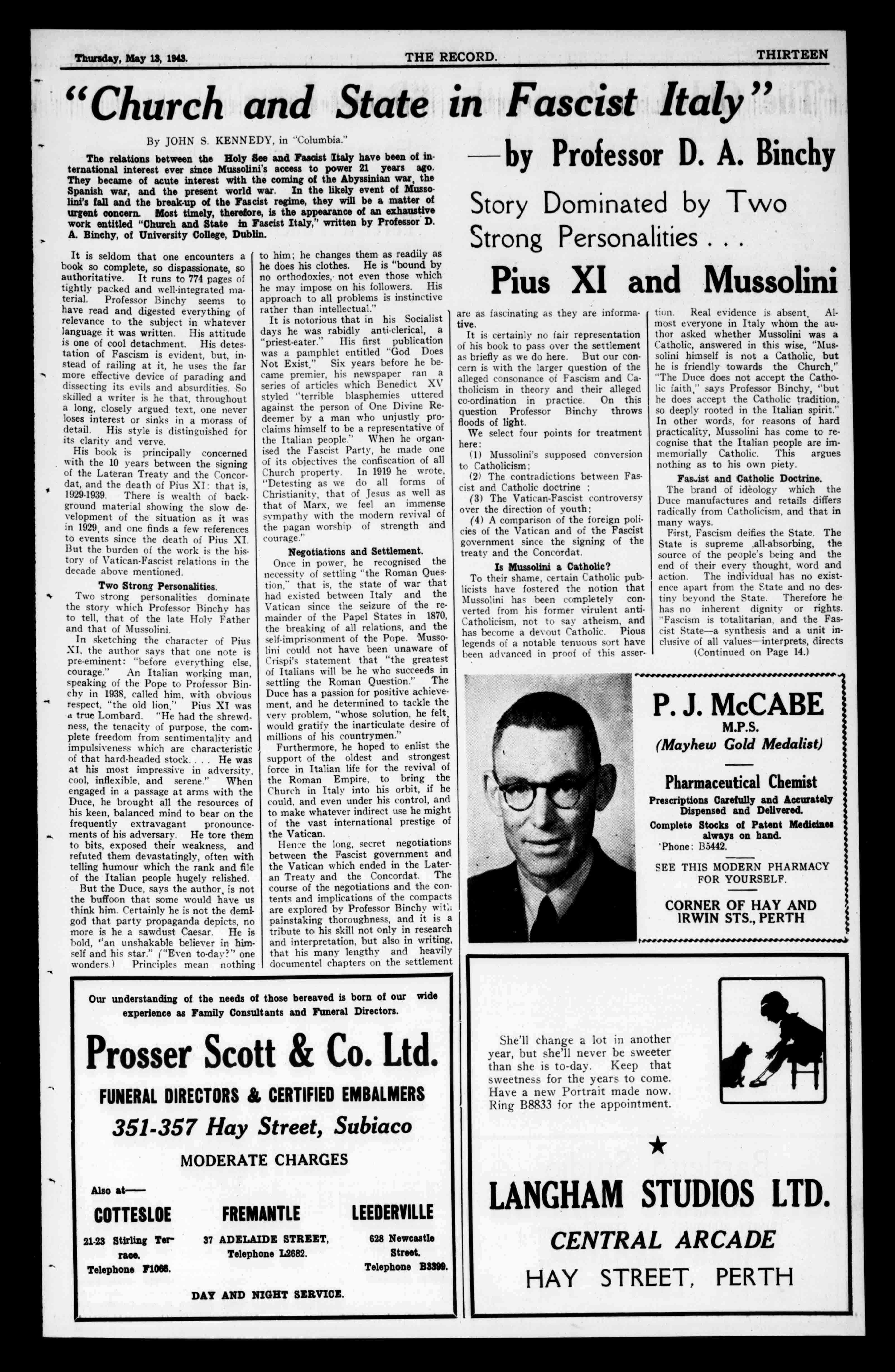 "PiusXII's'peaceprinciples'fitin verywellwiththosesetdowninthe AtlanticCharter,whereinRoosevelt andChurchilloutlinedAnglo-American waraims.Indeed,theonlydifferencebetweenthePope'speaceplans andoursisthatthePopehasexpandedhiswithfargreaterdetail.Heforesees,forexample,thenecessitynot onlyofprovidingsecurityforsmall nations,butalsoforsmallethnicminoritieswhichformapartoflarger States.Healsoadvocatesaneconomicsystemwherebynationswithout Tel.:MU149.
