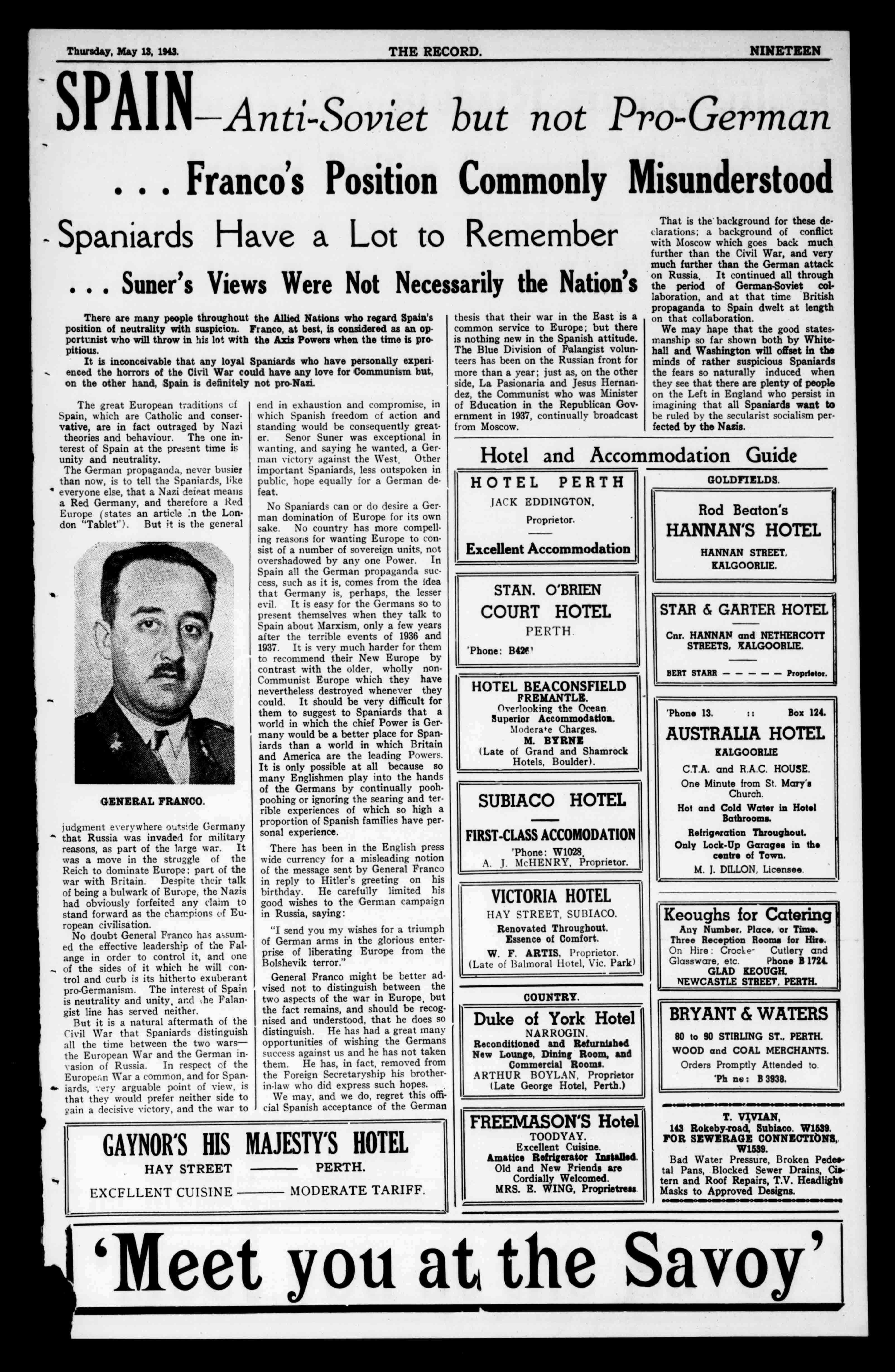 OneMinutefromSt.Mary's Church. HotandColdWaterinHotel Bathrooms. RefrigerationThroughout. OnlyLock-UpGaragesinthe centreofTown. M.J.DILLON,Licensee KeoughsforCatering AnyNumber,Place,orTime. ThreeReceptionRoomsforHire. OnHireCrock,Cutleryand Glassware,etc. PhoneB1724. GLADKEOUGH. NEWCASTLESTREET.PERTH. BRYANT&WATERS 80to90STIRLINGST..PERTH. WOODandCOALMERCHANTS. OrdersPromptlyAttendedto 'Phlab B3938. T.VIVIAN, 149Rokeby-road,Subiaco.W1639. FORSEWERAGECONNECTIONS, W1539. BadWaterPressure,BrokenPedestalPans,BlockedSewerDrains,Cis. ternandRoofRepairs,T.V.Headlight MaskstoApprovedDesigns. `MeetyouattheSavoy'