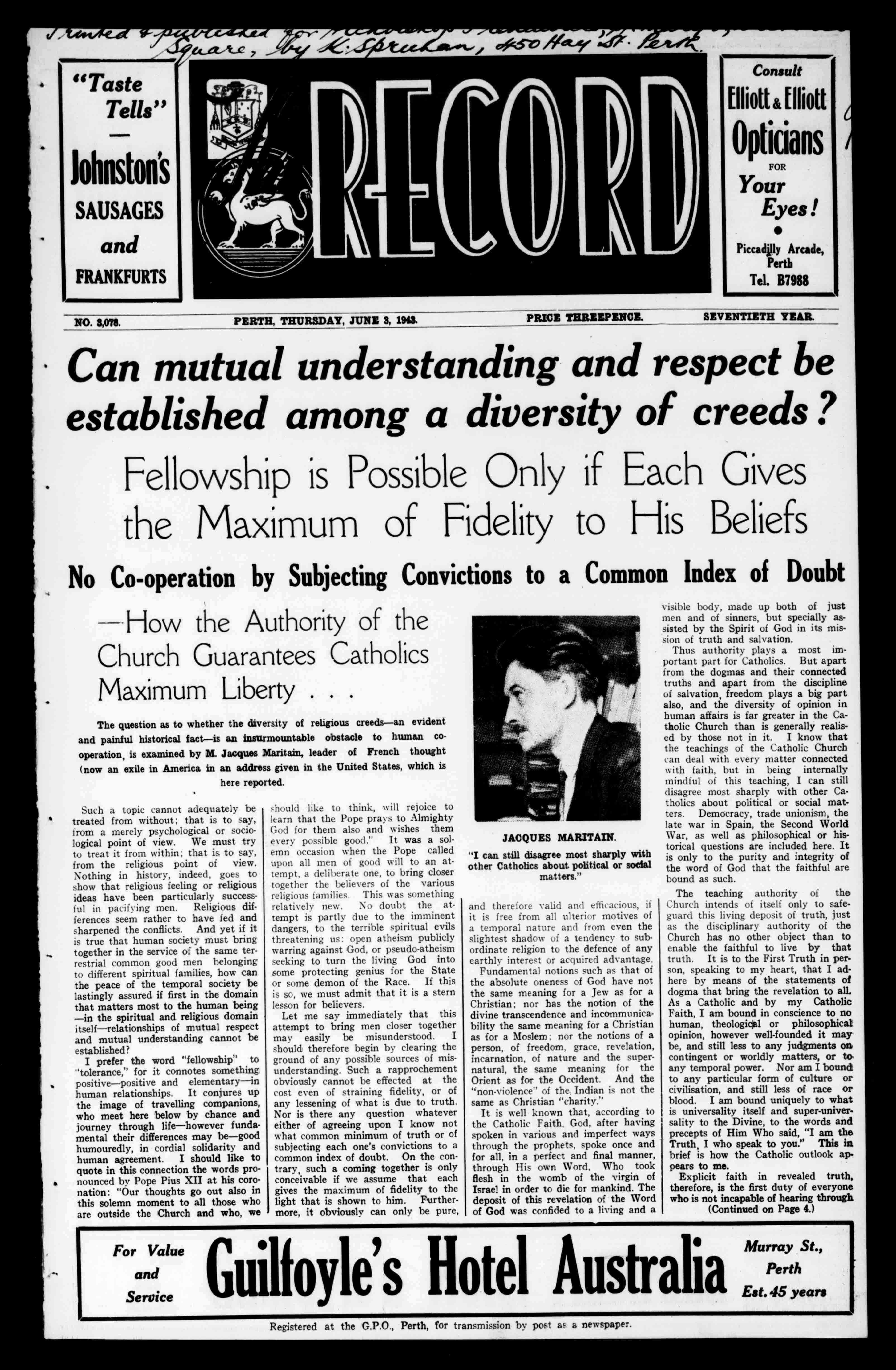 Johnston's SAUSAGES and FRANKFURTS NO.3,075. Consult Elliott&Elliott Opticians FOR Your Eyes! PiccadillyArcade, Perth Tel.B7988 PERTH,THURSDAY,JUNE3,i943 PRICETHREEPENCE. SEVENTIETHYEAR. Canmutualunderstandingandrespectbe establishedamongadiversityofcreeds FellowshipisPossibleOnlyifEachGives