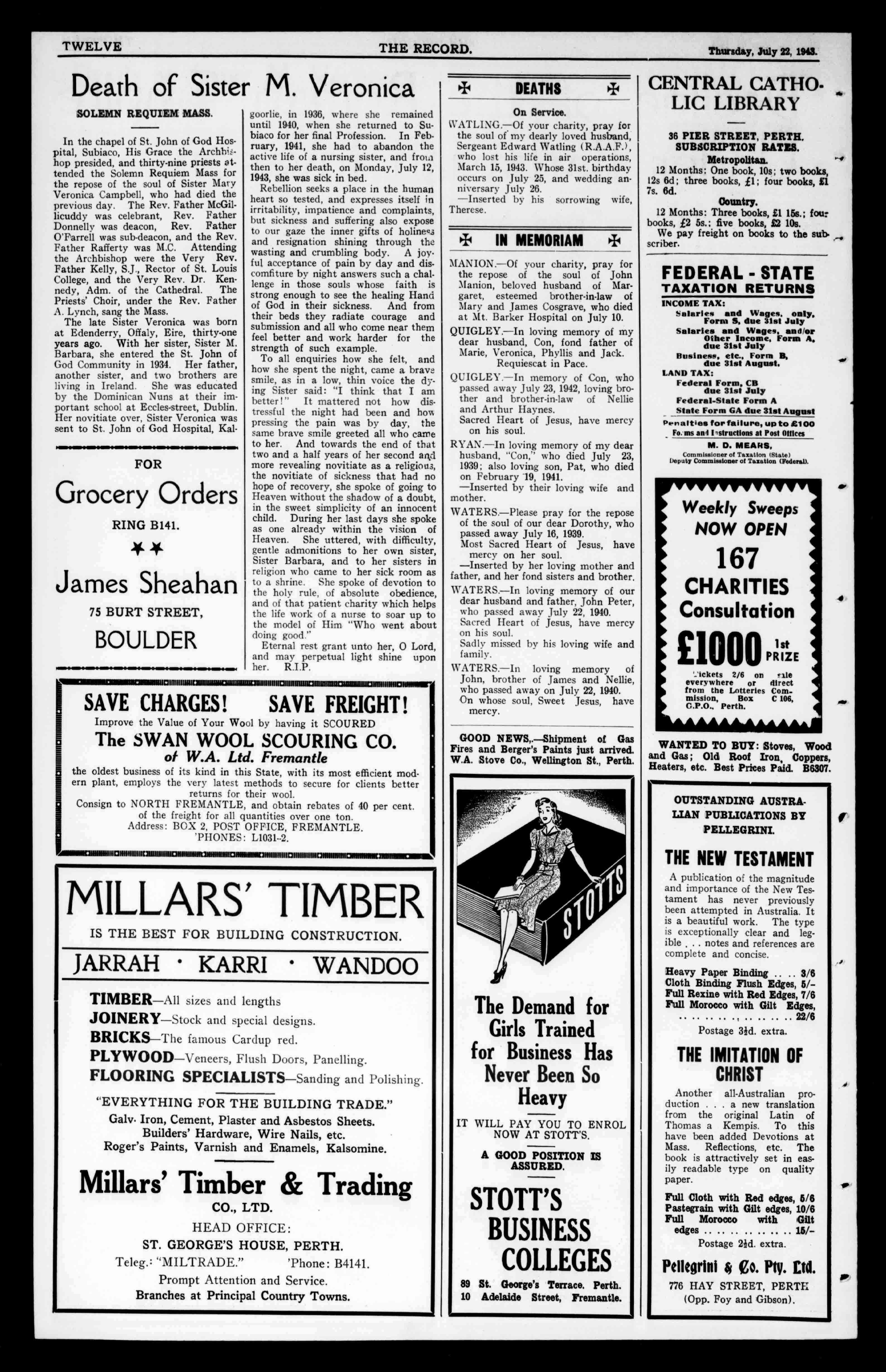 helpedthesoldiersbyfillinginfive cardsfortheCatholicGirls'Movementp candidate.DaphneDudleyismyaunty, sowerewereverypleasedwhenshe won.Well,dearAuntBessy,Imust closenow.Hopingyouarewell. LESLEYCARR. DearLesley,-Itislovelytohear yousayyouarehappytogiveyour penniestotheBushies,andIhopethe InfantJesuswillbles.;allthelittle boysandgirlsofHighgatewhoare generousenoughtogivetheirpennies tosomeonewhoisreallyisneedof them.Weareallverythrilledthat yourauntwonthecompetition,too, Lesley. AUNTBESSY GoldfieldsSection YOUCANDOALLYOURSHOPPINGAT the GOLDFIELDS' tic LEADING EMPORIUM 1 whereyoualwaysget THEBESTOFSERVICE. MAKE W.GlassonYOURTAILOR KALGOORLIE RUSSELL'SKalgoorlie THESHOPFORMEN'SWEAR FORTHEBESTMEATatREASONABLEPRICES,DealfromJas.GrayandCo.Ltd. WHOLESAL-ANDRETAILBUTCHERS. 63BURTST.,13017LUR,ARDAGHAVENUE,&HANNANST., KAL000RLIZ. Telephones:B168;K876. Telephones:B168;1876. RequiescatIIIinPace W.STROTHER FUNERALDIRECTOR. 18HANNANST.,KALGOORLIE;COOLGARDIE, MENZIES. AtYourCommandatanytime,DayandNight.Telephone:X327. ForExquisiteMildnessandTenderness andFineFlavourAlways. BehnsLimited QualityMeatsandSmallgoods TWOBIGBARRACKSTREETSTORES, ForYourConvenienceonEitherSide. PrintedandPublishedbyKeithFrancisSpruhan,at"TheRecord"Office,450HayStreet,Perth.