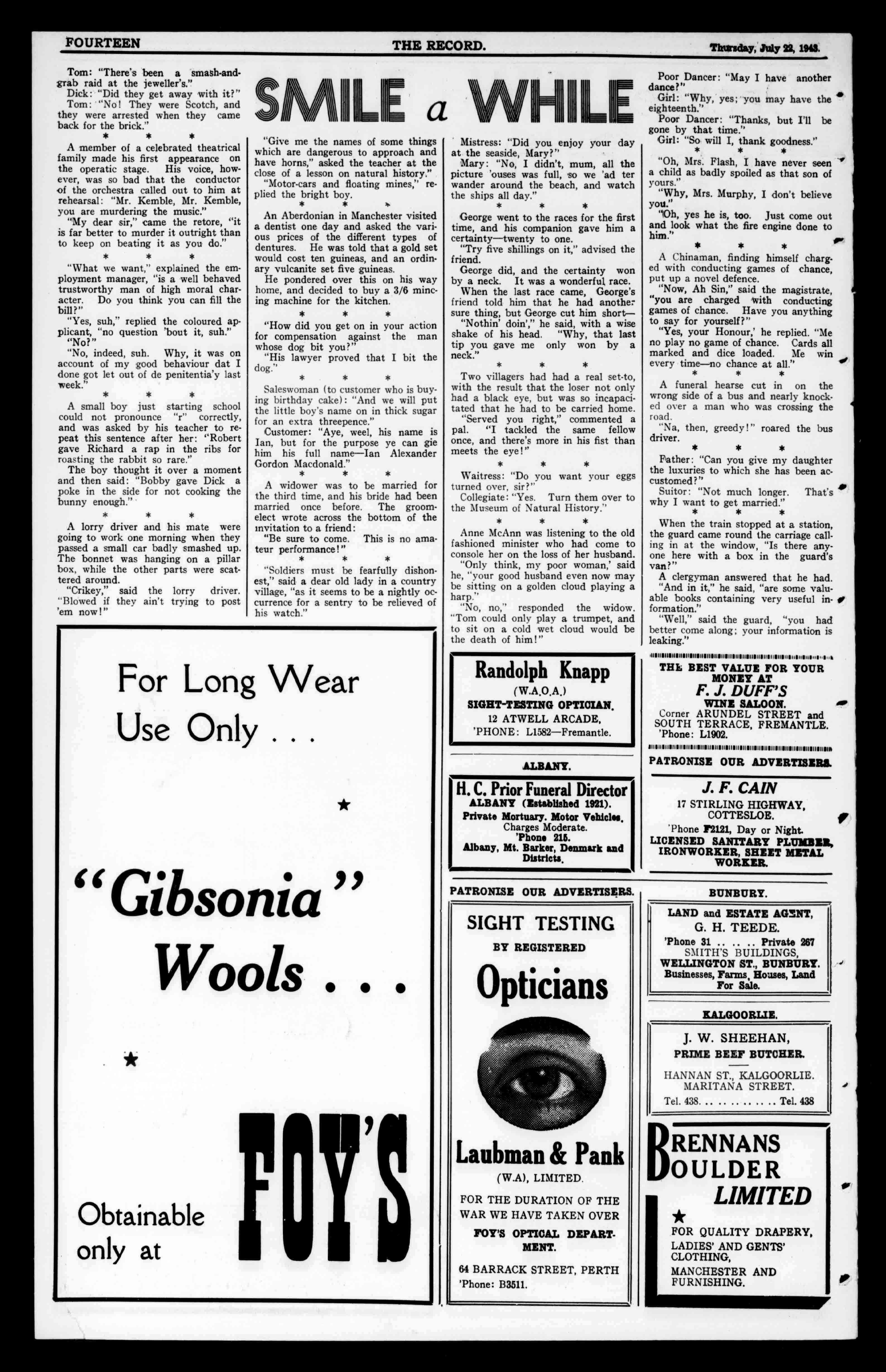L1902. PATRONISEOURADVERTISERS. J.F.CAIN 17STIRLINGHIGHWAY, COTTESLOE. PhoneF2121,DayorNight. LICENSEDSANITARYPLU3132ft,IRONWORKER,SHEETMETAL WORKER. PATRONISEOURADVERTISERS SIGHTTESTING BYREGISTERED Opticians Laubman&Pank (W.A),LIMITED. FORTHEDURATIONOFTHE WARWEHAVETAKENOVER FOY'SOPTICALDEPARTMENT. 64BARRACKSTREET,PERTH 'Phone:B3511. BUNBURY, LANDandESTATEAGENT, G.H.TEEDE. 'Phone31 Private267 t-,NlITHSBUILDINGS, WELLINGTONST.,BUNBURY. Businesses,Farms,Houses,Land ForSale. EALCr00RLIE. J.W.SHEEHAN, PRIMEBEEFBUTCHER. HANNANST.,KALGOORLIE. MARITANASTREET. Tel.438... Tel.438 BRENNANS OULDER LIMITED FORQUALITYDRAPERY, LADIES'ANDGENTS' CLOTHING, MANCHESTERAND FURNISHING. V
