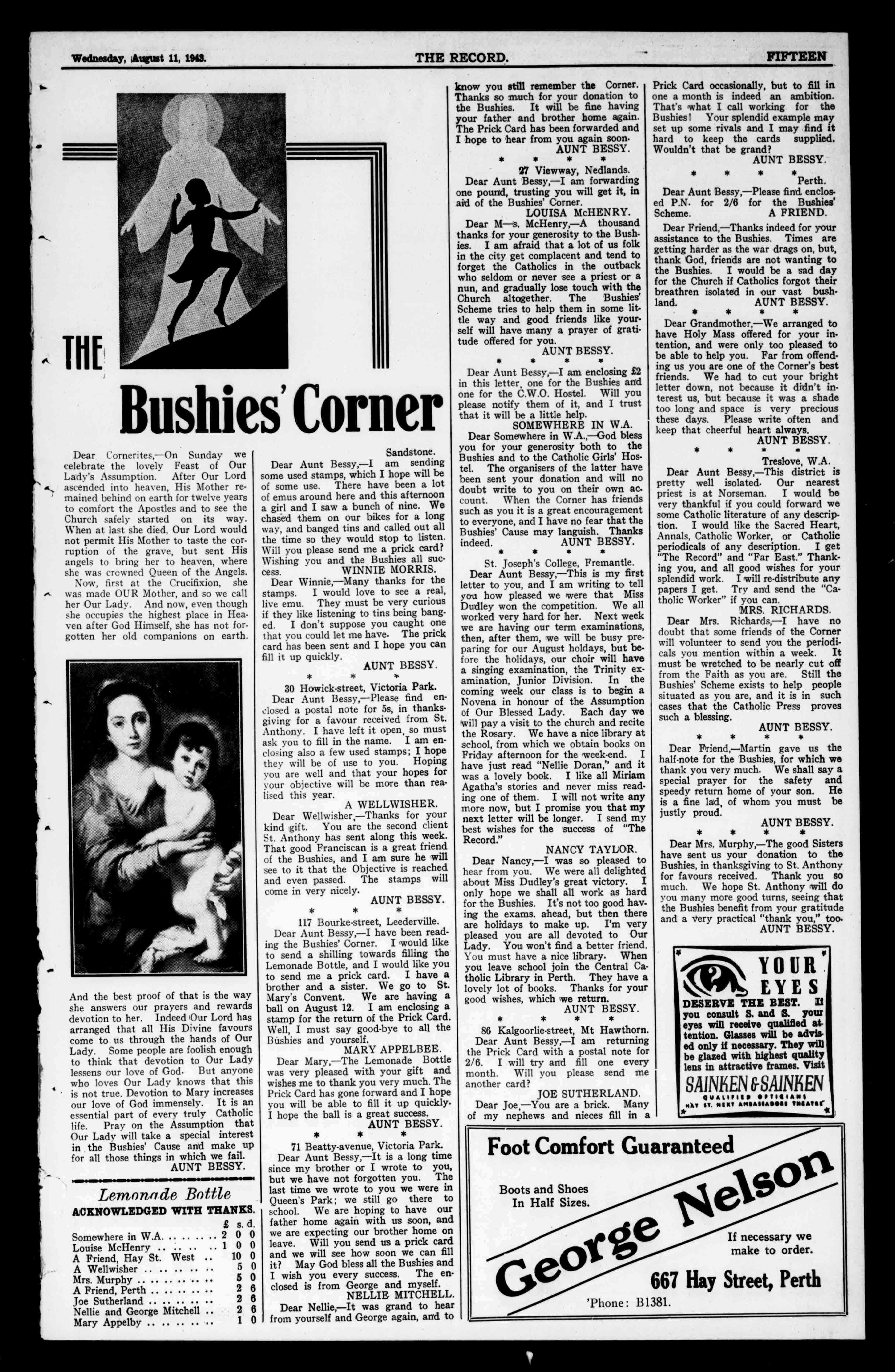 DearAuntBessy,-Iamenclosing£2 inthisletter,onefortheBusbiesand onefortheC.W.O.Hostel.Willyou pleasenotifythemofit,andItrust thatitwillbealittlehelp. SOMEWHEREINW.A. DearSomewhereinWA.,-Godbless youforyourgenerositybothtothe BusbiesandtotheCatholicGirls'Hostel.Theorganisersofthelatterhave beensentyourdonationandwillno doubtwritetoyouontheirownaccount.WhentheCornerhasfriends suchasyouitisagreatencouragement toeveryone,andIhavenofearthatthe Bushies'Causemaylanguish.Thanks indeed. AUNTBESSY.