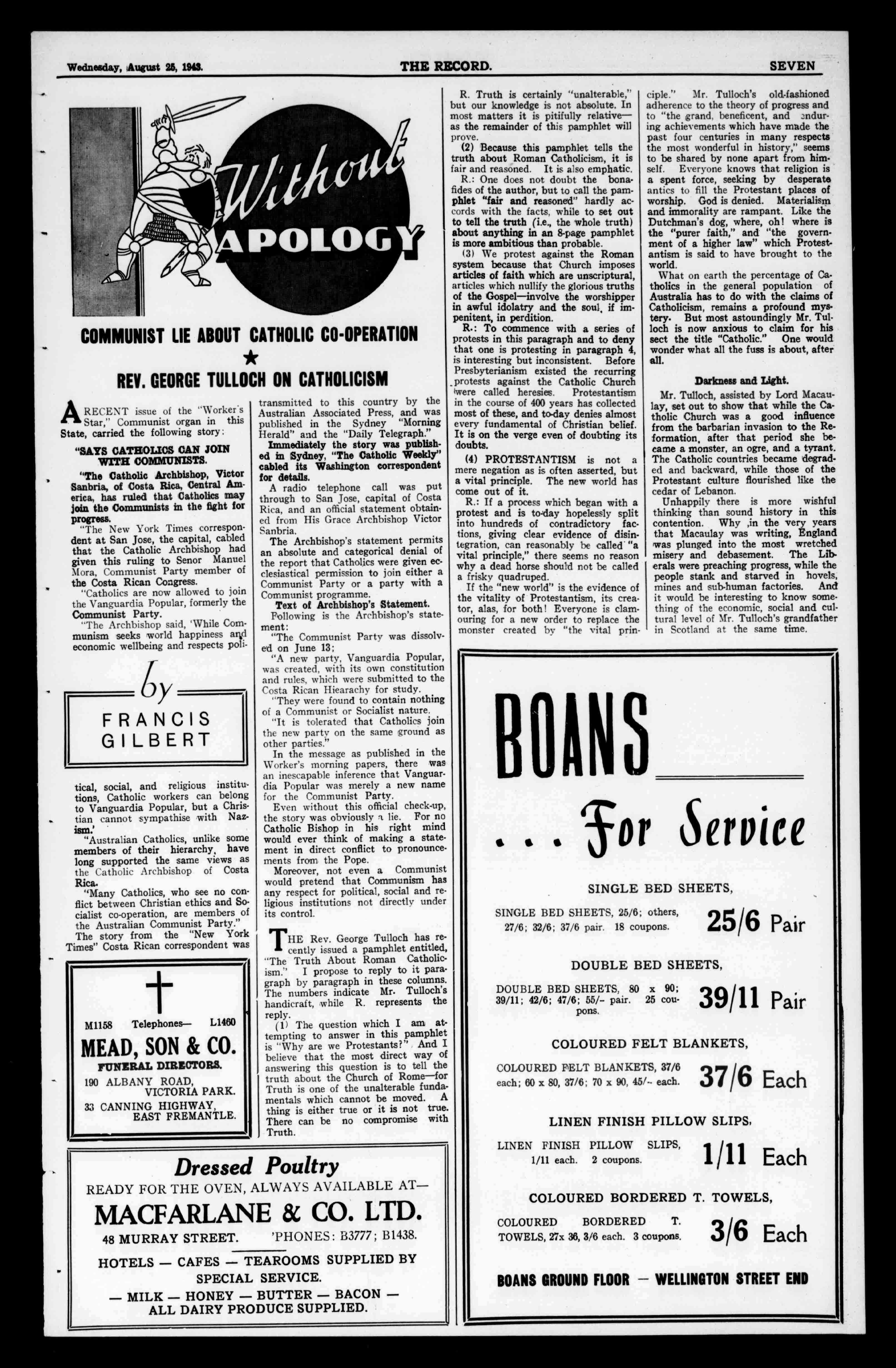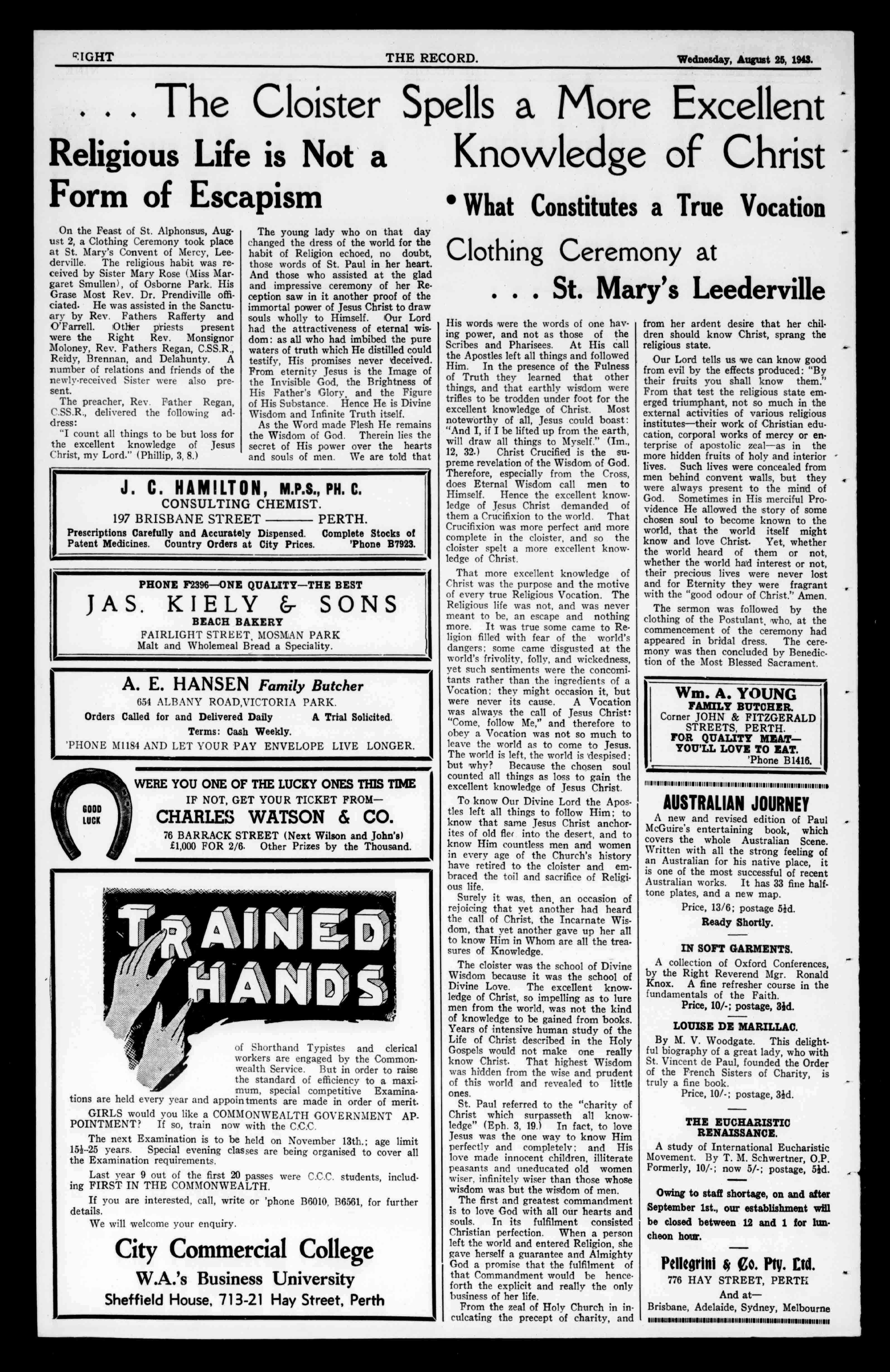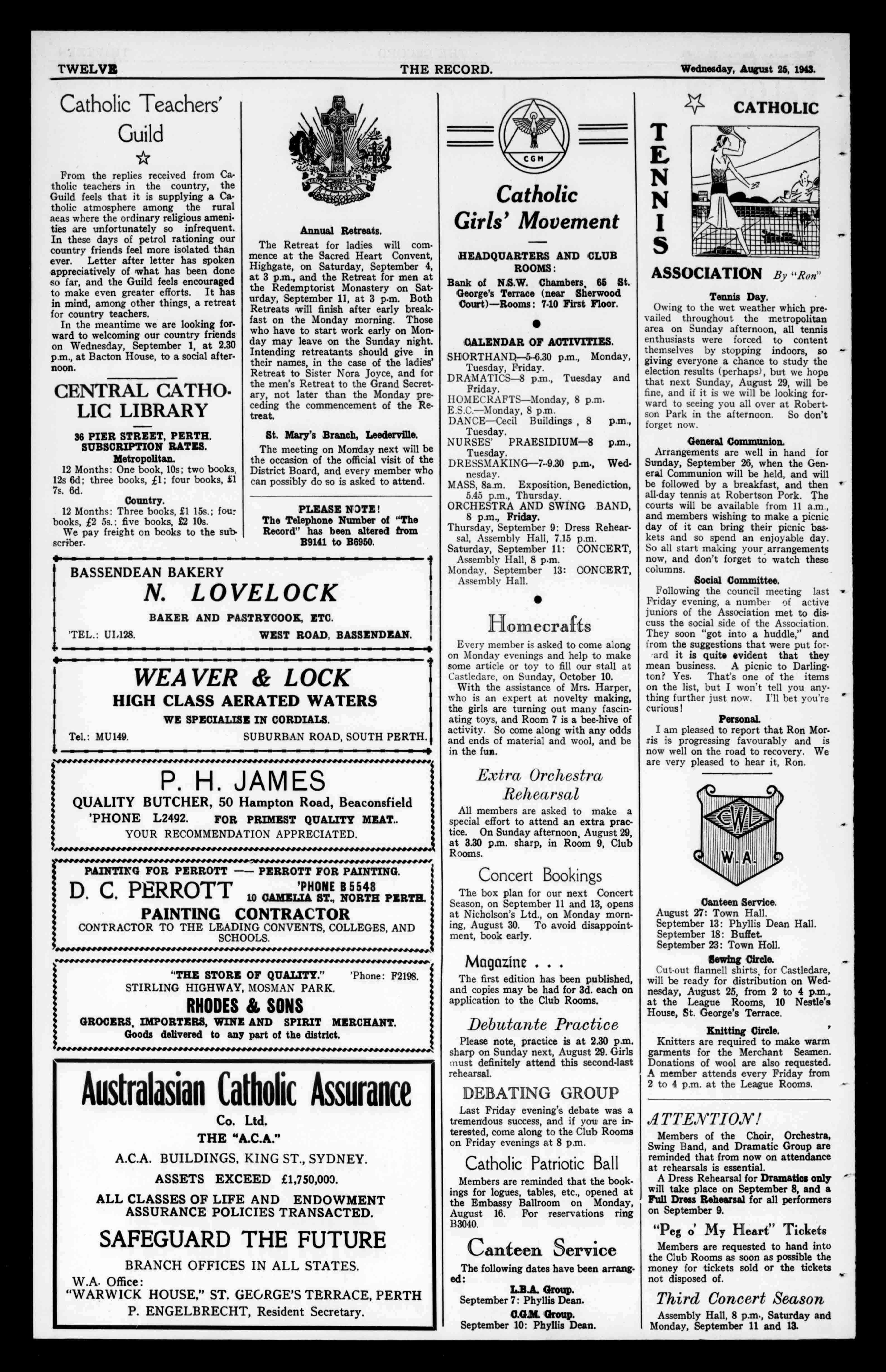 Telephones:B168;1.675. CONSULT withour ADVERTISERS forallyour REQUIREMENTS theRecord OfficialOrganoftheArchdioceseofPerth ESTABLISHED1874 CHMA.GLASSandPLATED WAREIMPORTERS. OTLEYPLACE,OffMURRAY STREET(RocaSavoyHotel) Convents,Colleges,Institutions andSchoolsSpeciallyCateredfor. PriceListsandCatalogueon Application. PhoneB9651. Kelly&Rodoreda LateofJOHNDYNON&CO.