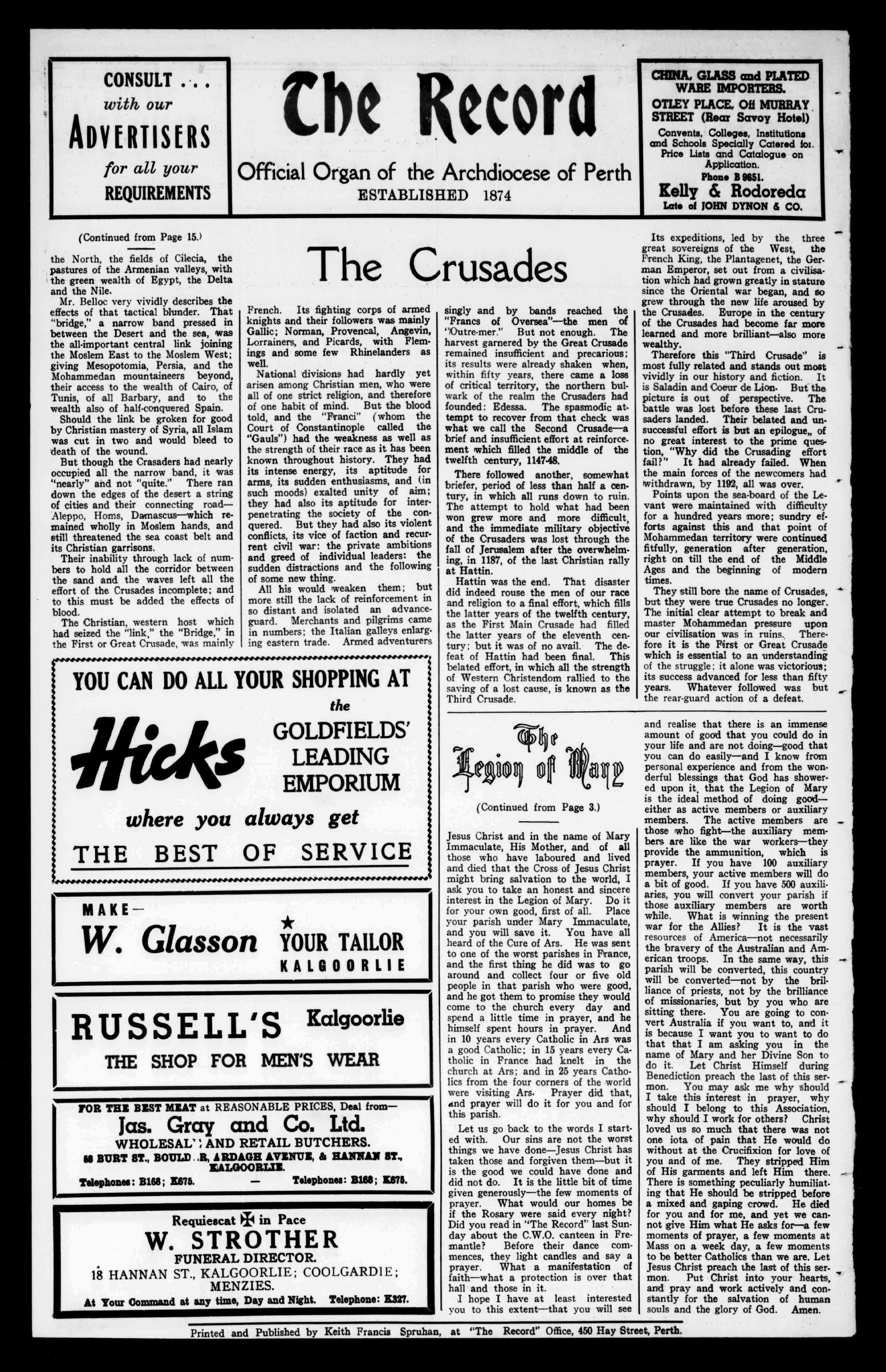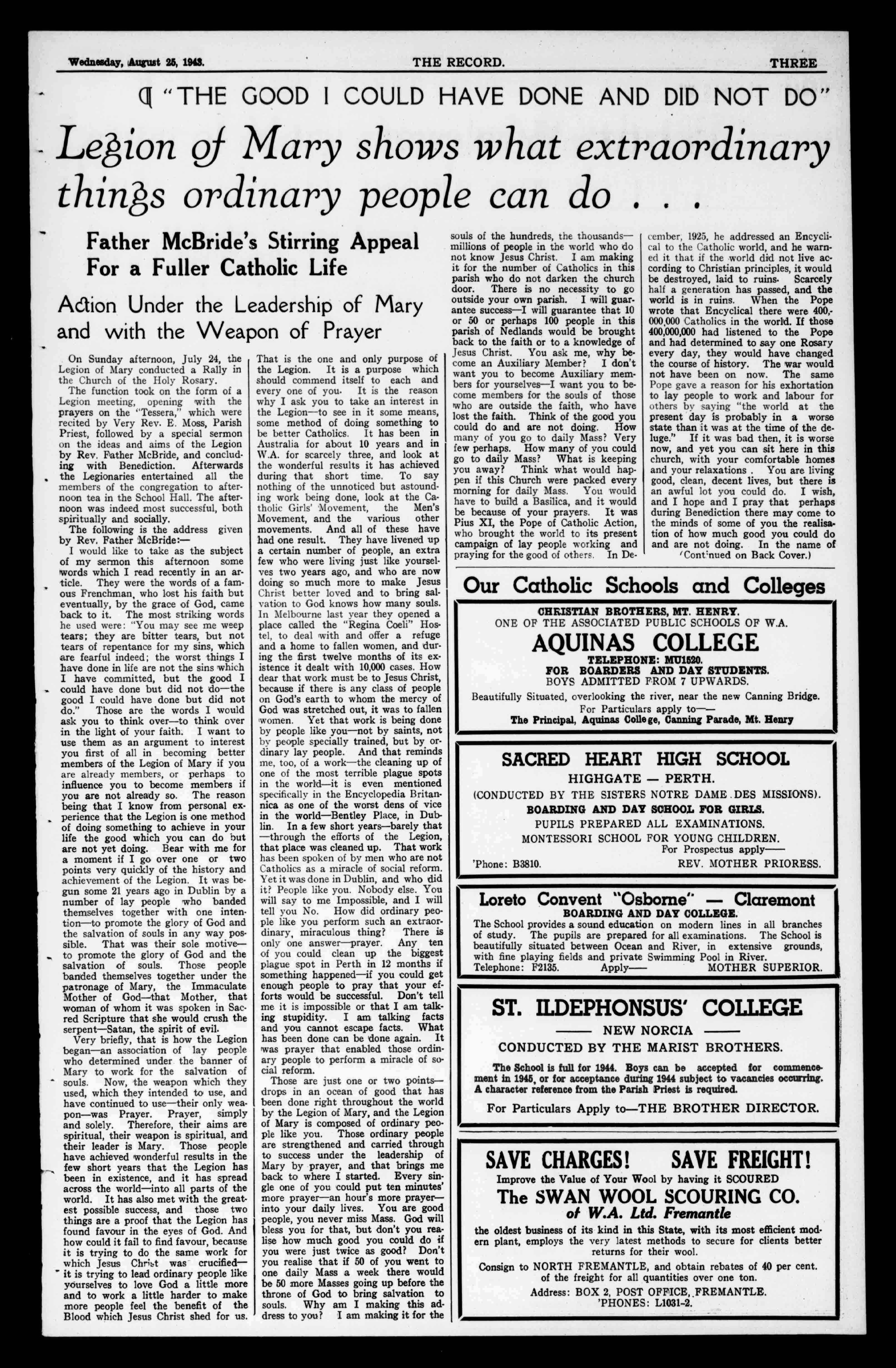 Thatistheoneandonlypurposeof theLegion.Itisapurposewhich shouldcommenditselftoeachand everyoneofyou.Itisthereason whyIaskyoutotakeaninterestin theLegion-toseeinitsomemeans, somemethodofdoingsomethingto bebetterCatholics.Ithasbeenin Australiaforabout10yearsandin W.A.forscarcelythree,andlookat thewonderfulresultsithasachieved duringthatshorttime.Tosay nothingoftheunnoticedbutastoundingworkbeingdone,lookattheCatholicGirls'Movement,theMen's Movement,andthevariousother movements.Andallofthesehave hadoneresult.Theyhavelivenedup acertainnumberofpeople,anextra fewwhowerelivingjustlikeyourselvestwoyearsago,andwhoarenow doingsomuchmoretomakeJesus ChristbetterlovedandtobringsalvationtoGodknowshowmanysouls. InMelbournelastyeartheyopeneda placecalledthe"ReginaCoeli"Hostel,todealwithandofferarefuge andahometofallenwomen,andduringthefirsttwelvemonthsofitsexistenceitdealtwith10,000cases.How clearthatworkmustbetoJesusChrist, becauseifthereisanyclassofpeople onGod'searthtowhomthemercyof Godwasstretchedout,itwastofallen women.Yetthatworkisbeingdone bypeoplelikeyou-notbysaints,not bypeoplespeciallytrained,butbyordinarylaypeople.Andthatreminds me,too,ofawork-thecleaningupof oneofthemostterribleplaguespots intheworld-itisevenmentioned specificallyintheEncyclopediaBritannicaasoneoftheworstdensofvice intheworld-BentleyPlace,inDublin.Inafewshortyears-barelythat -throughtheeffortsoftheLegion, thatplacewascleanedup.Thatwork hasbeenspokenofbymenwhoarenot Catholicsasamiracleofsocialreform. YetitwasdoneinDublin,andwhodid it?Peoplelikeyou.Nobodyelse.You willsaytomeImpossible,andIwill tellyouNo.Howdidordinarypeoplelikeyouperformsuchanextraordinary,miraculousthing?Thereis onlyoneanswer--prayer.Anyten ofyoucouldcleanupthebiggest plaguespotinPerthin12monthsif somethinghappened-ifyoucouldget enoughpeopletopraythatyoureffortswouldbesuccessful.Don'ttell meitisimpossibleorthatIamtalkingstupidity.Iamtalkingfacts andyoucannotescapefacts.What hasbeendonecanbedoneagain.It wasprayerthatenabledthoseordinarypeopletoperformamiracleofsocialreform.