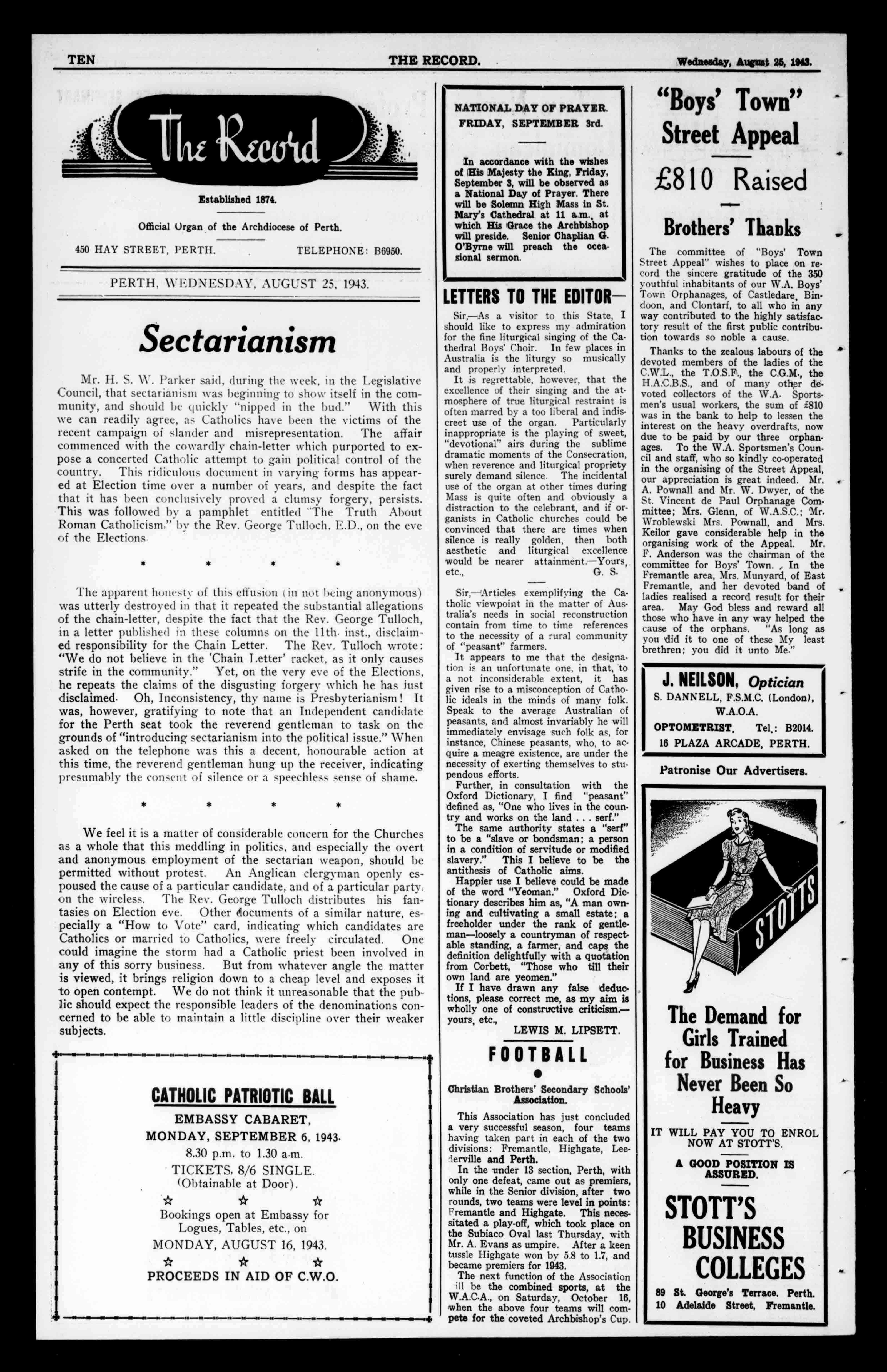 LetusgobacktothewordsIstartedwith.Oursinsarenottheworst thingswehavedone-JesusChristhas takenthoseandforgiventhem-butit isthegoodwecouldhavedoneand didnotdo.Itisthelittlebitoftime givengenerously-thefewmomentsof prayer.Whatwouldourhomesbe iftheRosaryweresaideverynight? Didyoureadin"TheRecord"lastSundayabouttheC.W.O.canteeninFremantle?Beforetheirdancecommences,theylightcandlesandsaya prayer.Whatamanifestationof faith-whataprotectionisoverthat hallandthoseinit.