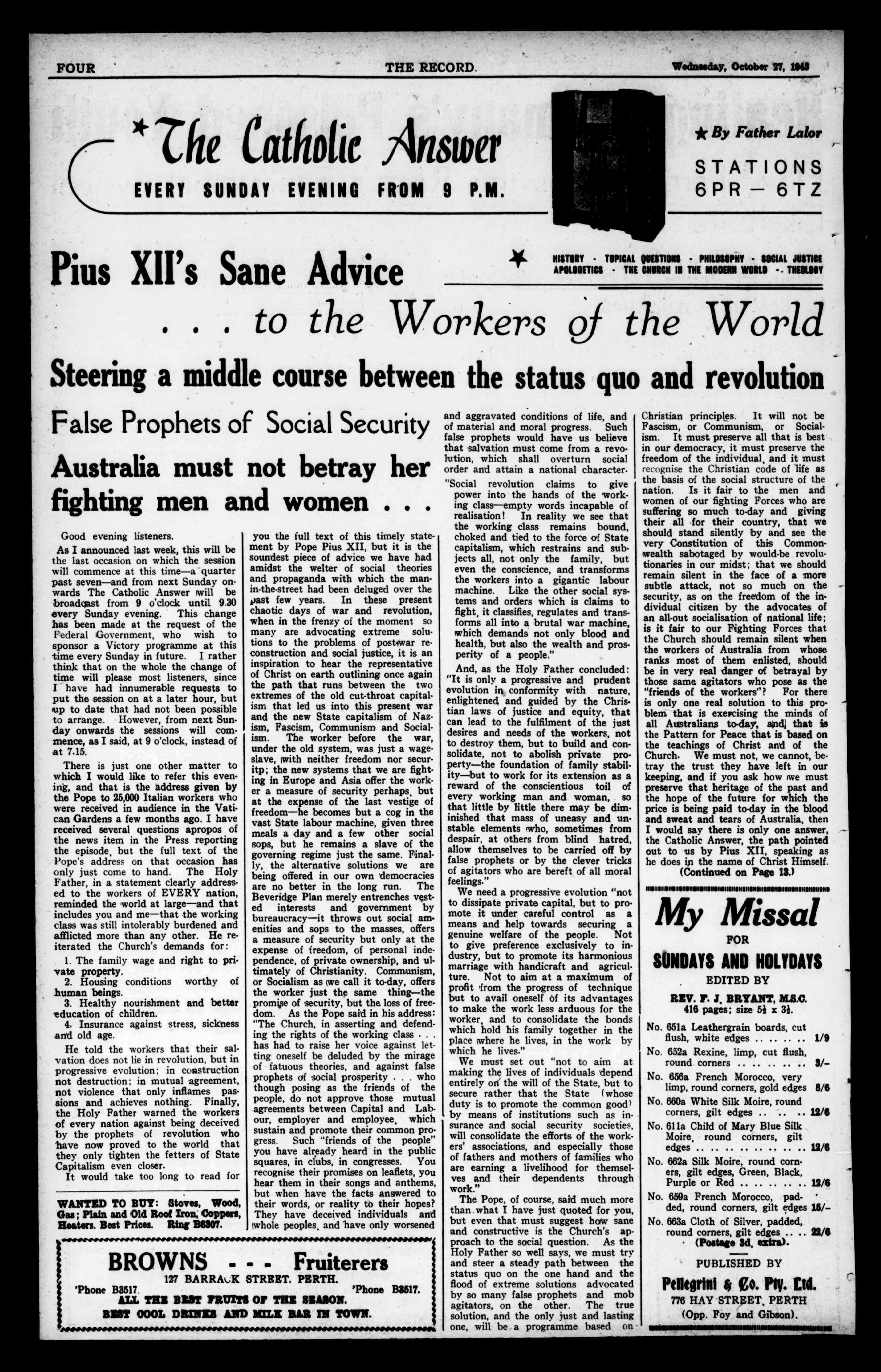 CONSULT withour ADVERTISERS forallyour REQUIREMENTS theRecord OfficialOrganoftheArchdioceseofPerth ESTABLISHED1874 CHM&GLASSandPLATED WAREIMPORTERS. OTLEYPLAGE,OffMURRAY STREET(RoarSavoyHotel) Convents,Colleges,Institutions andSchoolsSpeciallyCateredfor PriceListsandCatalogueon Application. PhoneB9651. Kelly&Rodoreda LateofJOHNDYNON&CO.