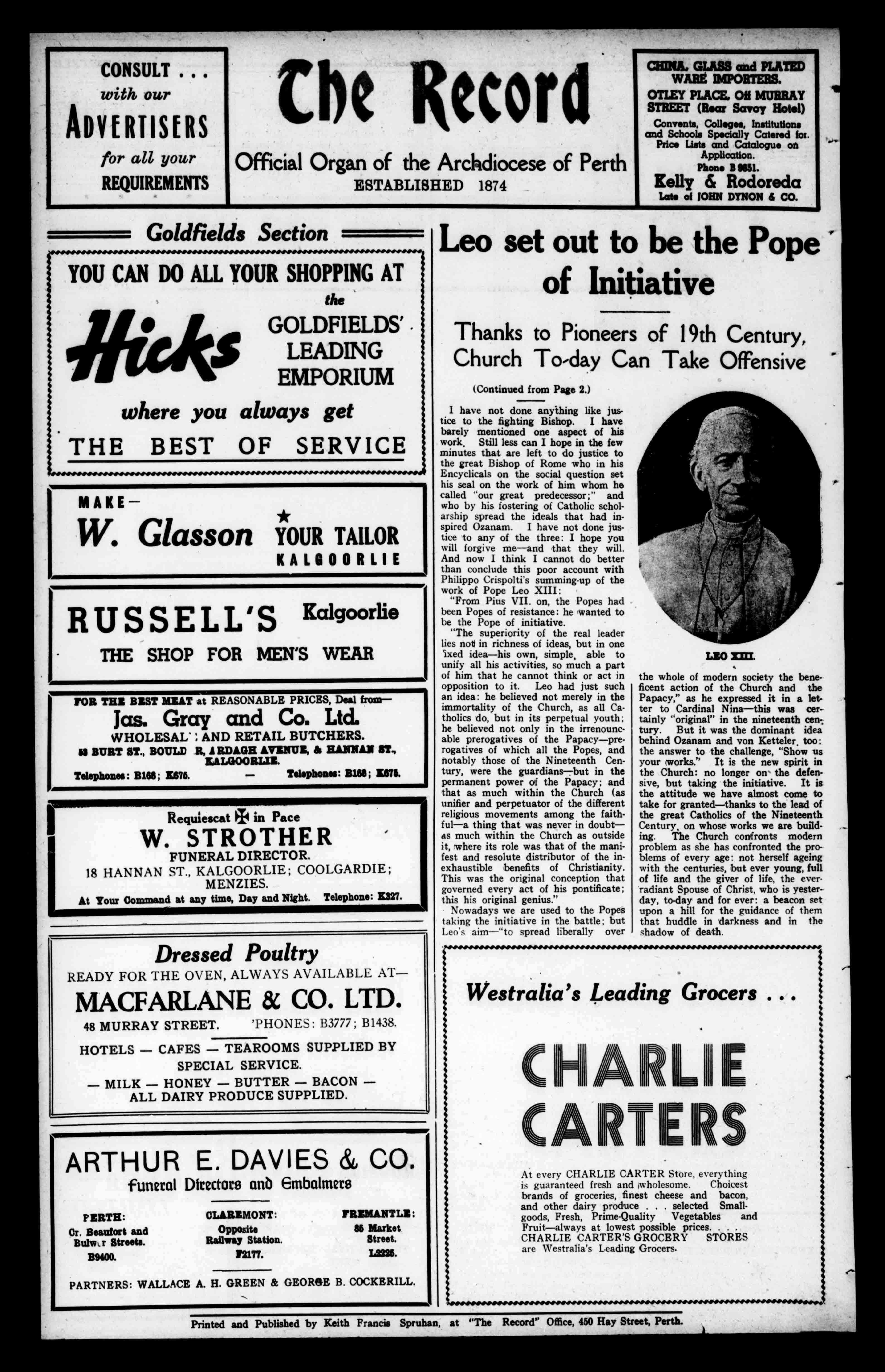 CONSULT withour ADVERTISERS forallyour REQUIREMENTS theRecord OfficialOrganoftheArchdioceseofPerth ESTABLISHED1874 CHINA,GLASSandPLATED WAREMORTEN. OTLEYPLACE,OffMURRAY STREET(RoarSavoyHotel) Convents,Colleges,Institutions andSchoolsSpeciallyCateredfor. PriceListsandCatalogueon Application. PhoneB0651. Kelly&Rodoreda LateofJOHNDYNONdiCO. GoldfieldsSection YOUCANDOALLYOURSHOPPINGAT the irficik GOLDFIELDS' IS LEADING EMPORIUM whereyoualwaysget THEBESTOFSERVICE MAKEGlassonYOURTAILOR KALGOORLIE RUSSELL'SKalgoorlie THESHOPFORMEN'SWEAR FORTHZBUT=ATatREASONABLEPRICES,DealfromJas.GrayandCo.Ltd. WHOLESAL'ANDRETAILBUTCHERS. aaBURTST.,B017LDR,ARDAGH.11,713171,&HANNANST., LAL000RLIB. Telephones:B166;1676. Telephones:BUB;1576. RequiescatFI1inPace W.STROTHER FUNERALDIRECTOR. 18HANNANST..KALGOORLIE;COOLGARDIE; MENZIES. AtYourCommandatanytime,Day