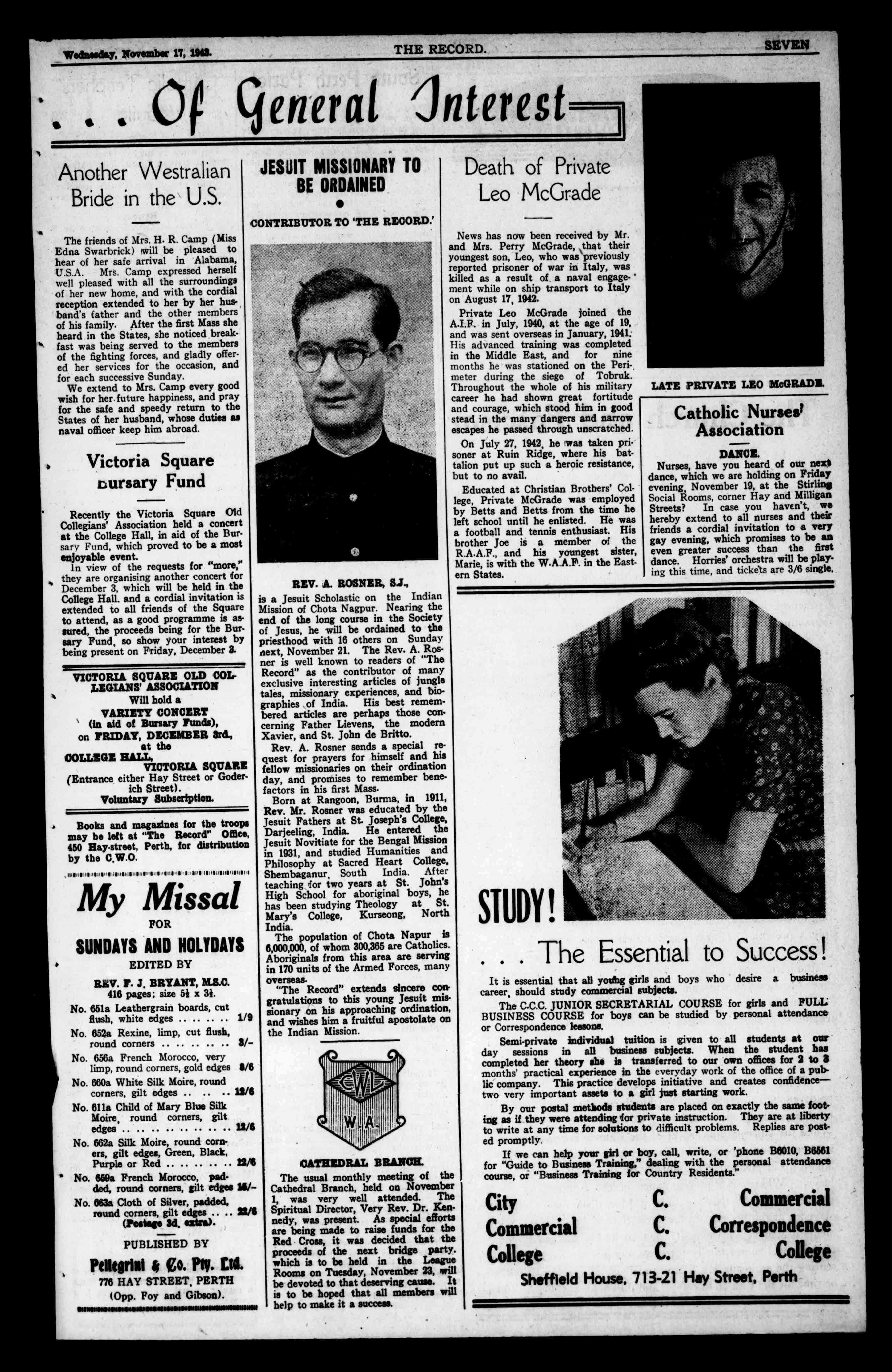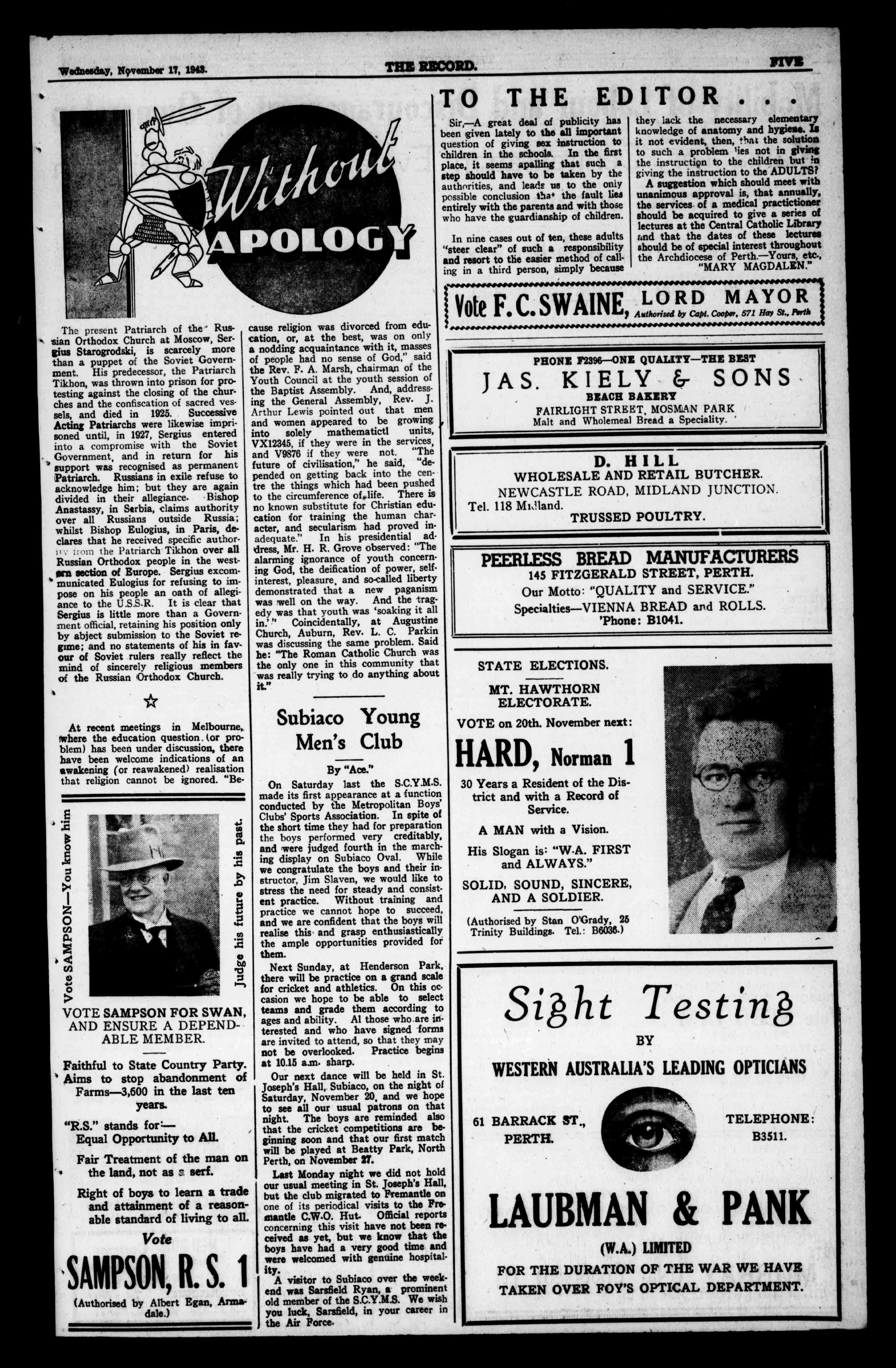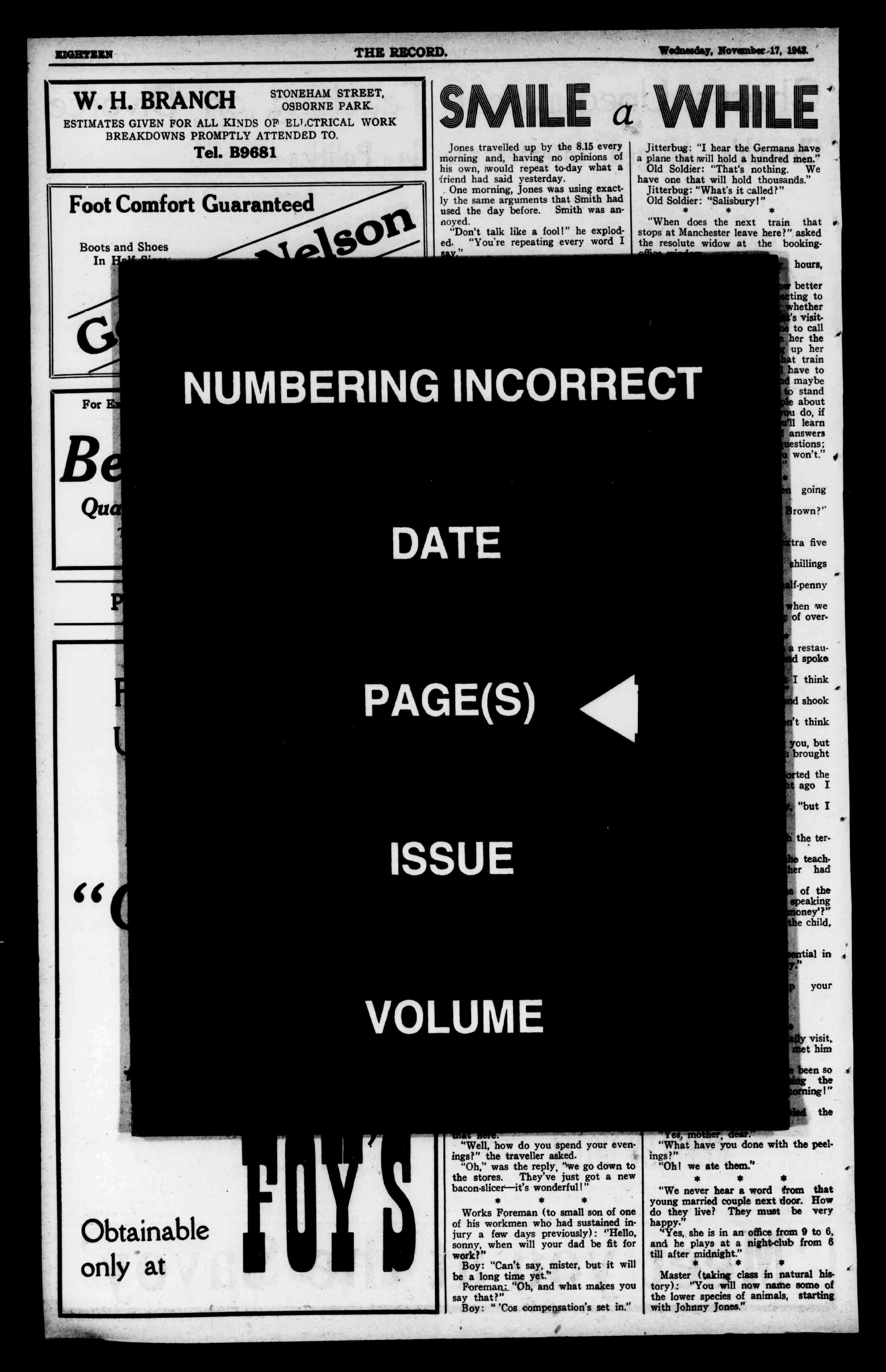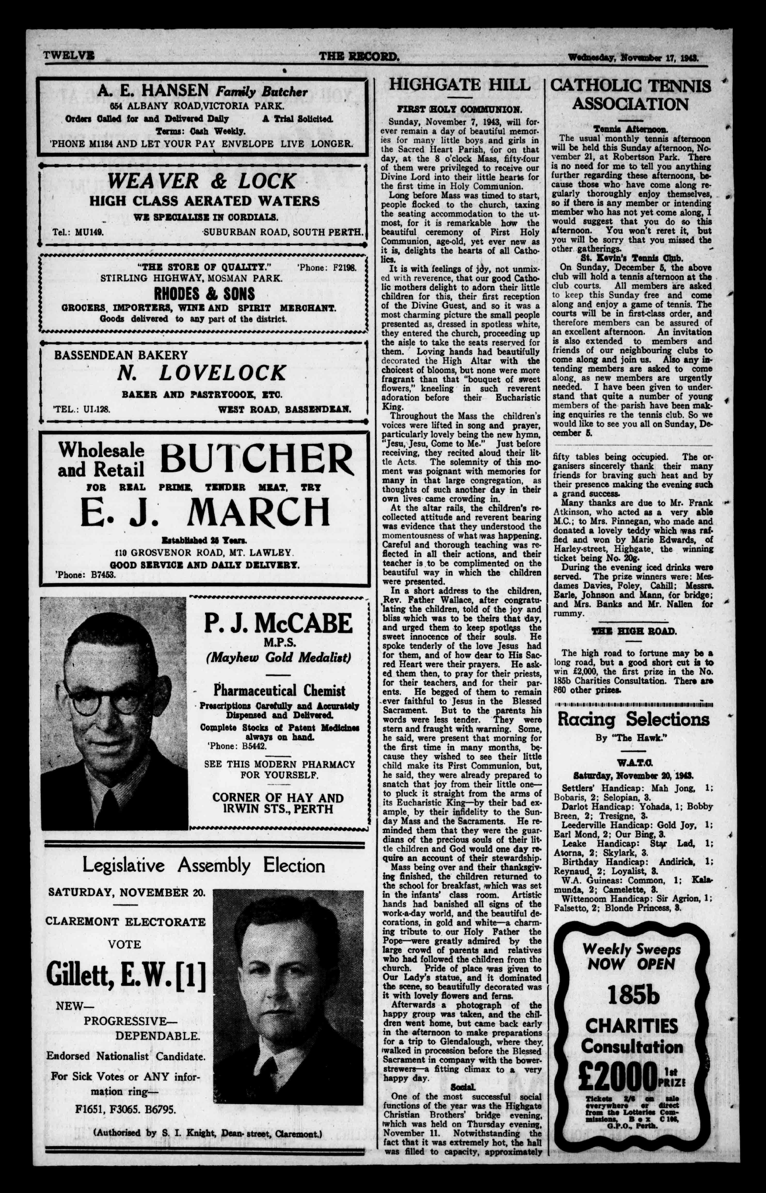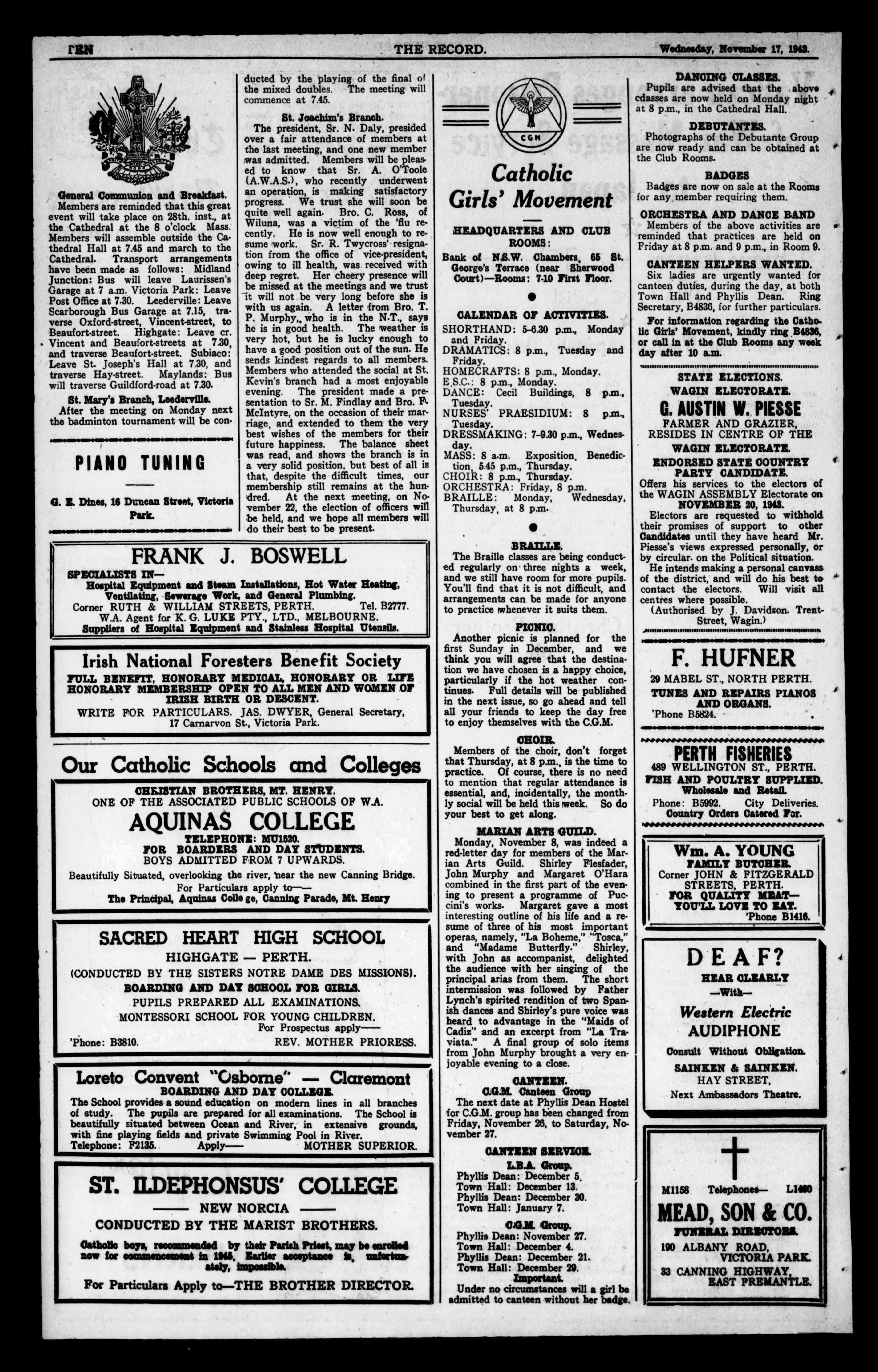 IJOILTIZN THERECORD. Wednesday,November17,1941. W.H.BRANCH STONEHAM OS STREET, ORNEPARK. ESTIMATESGIVENFORALLKINDSOFELJ.CTRICALWORK BREAKDOWNSPROMPTLYATTENDEDTO. Tel.B9681 1 1 FootComfortGuaranteed BootsandShoes InHalfSizes. Gov Ifnecessarywe maketoorder. 667HayStreet,Perth 'Phone131381. ForExquisiteMildnessandTenderness andFineFlavourAlways.