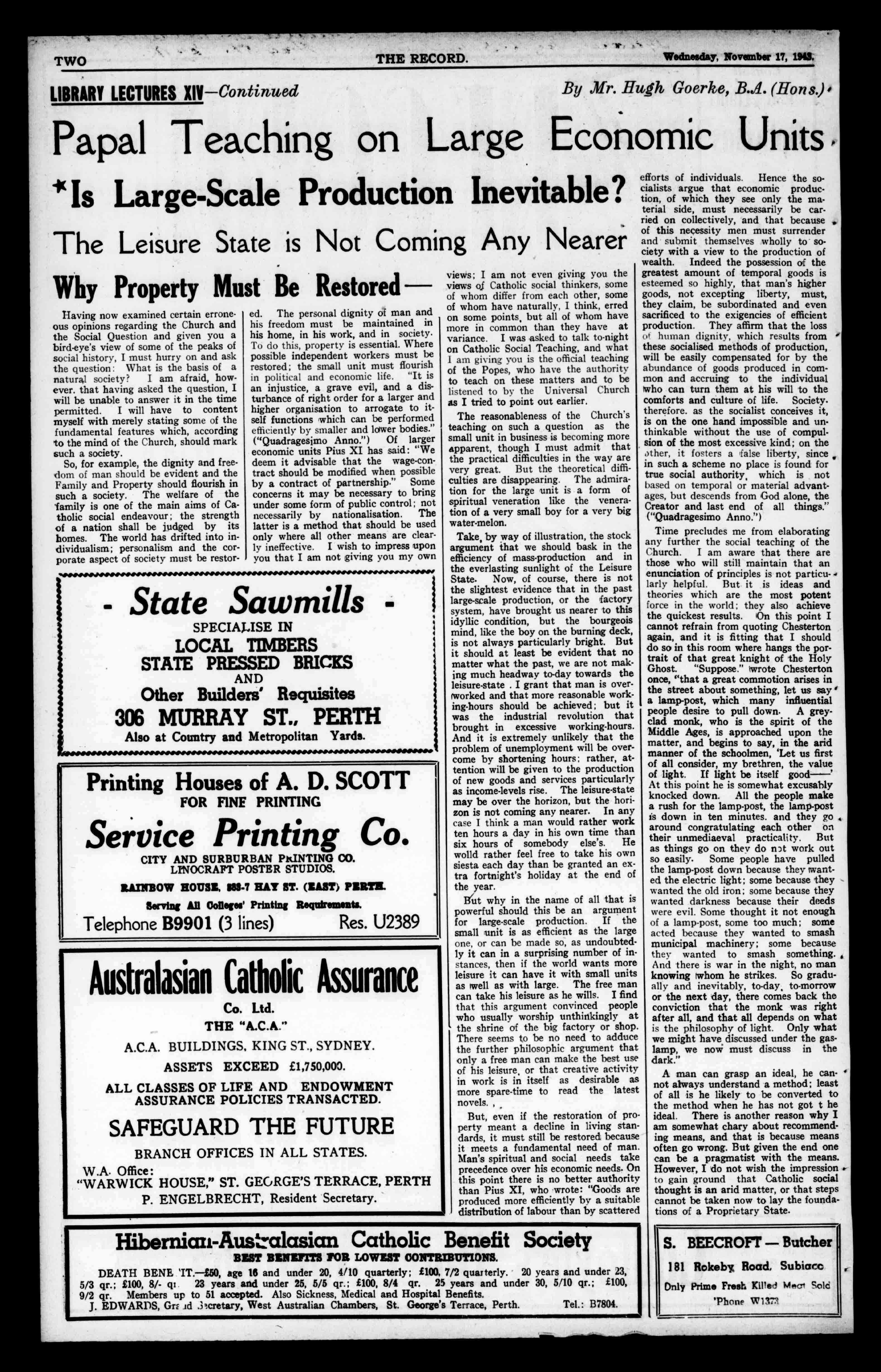 Athirdimportantmeasurewouldbe thefixationofprices.Australiahas war-timeprice-controlatthemoment, butitispricecontrolinnameonly.It isanattempttopreventpricesand profitsrisingundulyduringwartime,anditistosomeextentimpracticableasenforcedatthemoment.Itis largelybasedonpre-warprofitmargins,andhaslittleincommonasyet withtheideaoftheJustPriceastaught bytheChurch.AndaJustPriceisindispensablefortherestorationofthe smallman,becauseitpreventsthebig manfromputtinghimoutofbusiness throughcut-throatcompetition.