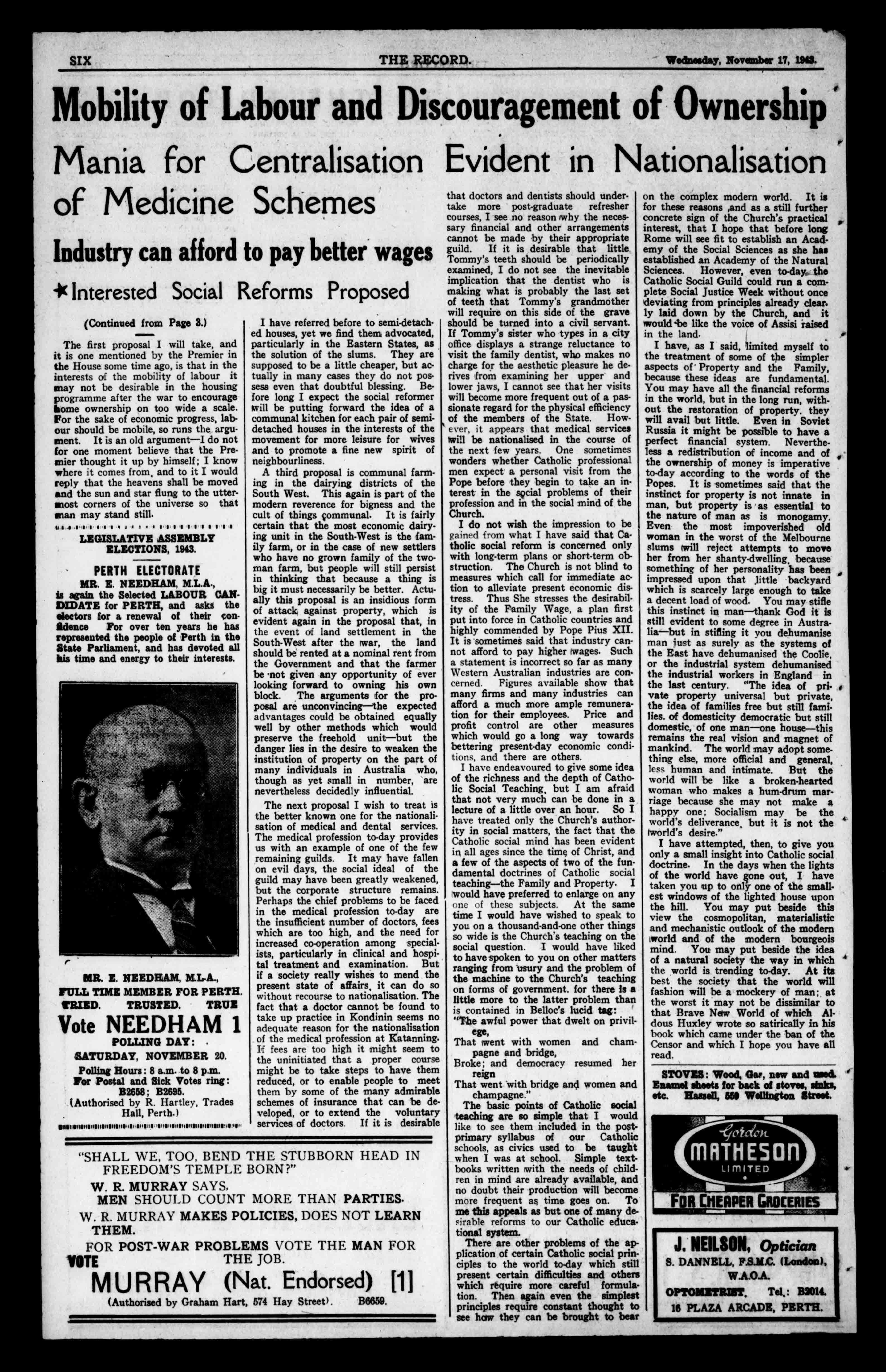 Butbesidesthepositiveinfluenceof theCatholicsocialreformer,hemust alsobeonthewatchfortendenciesin Australianpolicywhicharecontraryto truesocialprogress.Iwillinstance justafewofthemanyproposalsthat havebeenputforwardforpost-warreconstruction,and,exceptforthenationalisationofmedicine,thesuggestions amtakingarenotasmuchpublicised asmanyotherprojectedreformshave been,butneverthelesstheyspelldangertotheidealofaredistributionof ownership.Intheyearsaheadthe pathofCatholicsocialreformshould havewrittenacrossittheoldsaying thatthepriceoflibertyiseternalvig'lance. (ContinuedonPage6.)