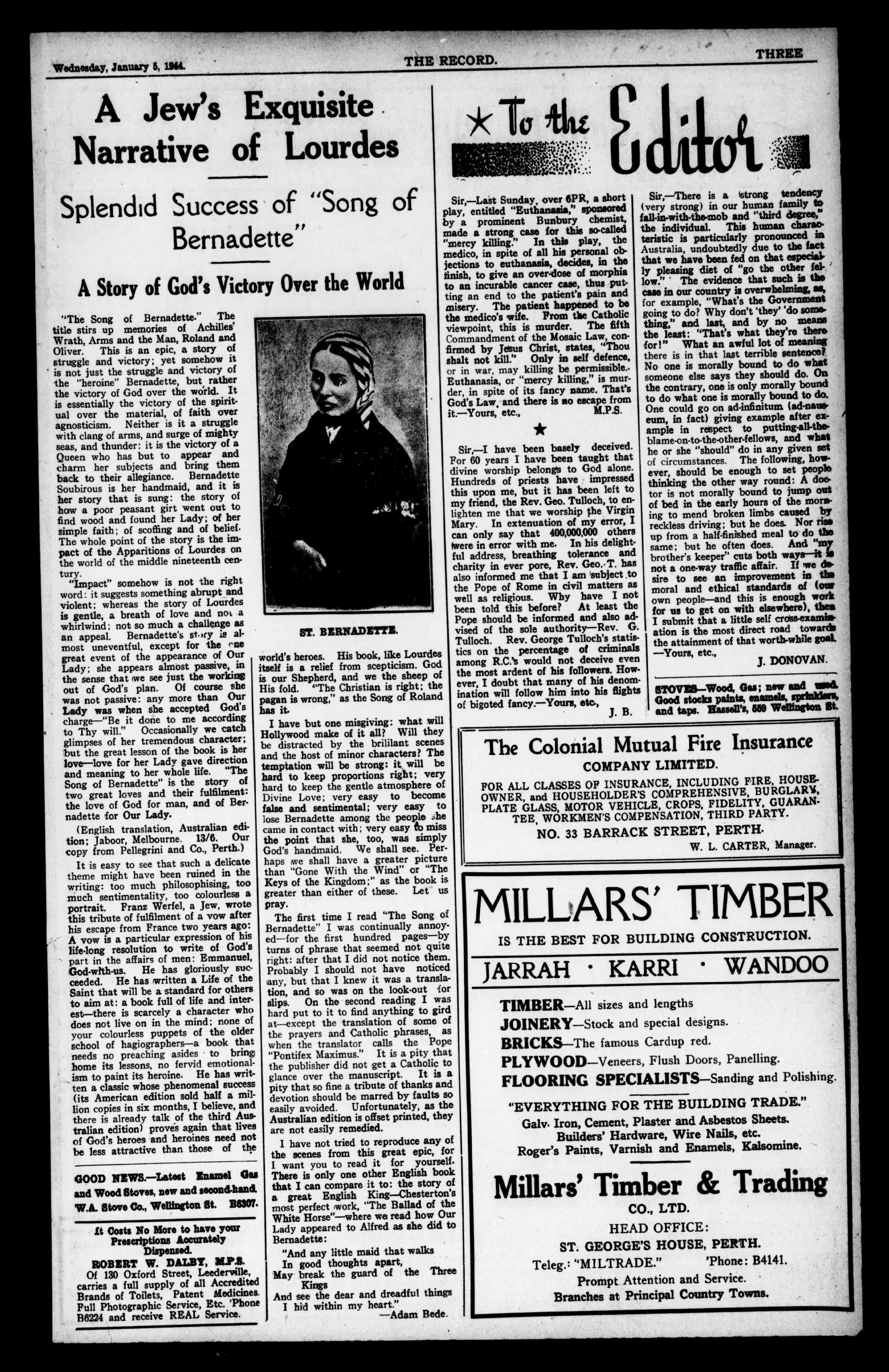 Itiseasytoseethatsuchadelicate thememighthavebeenruinedinthe writing:toomuchphilosophising,too muchsentimentality,toocolourlessa portrait.FranzWerfel,aJew,wrote thistributeoffulfilmentofavowafter hisescapefromFrancetwoyearsago: Avowisaparticularexpressionofhis life-longresolutiontowriteofGod's partintheaffairsofmen:Emmanuel, God-wfthus.Hehasgloriouslysucceeded.HehaswrittenaLifeofthe Saintthatwillbeastandardforothers toaimat:abookfulloflifeandinterest-thereisscarcelyacharacterwho doesnotliveoninthemind;noneof yourcolourlesspuppetsoftheolder schoolofhagiographers-abookthat needsnopreachingasidestobring homeitslessons,nofervidemotionalismtopaintitsheroine.Hehaswrittenaclassicwhosephenomenalsuccess (itsAmericaneditionsoldhalfamillioncopiesinsixmonths,Ibelieve,and thereisalreadytalkofthethirdAustralianedition)provesagainthatlives ofGod'sheroesandheroinesneednot belessattractivethanthoseofthe