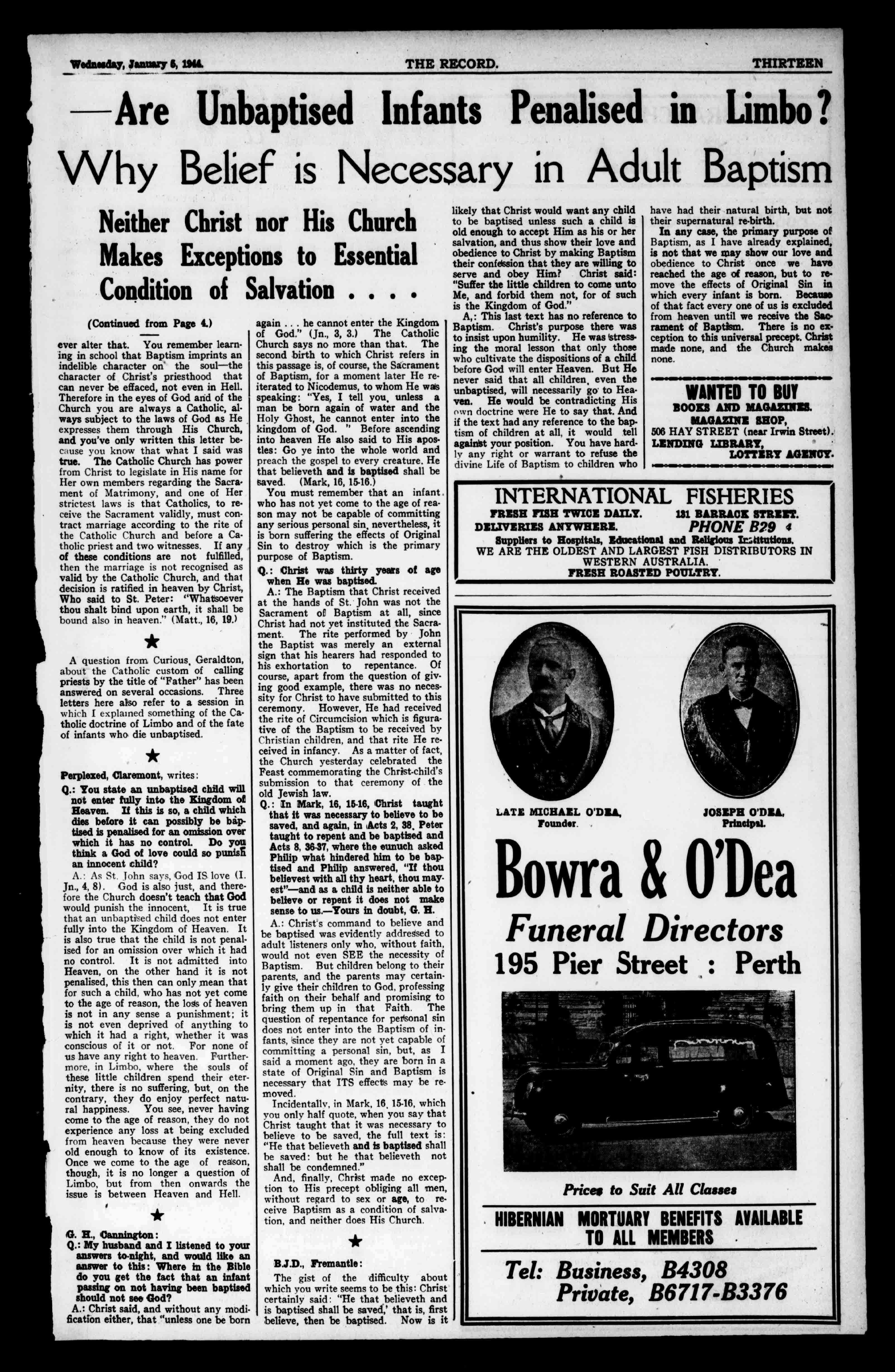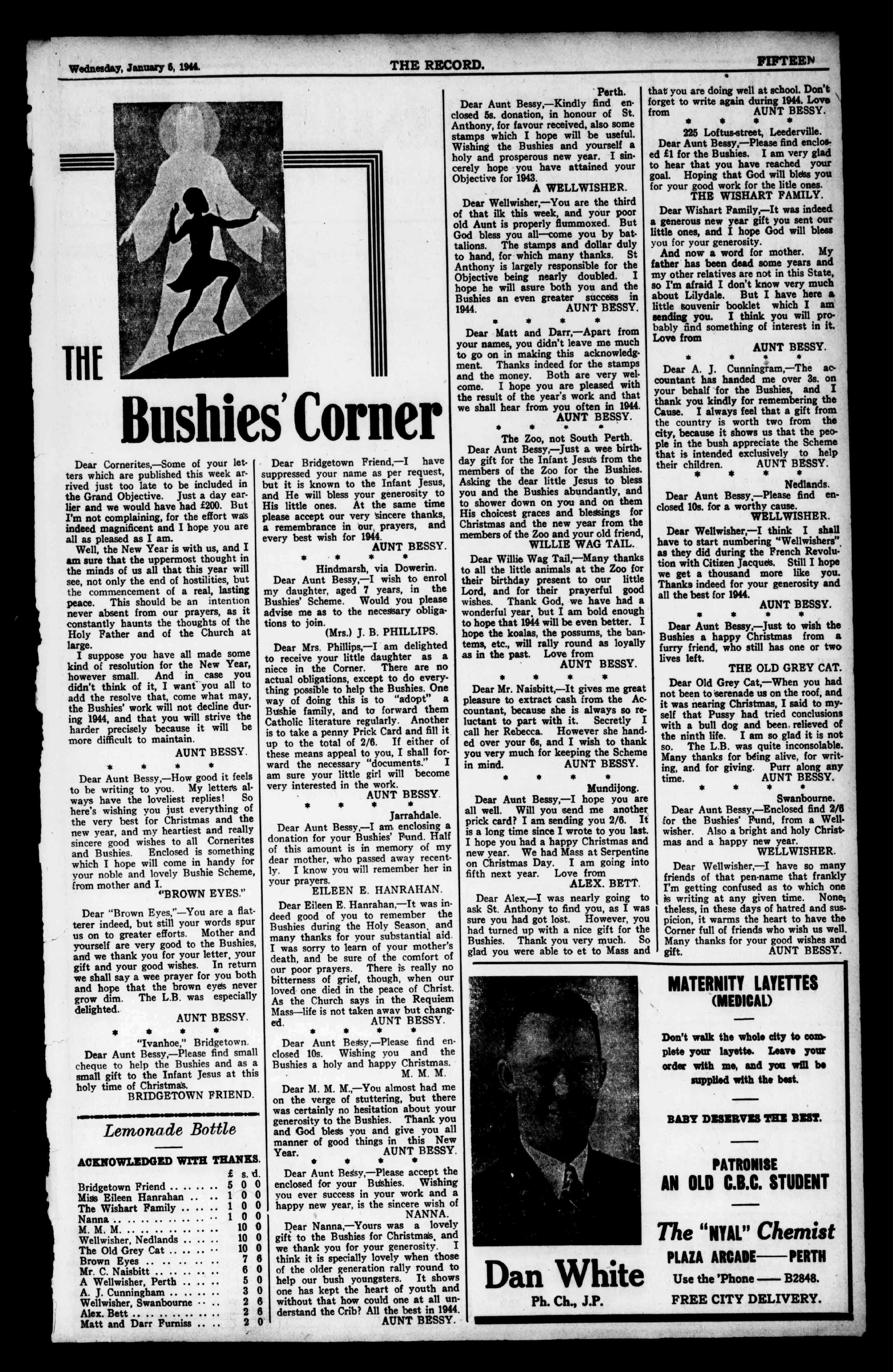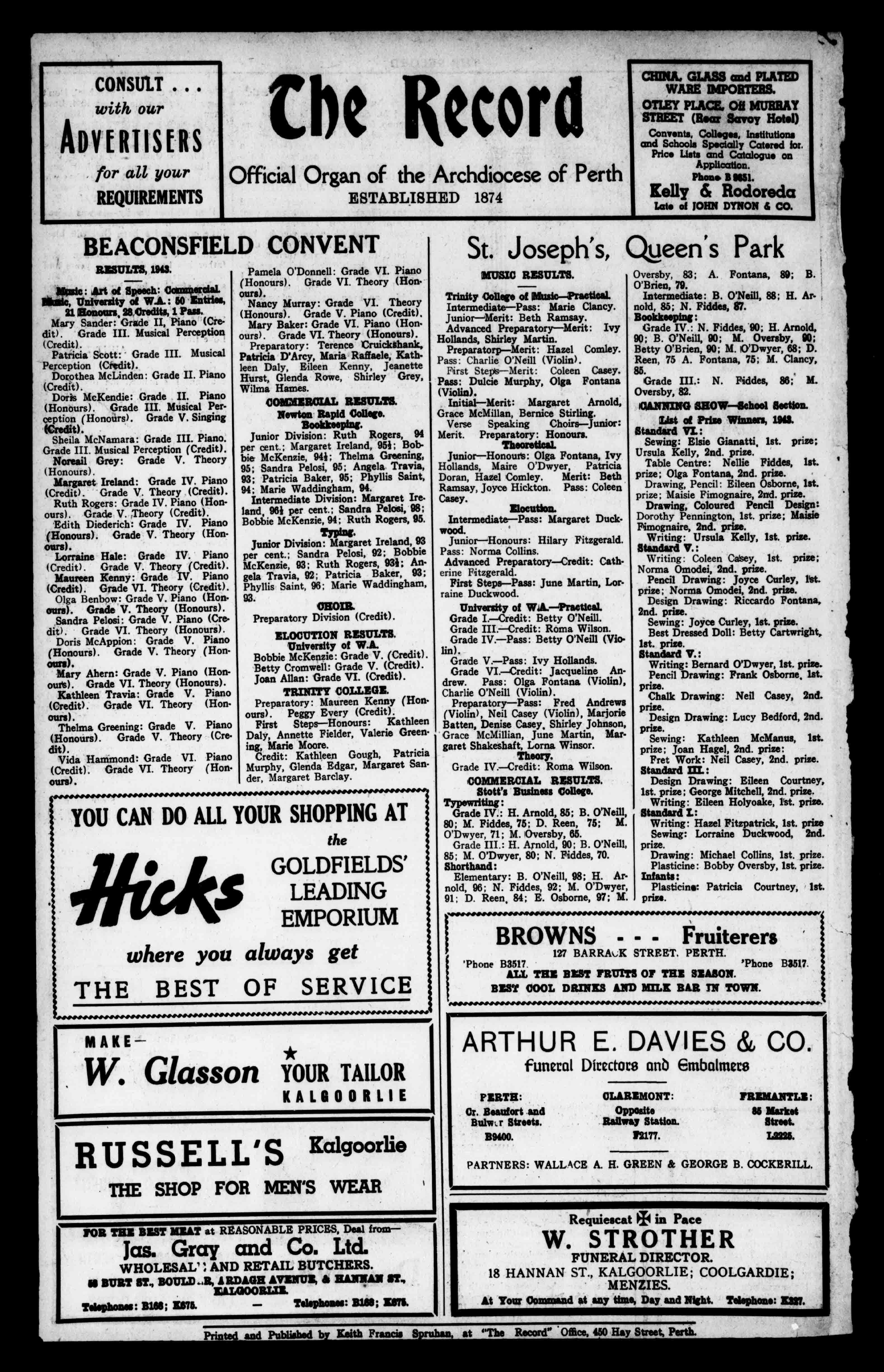 --Fruiterers 127BARRA,KSTREET.PERTH. 'PhoneB3517 'PhoneB3517 ALLTHEBESTFRUITSOFTHESEASON. BESTCOOLDRINKSANDMILKBARTNTOWN. ARTHURE.DAVIES&CO. funeralDirectorsanbembalmers PERTH: Cr.Beaufortand Bulw,rStreets. B9400. CLAREMONT: Opposite RailwayStation. 12177. FRZMANTLI: 85Market Street. L2225. PARTNERS:WALLACEA.H.GREEN&GEORGEB.COCKERILL. Requiescat114inPace W.STROTHER FUNERALDIRECTOR. 18HANNANST.,KALGOORLIE;COOLGARDIE; MENZIES. AtYourCommandatanytime,DayandNight.Telephone:K327. PrinandPublishedbKeithFrancisS.ruhan,at"TheRecord"'Office,450HayStreet,Perth.