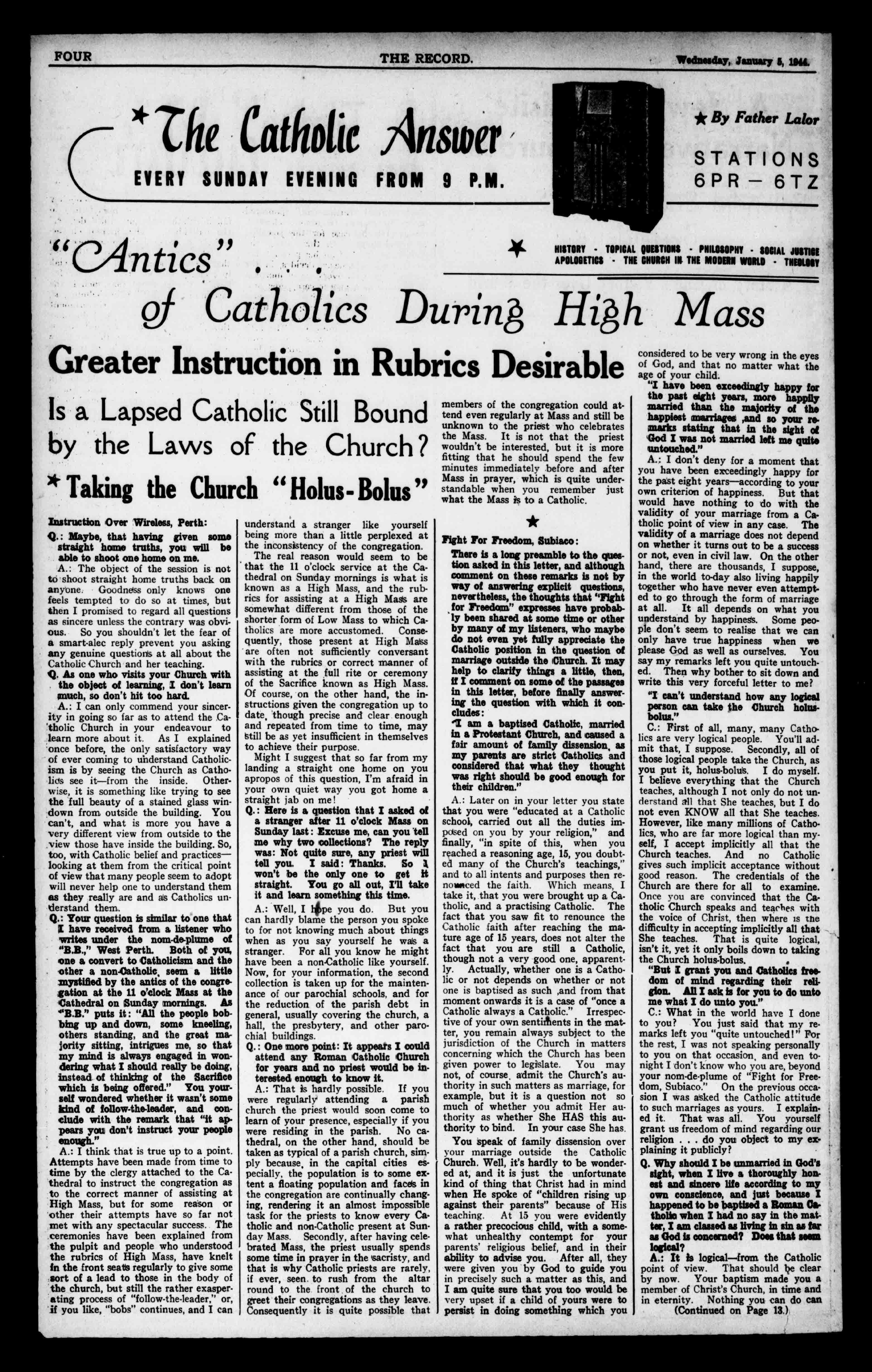 Sir,-Ihavebeenbaselydeceived. For60yearsIhavebeentaughtthat divineworshipbelong'stoGodalone. Hundredsofpriestshaveimpressed thisuponme,butithasbeenleftto myfriend,theRev.Geo.Tulloch,toenlightenmethatweworshiptheVirgin Mary.Inextenuationofmyerror,I canonlysaythat400,000,000others (wereinerrorwithme.Inhisdelightfuladdress,breathingtoleranceand charityineverpore,Rev.Geo.T.has alsoinformedmethatIamsubjectto thePopeofRomeincivilmattersas wellasreligious.WhyhaveInot beentoldthisbefore?Atleastthe Popeshouldbeinformedandalsoadvisedofthesoleauthority-Rev.G. Tulloch.Rev.GeorgeTulloch'sstatisticsonthepercentageofcriminals amongR.C."swouldnotdeceiveeven themostardentofhisfollowers.However,Idoubtthatmanyofhisdenominationwillfollowhimintohisflights ofbigotedfancy.-Yours,etc., J.B.