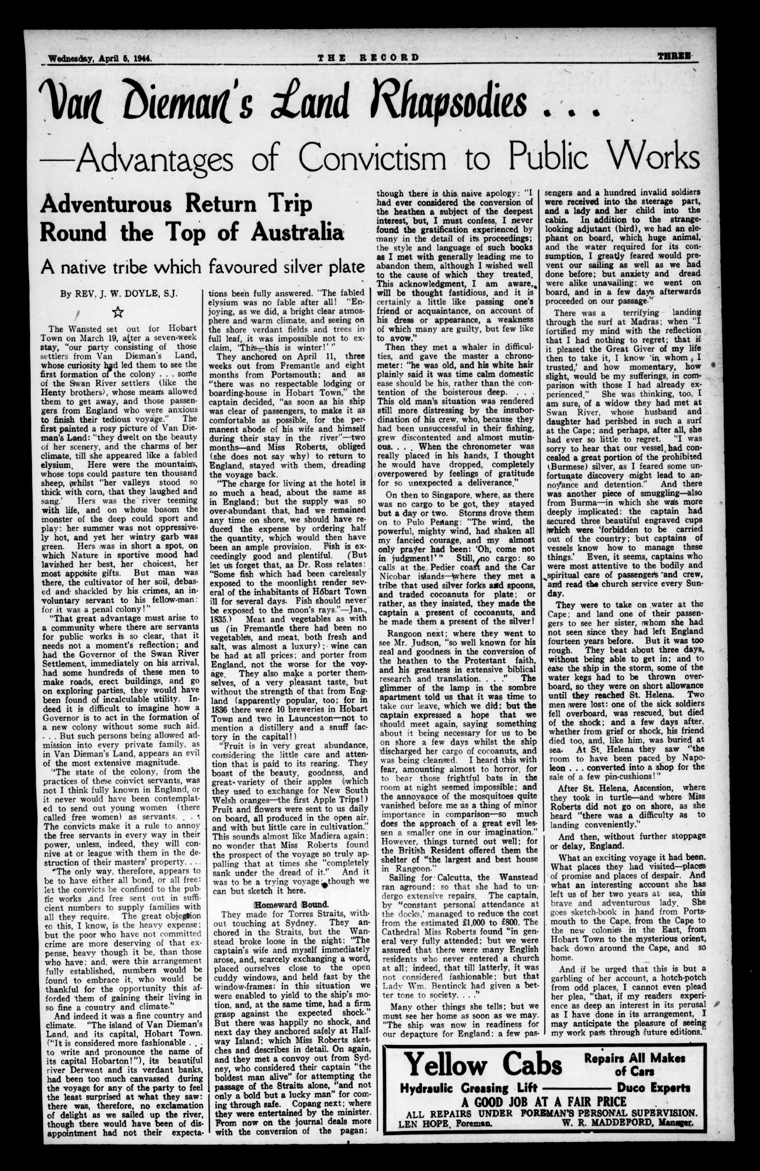 TheWanstedsetoutforHobart TownonMarch19,afteraseven-week stay,"ourpartyconsistingofthose settlersfromVanDieman'sLand, whosecuriosityhidledthemtoseethe firstformationofthecolony some oftheSwanRiversettlers(likethe Hentybrothers),whosemeansallowed themtogetaway,andthosepassengersfromEnglandwhowereanxious tofinishtheirtediousvoyage."The firstpaintedarosypictureofVanDieman'sLand:"theydweltonthebeauty herscenery,andthecharmsofher climate,tillsheappearedlikeafabled elysium.Herewerethemountains, whosetopscouldpasturetenthousand sheep,kwhilst"hervalleysstoodso thickwithcorn,thattheylaughedand sang.'Herswastheriverteeming withlife,andonwhosebosomthe monsterofthedeepcouldsportand play:hersummerwasnotoppressive. lyhot,andyetherwintrygarbwas green.Herswasinshortaspot,on whichNatureinsportivemoodhad lavishedherbest,herchoicest,her mostappdsitegifts.Butmanwas there,thecultivatorofhersoil,debasedandshackledbyhiscrimes,aninvoluntaryservanttohisfellow-man: foritwasapenalcolony!"