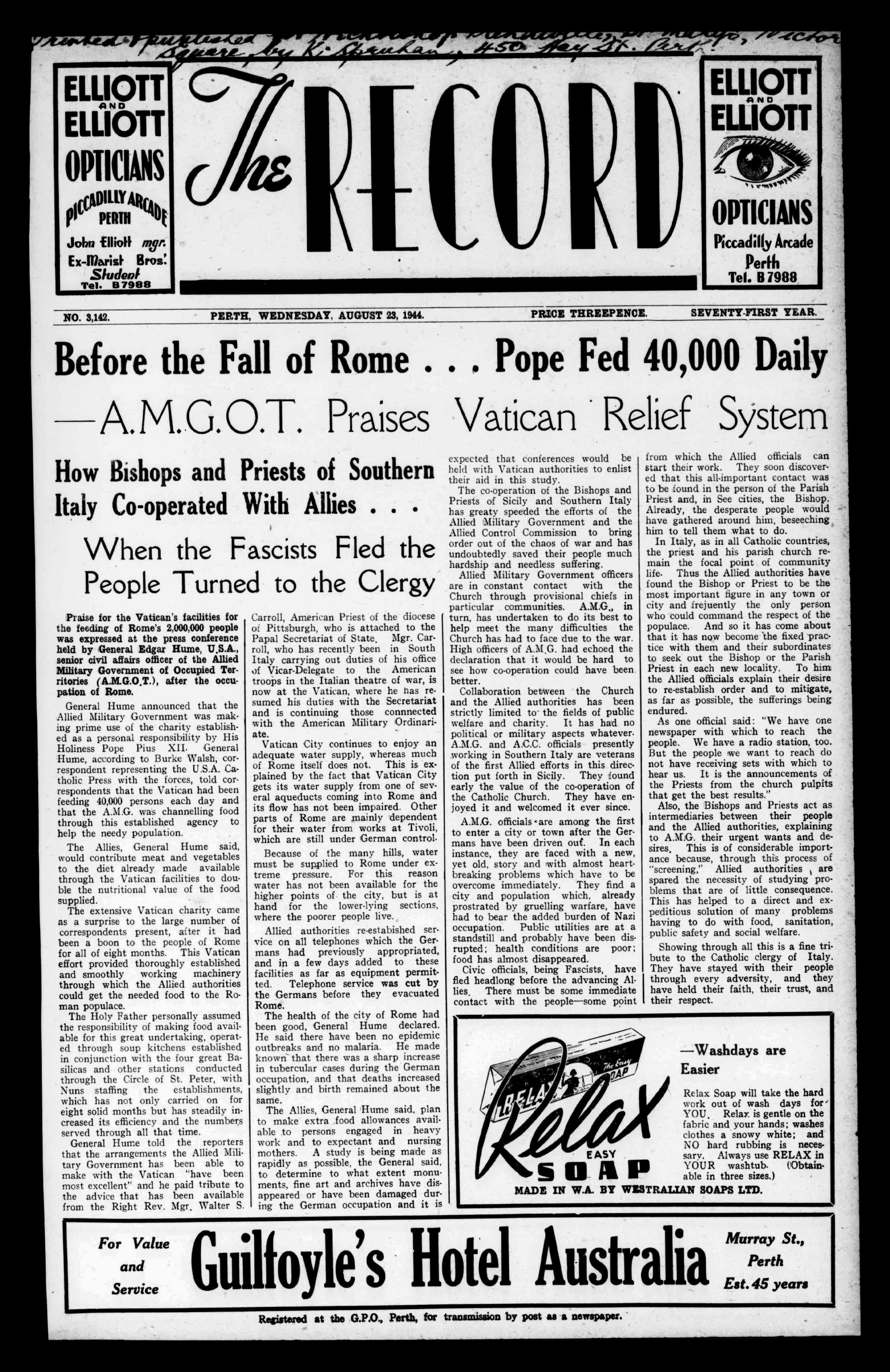 GeneralHumeannouncedthatthe AlliedMilitaryGovernmentwasmakingprimeuseofthecharityestablishedasapersonalresponsibilitybyHis HolinessPopePiusXII.General Hume,accordingtoBurkeWalsh,correspondentrepresentingtheU.S.A.CatholicPresswiththeforces,toldcorrespondentsthattheVaticanhadbeen feeding40,000personseachdayand thattheA.M.G.waschannellingfood throughthisestablishedagencyto helptheneedypopulation.