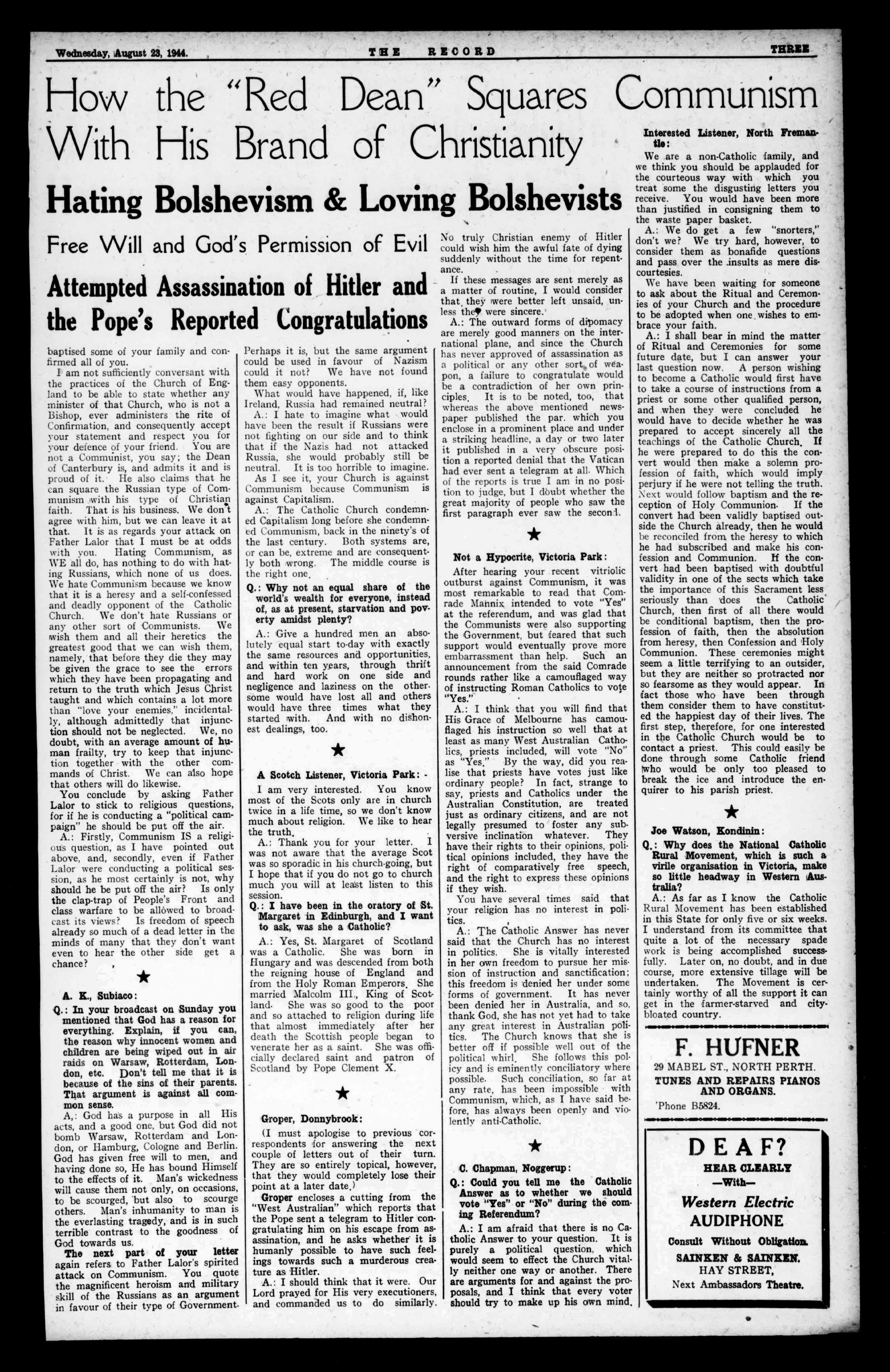Iamnotsufficientlyconversantwith thepracticesoftheChurchofEnglandtobeabletostatewhetherany ministerofthatChurch,whoisnota Bishop,everadministerstheriteof Confirmation,andconsequentlyaccept yourstatementandrespectyoufor yourdefenceofyourfriend.Youare notaCommtinist,yousay;theDean ofCanterburyis,andadmitsitandis proudofit.Ilealsoclaimsthathe cansquaretheRussiantypeofCommunismwithhistypeofChristian faith.Thatishisbusiness.Wedon; agreewithhim,butwecanleaveitat that.Itisasregardsyourattackon FatherLalorthatImustbeatodds withyou.HatingCommunism,as WEalldo,hasnothingtodowithhatingRussians,whichnoneofusdoes. WehateCommunismbecauseweknow thatitisaheresyandaself-confessed anddeadlyopponentoftheCatholic Church.Wedon'thateRussiansor anyothersortofCommunists.We wishthemandalltheirhereticsthe greatestgoodthatwecanwishthem, namely,thatbeforetheydietheymay begiventhegracetoseetheerrors whichtheyhavebeenpropagatingand returntothetruthwhichJesusChrist taughtandwhichcontainsalotmore than"loveyourenemies,"incidentally,althoughadmittedlythatinjunctionshouldnotbeneglected.We,no doubt,withanaverageamountofhumanfrailty,trytokeepthatinjunctiontogetherwiththeothercommandsofChrist.Wecanalsohope thatotherswilldolikewise.