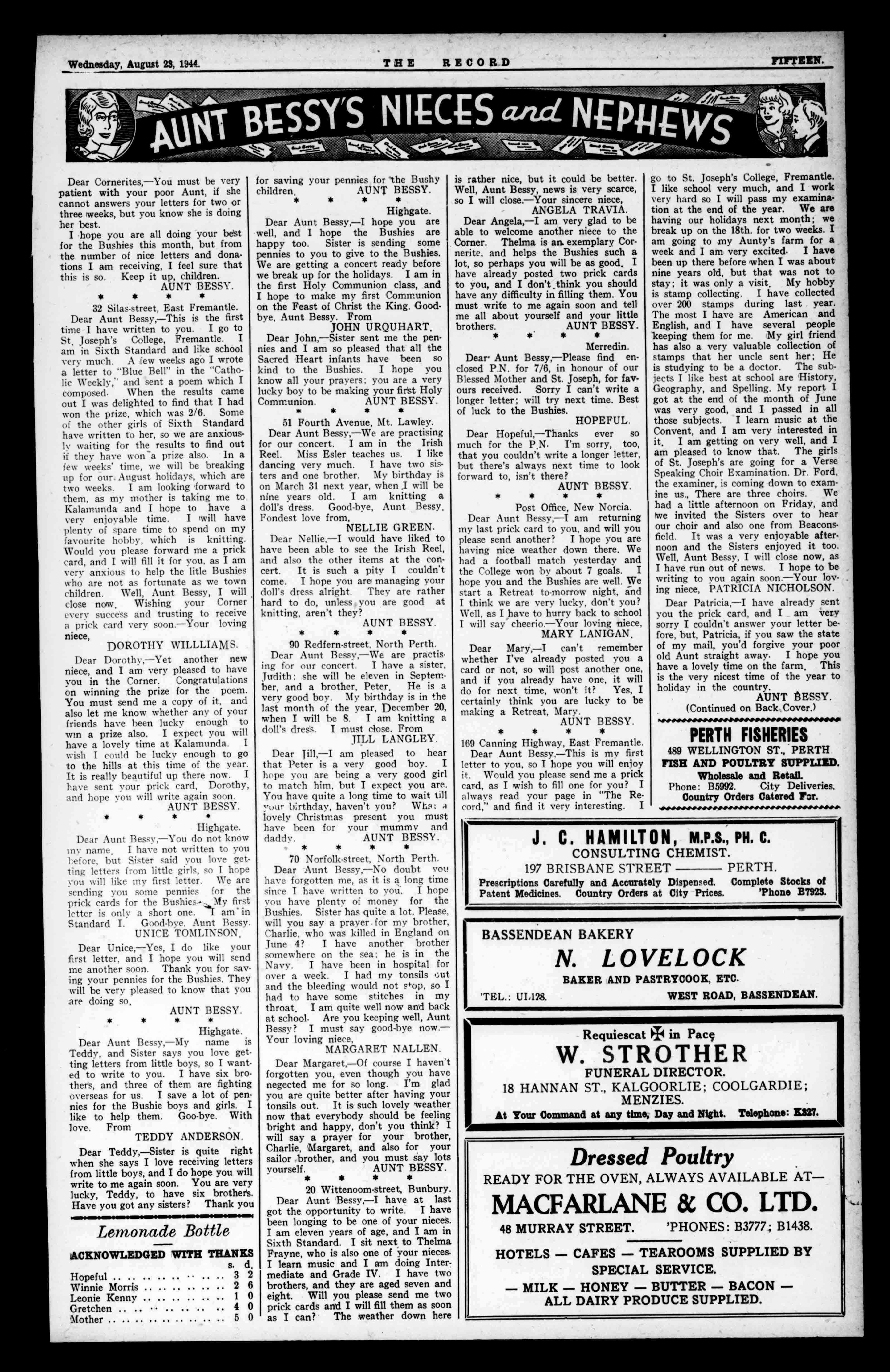 DearAuntBessy,-Thisisthefirst timeIhavewrittentoyou.Igoto St.Joseph'sCollege,Fremantle.I aminSixthStandardandlikeschool verymuch.AfewweeksagoIwrote aletterto"BlueBell"inthe"CatholicWeekly,'andsentapoemwhichI composed.Whentheresultscame outIwasdelightedtofindthatIhad wontheprize,whichwas2/6.Some oftheothergirlsofSixthStandard havewrittentoher,soweareanxiouslywaitingfortheresultstofindout iftheyhavewon-aprizealso.Ina fewweeks'time,wewillbebreaking upforour.Augustholidays,whichare twoweeks.Iamlooking'forwardto them,asmymotheristakingmeto KalamundaandIhopetohavea veryenjoyabletime.I'willhave plentyofsparetimetospendonmy favouritehobby,whichisknitting. Wouldyoupleaseforwardmeaprick card,andIwillfillitforyou,asIam veryanxioustohelpthelitleBushies whoarenotasfortunateaswetown children.Well,AuntBessy,Iwill closenow,WishingyourCorner everysuccessandtrustingtoreceive aprickcardverysoon.-Yourloving niece, DOROTHYWILLLIAMS.