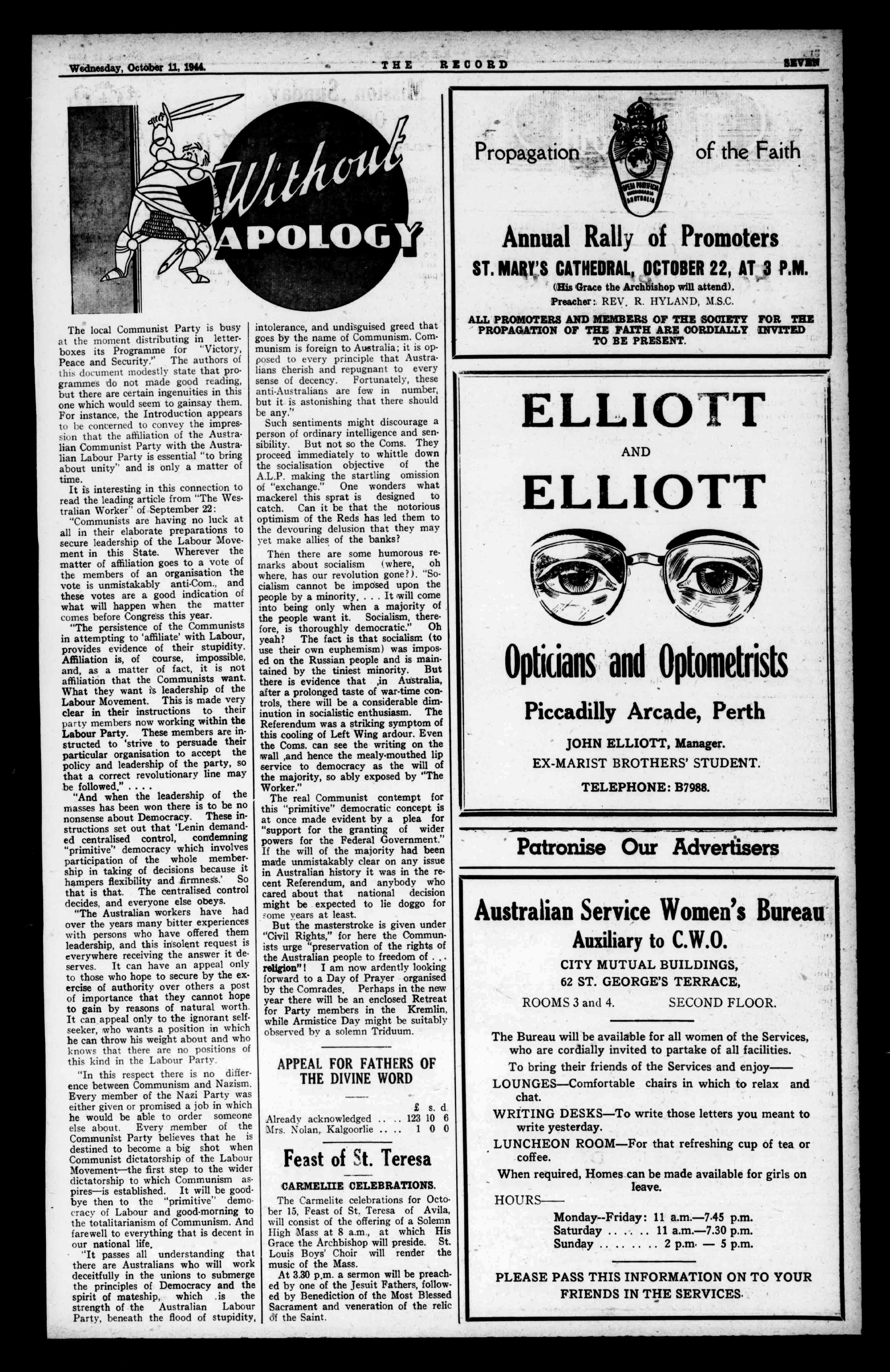 OfficialOrganoftheArchdioceseofPerth ESTABLISHED1874 CHINA,GLASSandPLATED WAREIMPORTERS. OTLEYPLACE,OffMURRAY STREET(RearSavoyHotel) Convents,Colleges,Institutions andSchoolsSpeciallyCateredioi PriceListsandCatalogueon Application. PhoneB9851. Kelly&Rodoreda LotsofJOHNDYNON&CO.