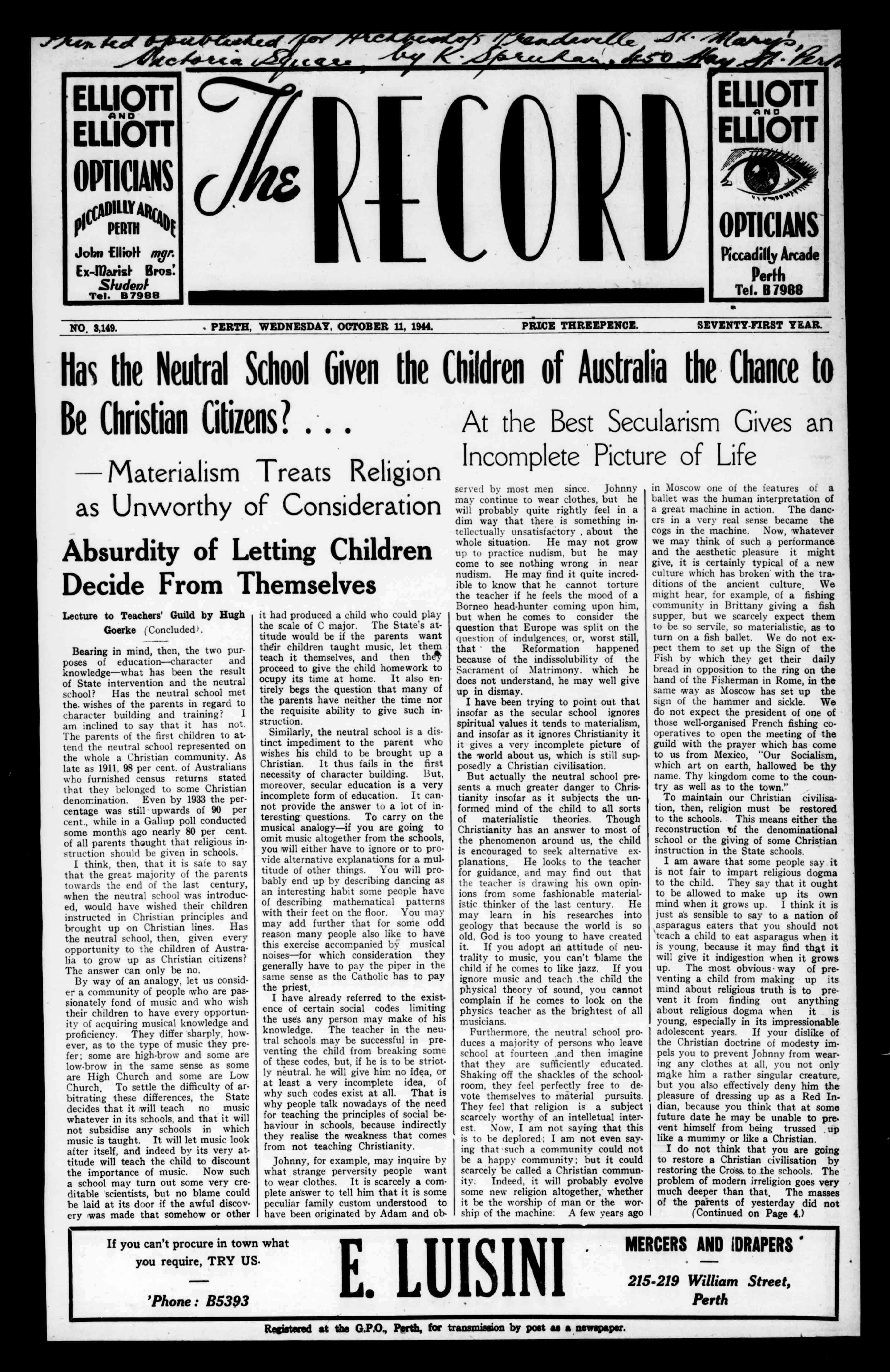 Ithink,then,thatitissafetosay thatthegreatmajorityoftheparents towardstheendofthelastcentury, whentheneutralschoolwasintroduced,wouldhavewishedtheirchildren instructedinChristianprinciplesand broughtuponChristianlines.Has theneutralschool,then,givenevery opportunitytothechildrenofAustraliatogrowupasChristiancitizens? Theanswercanonlybeno.