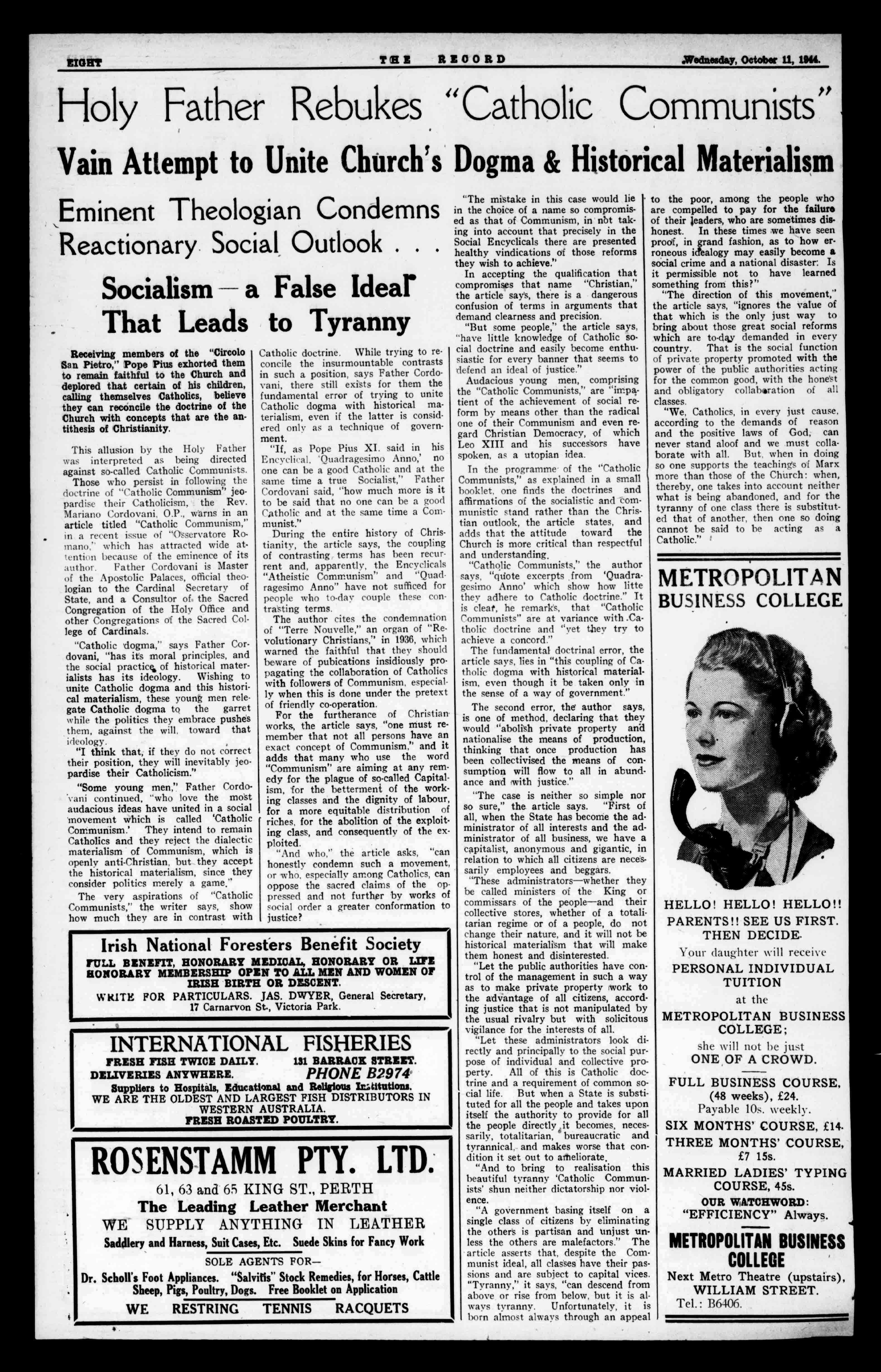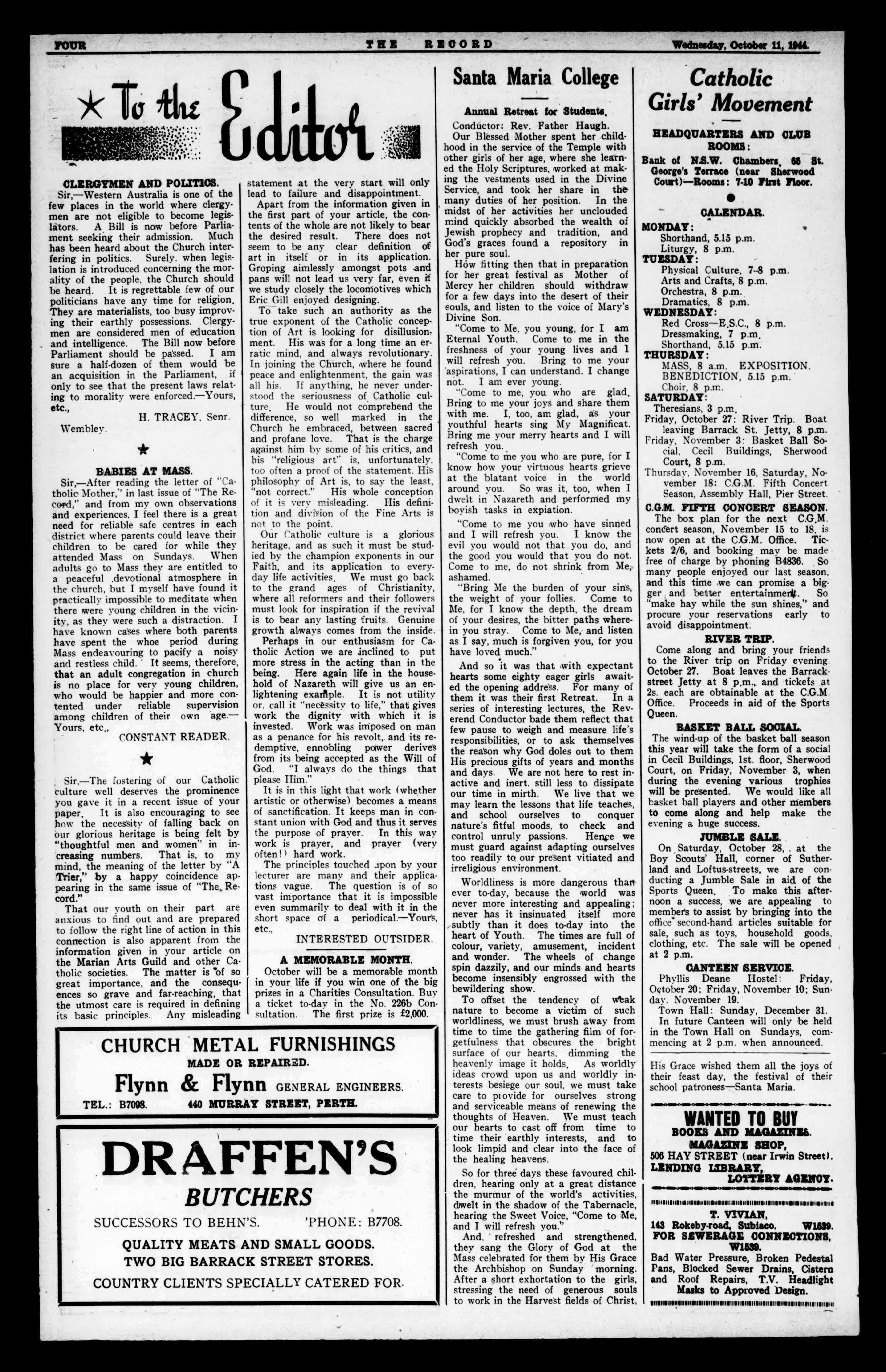 MADEINW.A.BYWRSTRALIANSOAPSLTD. CatholicFunerals BY PerthFuneral DirectorsLtd. ComplystrictlywitheveryrequirementofCatholicRitual. ThequietdignityandreverenceofservicesundercompetentCatholicsupervisionaffordconsolationinthehourofsorrow. NightandDayService. ModerateFees. 379HaySt.,Perth(nearSt.Mary'sCathedral), Phones:Business,B8616;Private,B8623,B5496.
