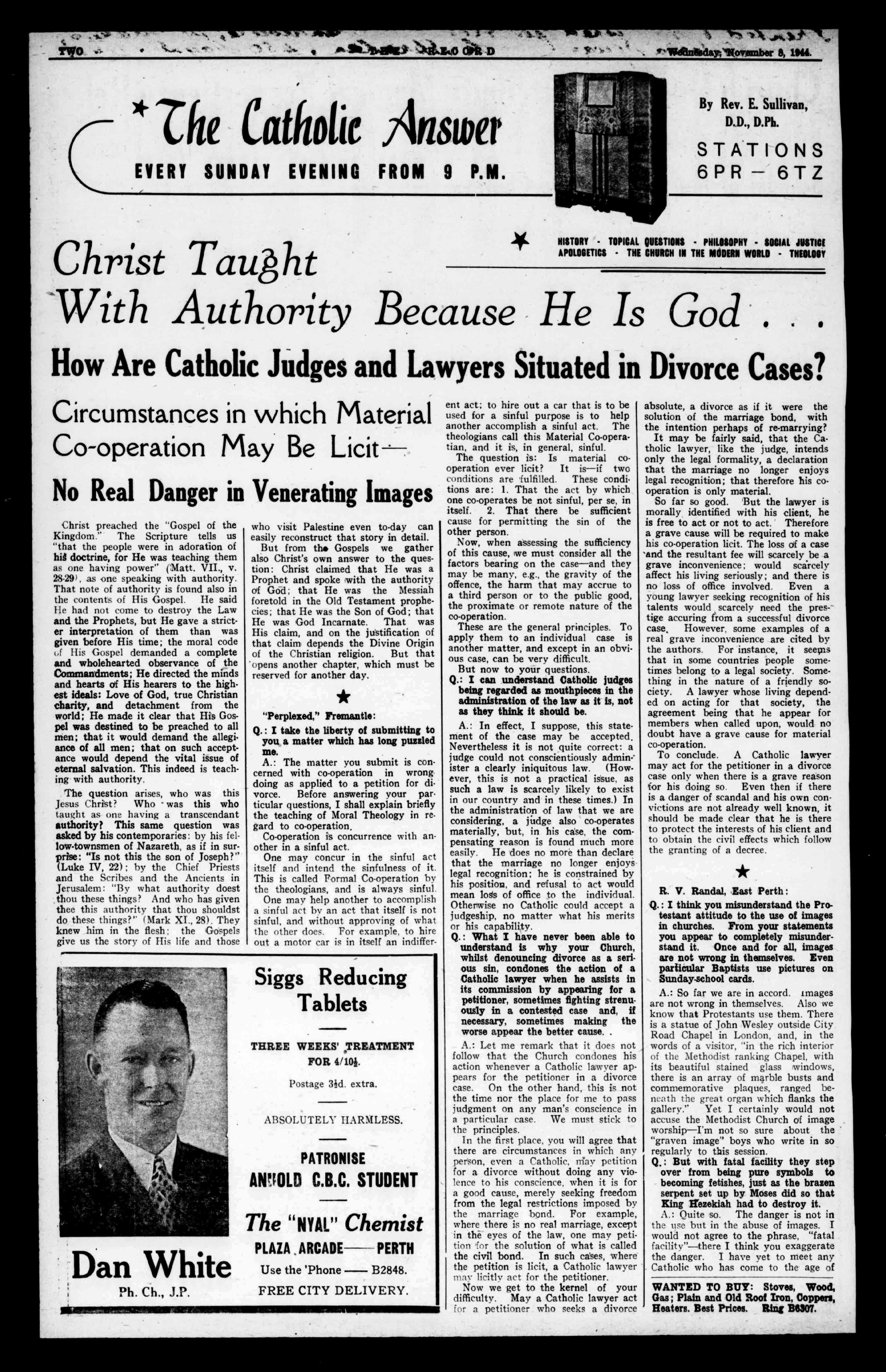 Q.:WhatIhaveneverbeenableto understandiswhyyourChurch, whilstdenouncingdivorceasaserioussin,condonestheactionofa Catholiclawyerwhenheassistsin itscommissionbyappearingfora petitioner,sometimesfightingstrenuouslyinacontestedcaseand,if necessary,sometimesmakingthe worseappearthebettercause.