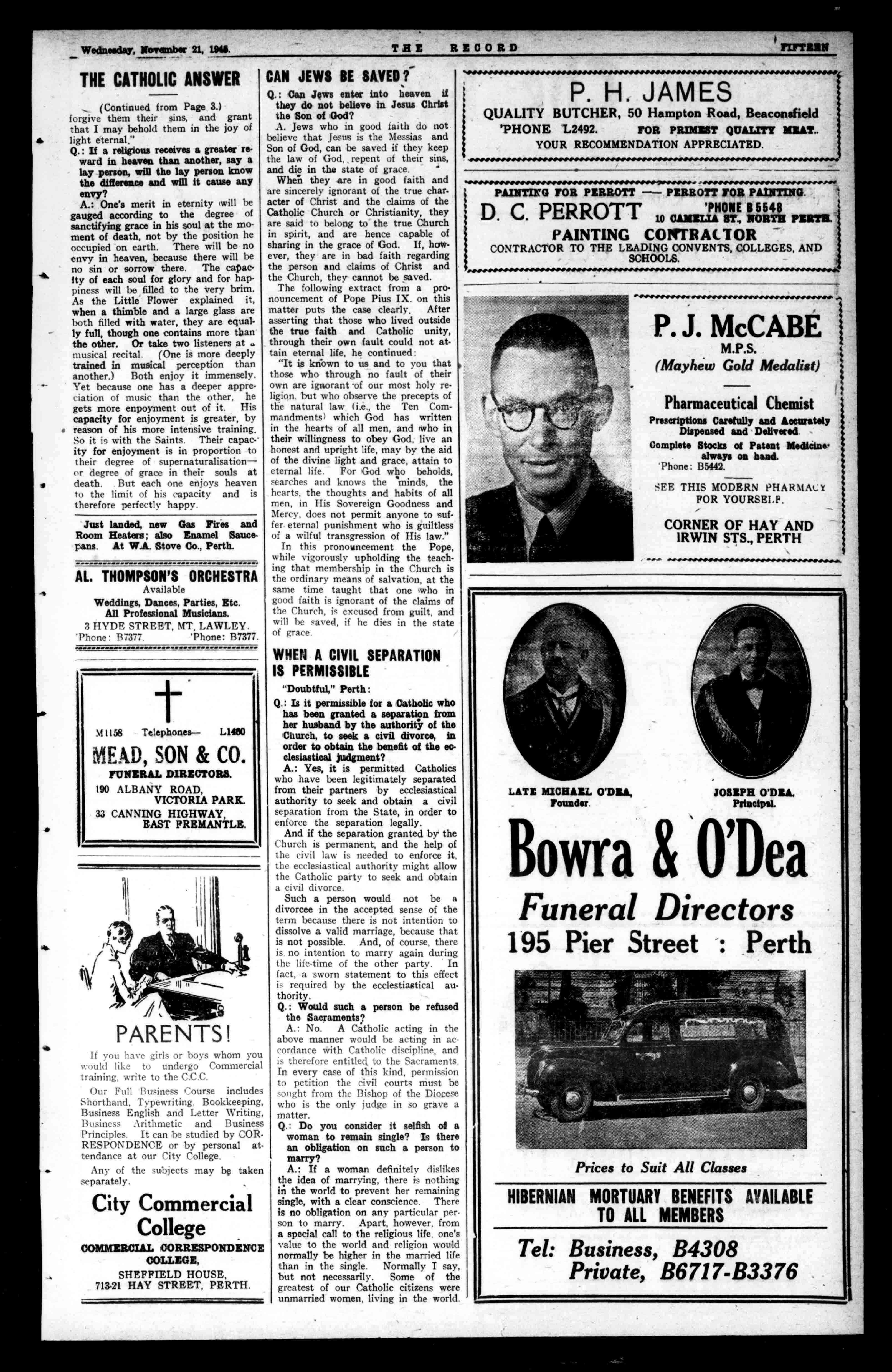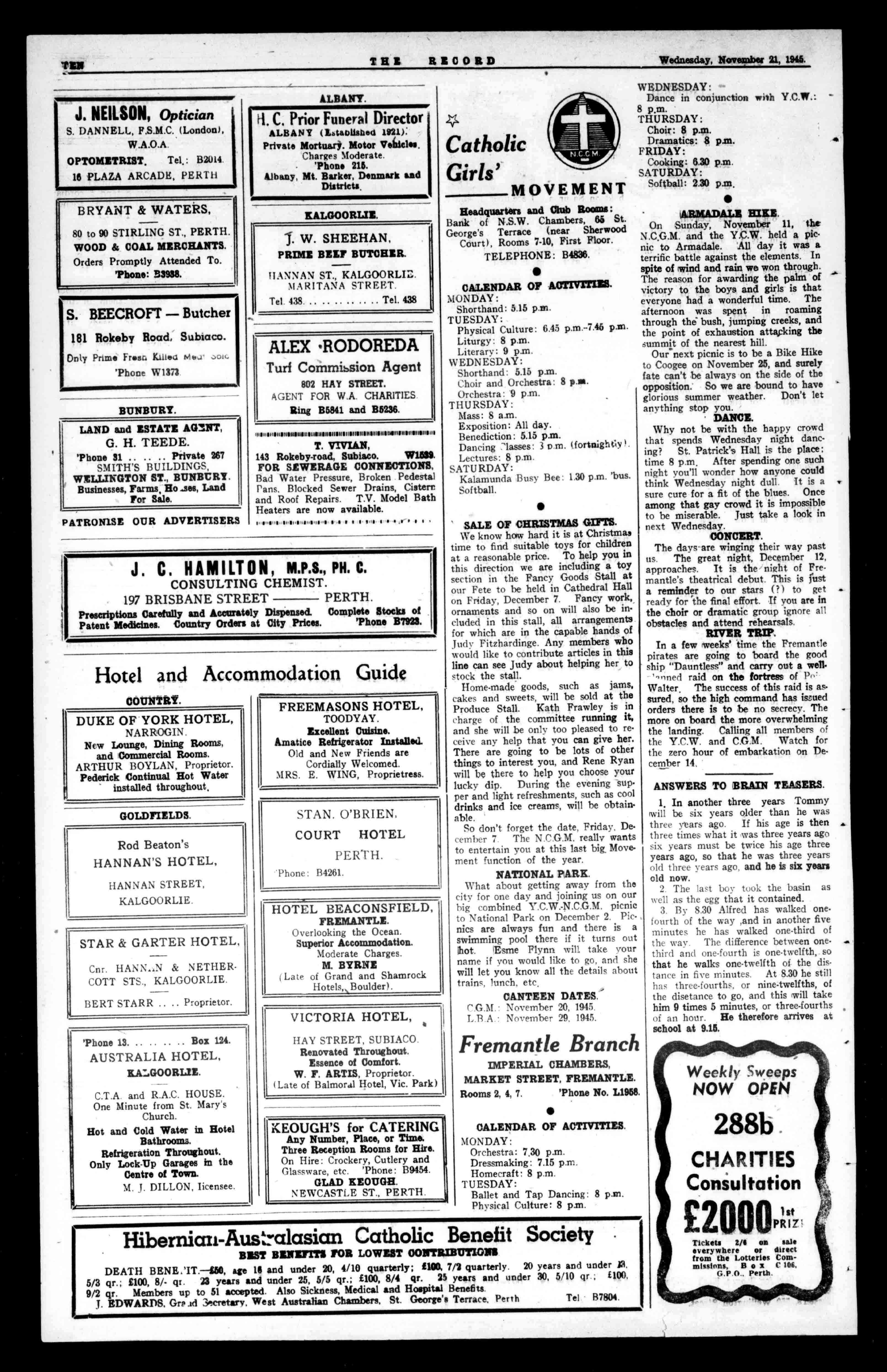 P.H.JAMES QUALITYBUTCHER,50HamptonRoad,Beaconsfield 'PHONEL2492. FORPRIMESTQUALITYNUM. YOURRECOMMENDATIONAPPRECIATED. i PAINTINGFORPERROTT--PERROTTFORPAINTING. 'PHONE85548 10CAMELIAST.,NORTHPIRTIL D.C.PERROTT PAINTINGCONTRA(TOR CONTRACTORTOTHELEADINGCONVENTS,COLLEGES,AND SCHOOLS. LATEMICHAELO'DRA, Founder. P.J.McCABE M.P.S. (MayhewGoldMedalist) PharmaceuticalChemist PrescriptionsCarefullyandAccurately DispensedandDelivered. CompleteStocksofPatentMedicinealwaysonhand. Phone:B5442. -4EETHISMODERNPHARN1AiA FORYOURSELF. CORNEROFHAYAND IRWINSTS.,PERTH JOSEPHO'DEA, Principal. Bowra&O'Dea FuneralDirectors 195PierStreet.Perth PricestoSuitAllClasses HIBERNIANMORTUARYBENEFITSAVAILABLE TOALLMEMBERS Tel:Business,B4308 Private,B6717-B3376