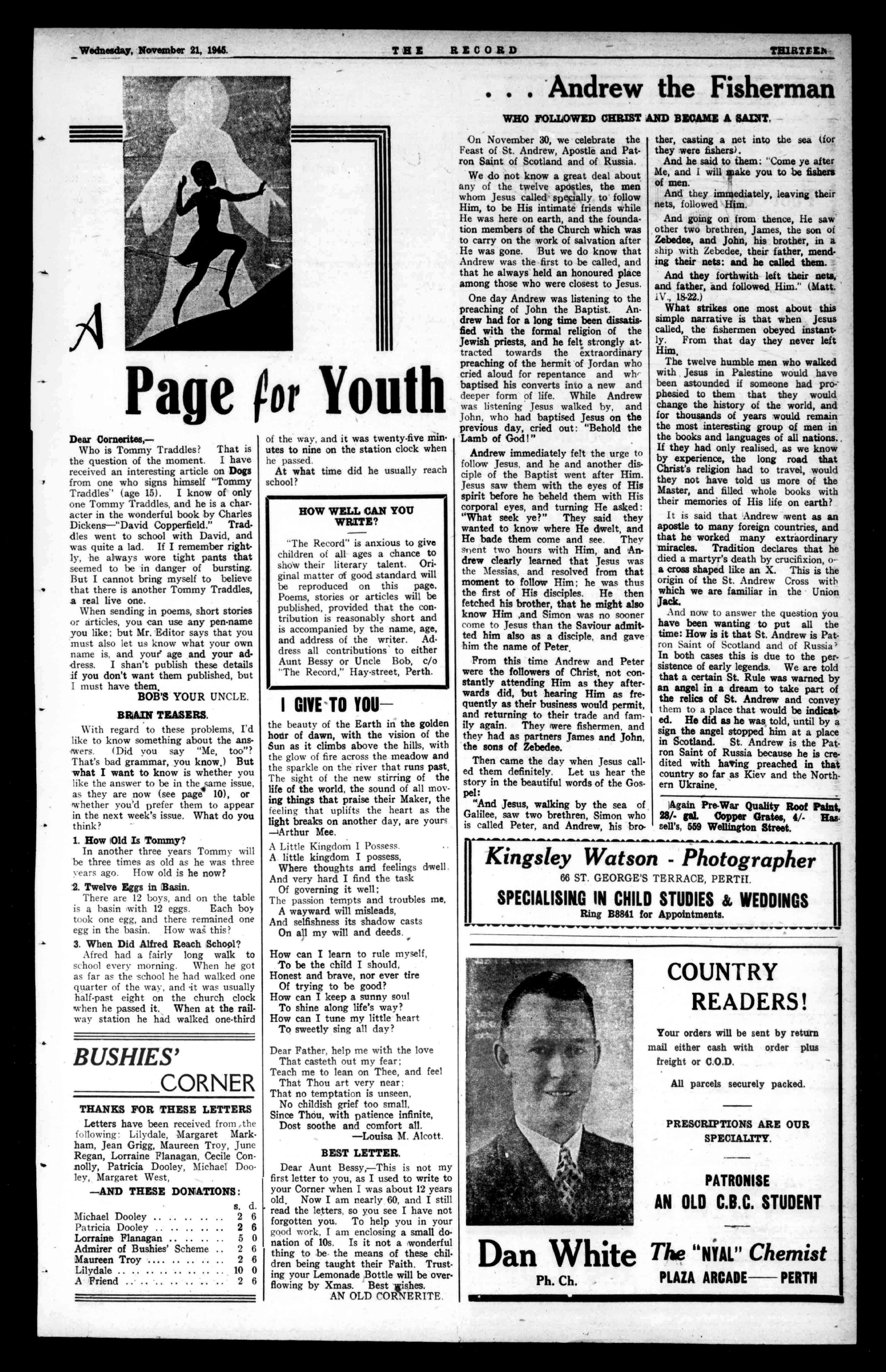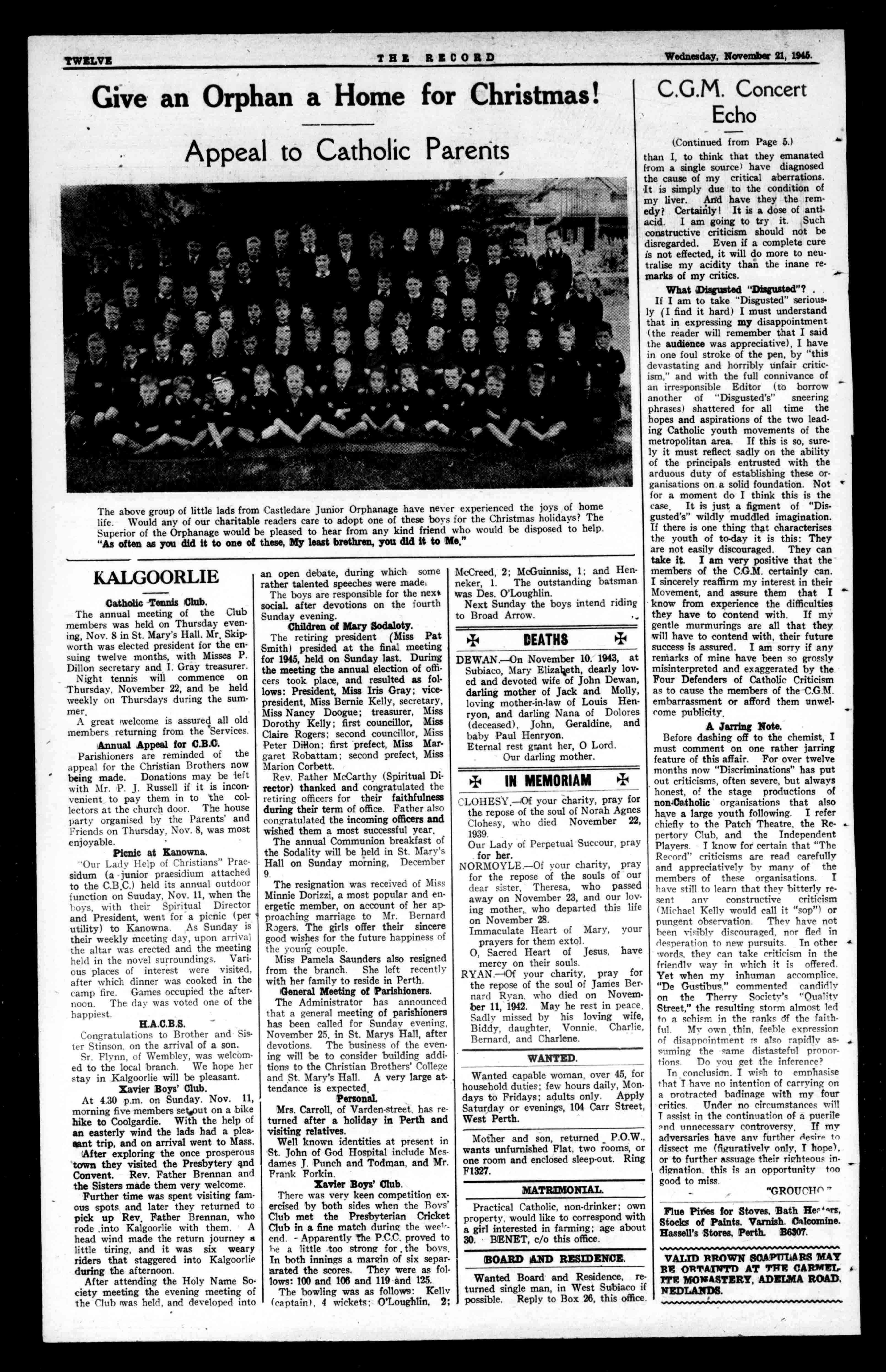 ASisterofMercy,nowteachingin thesuburbs,formanyyearssupervised theReligiousCorrespondencecourses intheGoldfieldsarea.Shehasvivid memoriesoftheStarcevichchildren andrecalledTom'sfidelitytohisles 'one.HewasbaptisedbyFather -(nowChaplain)A.Langmead.and hadneverhadtheopportunityofat-