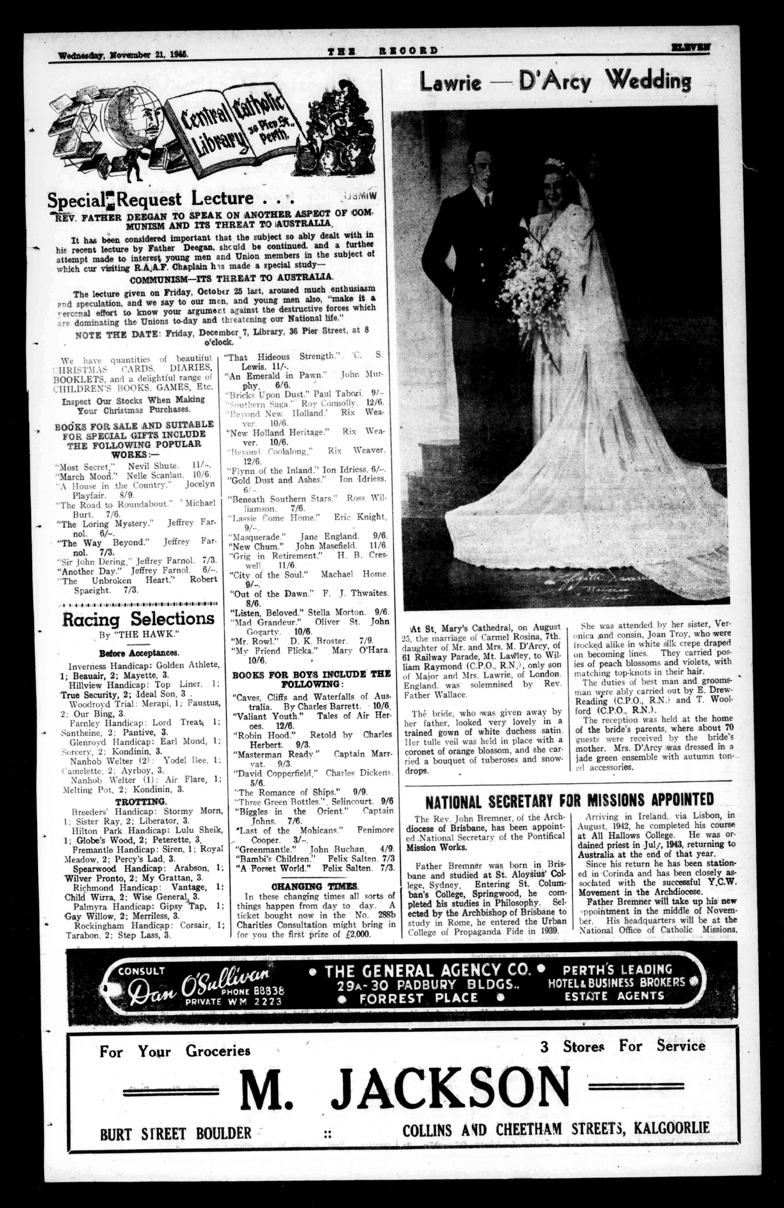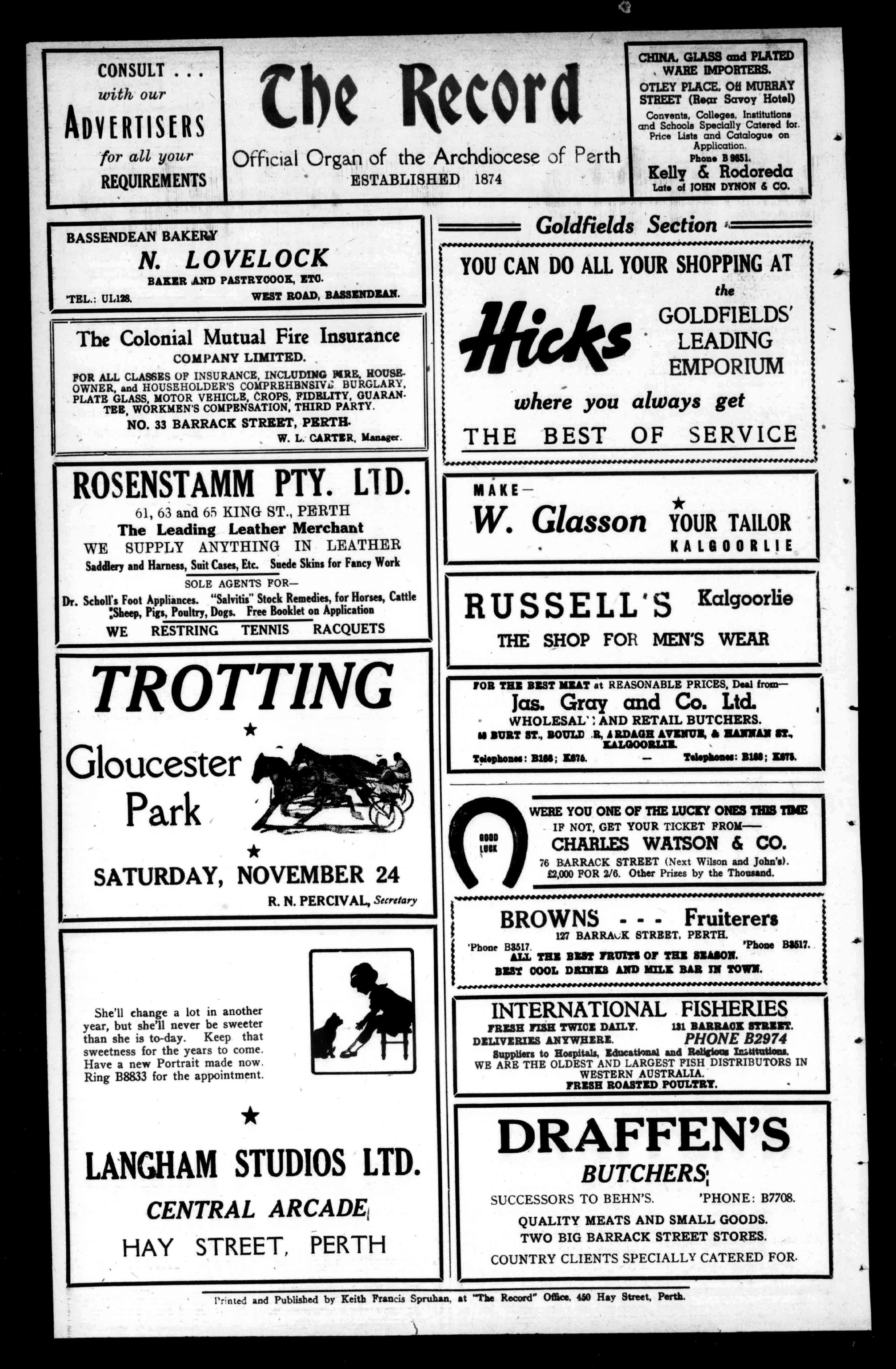 Q CONSULT withour ADVERTISERS forallyour REQUIREMENTS the'Record OfficialOrganoftheArchdioceseofPerth ESTABLISHED1874 CHINAGLASSandPLATED WAREIMPORTERS. OTLEYPLACE,OffMURRAY STREET(RearSavoyHotel) Convents,Colleges,Institutions andSchoolsSpeciallyCateredfor. PriceListsandCatalogueon Application. Phone1311651. Kelly&Rodoreda LateofJOHNDYNON6CO. BASSENDEAN LOVELOCK BAKERANDPASTRYDOOK,ETC. 'TEL.:UL128. WESTROAD,BASSENDEAN. TheColonialMutualFireInsurance COMPANYLIMITED. FORALLCLASSESOFINSURANCE,INCLUDINGFIRE,HOUSEOWNER,andHOUSEHOLDER'SCOMPREHBNSIVi;BURGLARY, PLATEGLASS,MOTORVEHICLE,CROPS,FIDELITY,GUARANTEE,WORKMEN'SCOMPENSATION,THIRDPARTY. NO.33BARRACKSTREET,PERTH. W.L.CARTER,Manager. ROSENSTAMMPTY.LTD. 61,63and6FKINGST.,PERTH TheLeadingLeatherMerchant WESUPPLYANYTHINGINLEATHER SaddleryandHarness,SuitCases,Etc.Suede